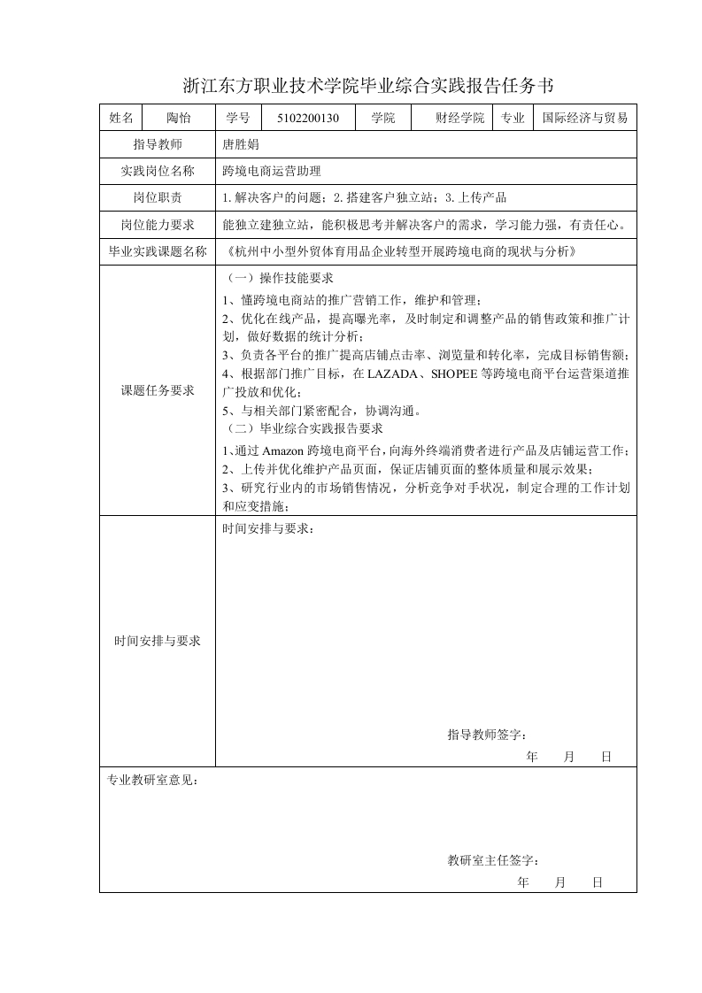 浙江东方职业技术学院毕业综合实践报告任务书姓名陶怡学号5102200130学院财经学院专业国际经济与贸易指导教师唐胜娟实践岗位名称跨境电商运营助理岗位职责1.解决客户的问题:2.搭建客户独立站:3.上传产品岗位能力要求能独立建独立站,能积极思考并解决客户的需求,学习能力强,有责任心。毕业实践课题名称《杭州中小型外贸体育用品企业转型开展跨境电商的现状与分析》(一)操作技能要求1、懂跨境电商站的推广营销工作,维护和管理:2、优化在线产品,提高曝光率,及时制定和调整产品的销售政策和推广计划,做好数据的统计分析:3、负责各平台的推广提高店铺点击率、浏览量和转化率,完成目标销售额:4、根据部门推广目标,在LAZADA、SHOPEE等跨境电商平台运营渠道推课题任务要求广投放和优化:5、与相关部门紧密配合,协调沟通。(二)毕业综合实践报告要求1、通过Ama2on跨境电商平台,向海外终端消费者进行产品及店铺运营工作:2、上传并优化维护产品页面,保证店铺页面的整体质量和展示效果:3、研究行业内的市场销售情况,分析竞争对手状况,制定合理的工作计划和应变措施:时间安排与要求:时间安排与要求指导教师签字:年月日专业教研室意见:教研室主任签字:年月日