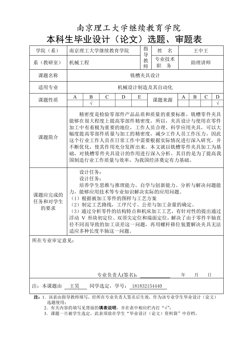 南京理工大学继续教育学院本科生毕业设计(论文)选题、审题表学院(系)南京理工大学继续教育学院指姓名王中王教专业技术系(教研室)机械工程职务助理讲师课题名称铣槽夹具设计适用专业机械设计制造及其自动化ABDEB课题性质课题来源精密度是检验零部件产品品质和质量的重要标准,铣槽零件夹具能够在很大程度上提高零部件精密度,所以,夹具设计与使用在零件加工中有着极为重要的地位,工作人员合理、科学应用夹具,可以大课题简介幅度提高零部件质量与加工的精密度,减少工作人员工作压力,因此这个行业工作人员在日常工作中需要根据实际情况进行深入研究,并不断优化,使其作用充分发挥出来。本文就以铣槽零件夹具加工为基础,对铣槽零件夹具设计的作用进行深入分析,其目的是为了提高我国制造行业工作质量与效率,为我国经济奠定有力基础。设计任务:设计任务:培养学生思维与推理能力、自学与创新能力、分析与解决问题能课题应完成的力,能够应用技术等专业知识解决实际的应用问题。任务和对学生(1)根据被加工零件的图样与工艺方案的要求(2)制定工艺路线,工序尺寸、公差与加工余量的确定。(3)通过分析零件的结构特点和机床加工工艺,有针对性的提出通过浮动V形块初定位、双顶尖定位和端面定位,解决了由于零件半轴直径不同而导致的加工误差这一问题,再用螺杆移位装置解决夹具无法适应多种长度半轴这一问题。所在专业审定意见:专业负责人(签名):年月日注:本课题由同学选定,学号:181832154440注:1.该表由指导教师填写,经所在专业负责人签名后生效,作为该专业学生毕业设计(论文)选题使用:2.有关内容的填写见背面的填表说明,并在表中相应栏内打“√”:3.课题一旦被学生选定,此表须放在学生“毕业设计(论文)资料袋”中存档。填表说明1.该表的填写只针对1名学生做毕业设计(论文)时选择使用,如同一课题由2名及2名以上同学选择,应在申报课题的名称上加以区别(加副标题),并且在“设计(论文)要求”一栏中说明。2.“课题性质”一栏:B.工程技术研究:C.软件开发:D.研究论文或调研报告E.其它。3.“课题来源”一栏:A.自然(社会)科学基金与省(部)、市级以上科研课题:B.企、事业单位委托课题:C.校、院(系)级基金课题:D.自拟课题。4.“课题简介”一栏:主要指该课题的背景介绍、理论意义或实用价值。南京理工大学继续教育学院毕业设计(论文)任务书教学点:南京理工大学继续教育学院专业:机械工程学生姓名:学号:181832154440设计(论文)题目:铣槽夹具设计起迄日期:2021年7月1日~12月15日设计(论文)地点:南京理工大学苏州市吴中技师学院指导教师:王中王专业负责人:汤燕萍发任务书日期:2019年6月28日