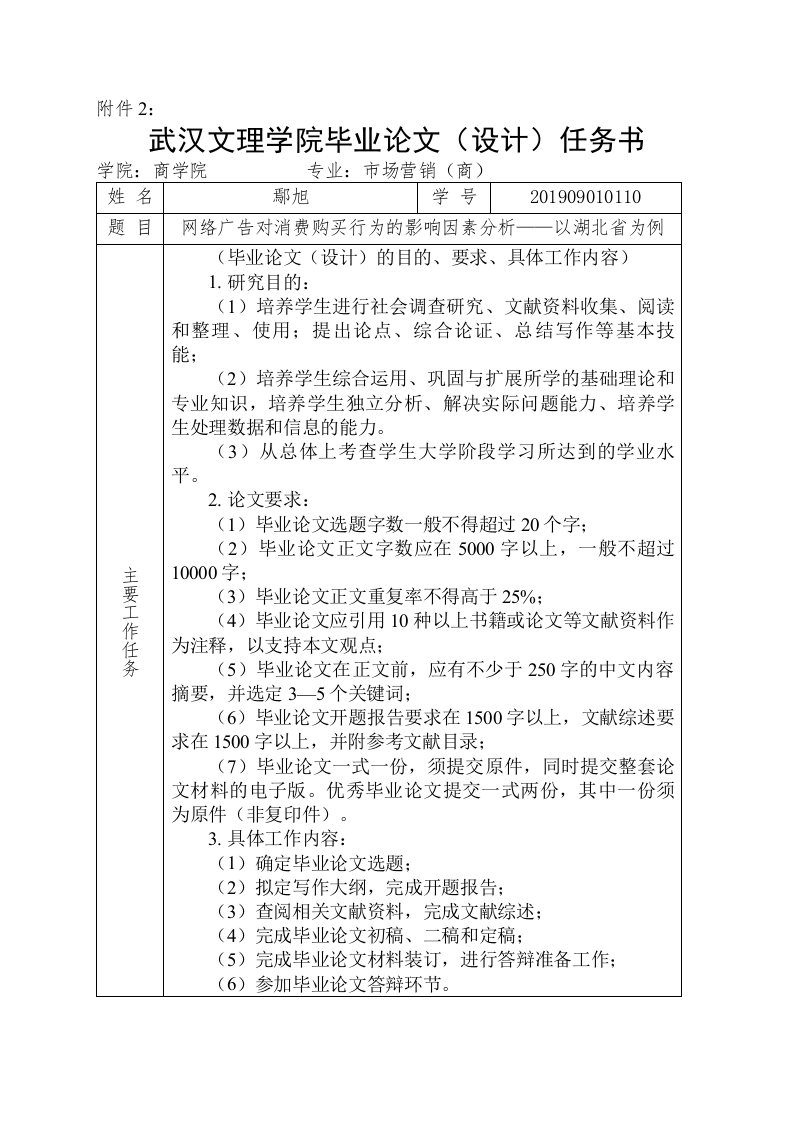 附件2:武汉文理学院毕业论文(设计)任务书学院:商学院专业:市场营销(商)姓名鄢旭学号201909010110题目网络广告对消费购买行为的影响因素分析以湖北省为例(毕业论文(设计)的目的、要求、具体工作内容)1.研究目的:(1)培养学生进行社会调查研究、文献资料收集、阅读和整理、使用;提出论点、综合论证、总结写作等基本技(2)培养学生综合运用、巩固与扩展所学的基础理论和专业知识,培养学生独立分析、解决实际问题能力、培养学生处理数据和信息的能力。(3)从总体上考查学生大学阶段学习所达到的学业水平。2.论文要求:(1)毕业论文选题字数一般不得超过20个字;(2)毕业论文正文字数应在5000字以上,一般不超过主要10000字;(3)毕业论文正文重复率不得高于25%:作(4)毕业论文应引用10种以上书籍或论文等文献资料作为注释,以支持本文观点:务(5)毕业论文在正文前,应有不少于250字的中文内容摘要,并选定3一5个关键词:(6)毕业论文开题报告要求在1500字以上,文献综述要求在1500字以上,并附参考文献目录:(7)毕业论文一式一份,须提交原件,同时提交整套论文材料的电子版。优秀毕业论文提交一式两份,其中一份须为原件(非复印件)。3.具体工作内容:(1)确定毕业论文选题;(2)拟定写作大纲,完成开题报告:(3)查阅相关文献资料,完成文献综述:(4)完成毕业论文初稿、二稿和定稿:(5)完成毕业论文材料装订,进行答辩准备工作;(6)参加毕业论文答辩环节。2021年10月15日至11月11日:确定毕业论文选题;2021年10月12日至11月25日:下达毕业论文写作任务2022年11月26日至12月25日:完成开题报告和文献综2022年12月26日至2023年03月01日:完成毕业论文初度安排2023年03月02日至04月01日:修订毕业论文初稿,完成二次修改稿;2023年04月02日至04月25日:完成论文定稿,装订论文材料,准备答辩;2023年04月26日至05月09日:参加毕业论文答辩。1、营销管理(第13版),菲利浦·科特勒,格致出版社,2009-112、人性的弱点,戴尔卡耐基,中国华侨出版社,2013-43、定位,艾·里斯、特劳特,机械工业出版社,2010-124、世界最伟大的推销员,奥格·曼狄诺,世界知识出版社,2002-85、营销战,艾·里斯、特劳特,中国财经出版社,2002-86、执行,拉姆·查兰,机械工业出版社,2016-127、奥美的观点,奥美公司,中信出版社,2013-108、营销圣经,陈声柏,中国友谊出版公司,2009-7主要参考资料见审核意指导教师(签字):注:1.指导教师应填好此任务书,经学院审核签字后,正式给学生下达任务。2.本页不够可另附。