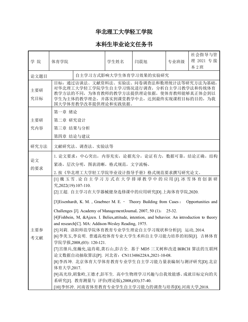 华北理工大学轻工学院本科生毕业论文任务书社会指导与管学院体育学院学生姓名闫晨旭专业班级理2021专接本2班论文题目自主学习方式影响大学生体育学习效果的实验研究目标:通过访淡法、文献资料法、实验法、问卷调查法和数理统计法等研究方法为基础,主要研对华北理工大学轻工学院学生自主学习情况进行调查,分析自主学习教学法和传统体育教学方法的不同,为体育教师的教学方法提供理论依据,使体育教师能够真正体会到以究目标学生为主体的教学理念,并落实到课堂教学中去,达到最终实现课程目标的目的,为我国大学体育教学改革提供理论和实践依据。第一章绪论主要研第二章研究设计究内容第三章结果与分析第四章结论与建议研究方法文献研究法、调查法、实验法等1.论文要求:中心突出,内容充实,论据充分,论证有力,数据可靠,结论正确,结构论文紧凑,层次分明,图表清晰,格式规范,文字流畅。的要求2.按《华北理工大学轻工学院毕业设计指导手册》格式规范要求撰写研究论文。[]魏玉雪.论自主学习方式在大学排球教学中的应用凹.冰雪体育创新研究,2022(19:107-110.[2]王超.自主学习在大学器械健身选修课中的应用研究D).上海体育学院,2020.[3]Eisenhardt,K.M.,Graebner M.E.Theory Building from Cases:Opportunities andChallenges [J].Academy of ManagementJoumaL 2007,50(1):25-32.[4]Fishbein,M,&Ajzen.I.Belies,attitude,intention,and behavior.An introduction to theoryand research[C].MA:Addison-Wesley Reading,1975.主要参[5)刘莉.洛阳师范学院体育教育专业学生理论自主学习现状和分析.运动,2014.考文献[6)]李美玉,李良明.普通高校体育专业大学生术科自主学习能力培养的初探).吉林体育学院学报,2008,(03):120-121[)宫继兵,张瀚允,寇肖萌,龚石山,彭吉全.基于MD5三叉树和改进BIRCH算法的互联网论文数据自动抽取算法P].河北省:CN113486228A,2021-10-08.[8]李西坤.北京体育大学体育教育专业学生自主学习能力量表编制与测评研究D]北京体育大学,2017.[9]高光珍,胡象岭,王德才,彭军生.高中生物理学习兴趣与自我效能感、成就目标定向的关系研究.教育测量与评价(理论版),2008,(03):37-40.[10]李怀冲.河南省体育教育专业学生自主学习能力的调查与培养D].河南大学,2018.起止时间指导教师签字:年月日系主任意见签字:年月日院长意见签字:年月日