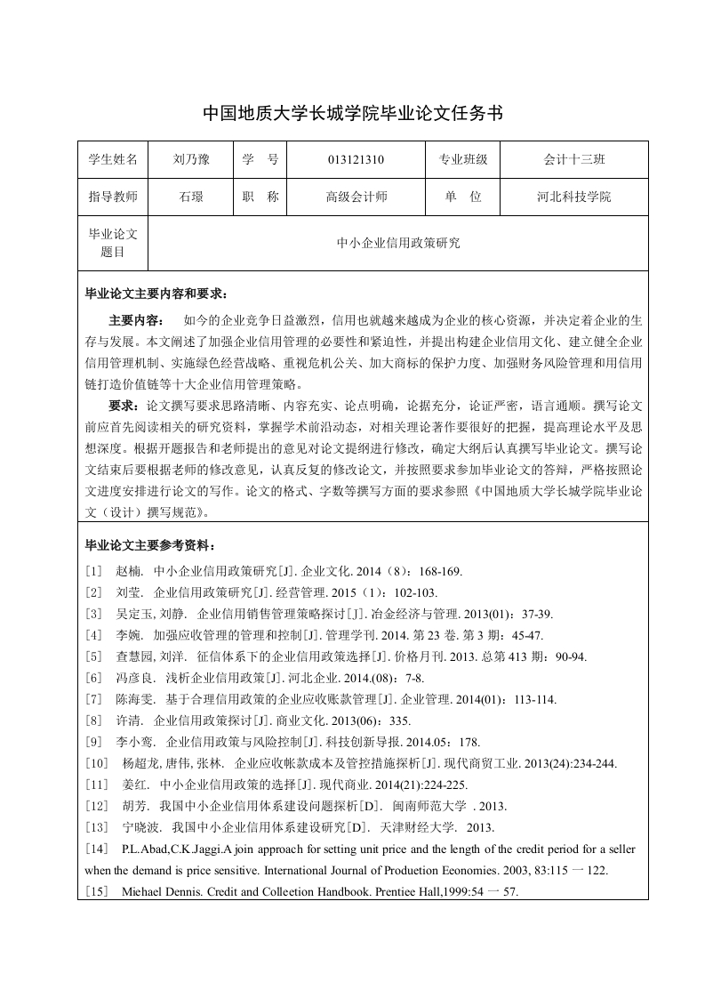 中国地质大学长城学院毕业论文任务书学生姓名刘乃豫学013121310专业班级会计十三班指导教师石璟职称高级会计师单位河北科技学院毕业论文题目中小企业信用政策研究毕业论文主要内容和要求:主要内容:如今的企业竞争日益激烈,信用也就越来越成为企业的核心资源,并决定着企业的生存与发展。本文阐述了加强企业信用管理的必要性和紧迫性,并提出构建企业信用文化、建立健全企业信用管理机制、实施绿色经营战略、重视危机公关、加大商标的保护力度、加强财务风险管理和用信用链打造价值链等十大企业信用管理策略。要求:论文撰写要求思路清晰、内容充实、论点明确,论据充分,论证严密,语言通顺。撰写论文前应首先阅读相关的研究资料,掌握学术前沿动态,对相关理论著作要很好的把握,提高理论水平及思想深度。根据开题报告和老师提出的意见对论文提纲进行修改,确定大纲后认真撰写毕业论文。撰写论文结束后要根据老师的修改意见,认真反复的修改论文,并按照要求参加毕业论文的答辩,严格按照论文进度安排进行论文的写作。论文的格式、字数等撰写方面的要求参照《中国地质大学长城学院毕业论文(设计)撰写规范》。毕业论文主要参考资料:[1]赵楠.中小企业信用政策研究[刀.企业文化.2014(8):168-169.[2]刘莹.企业信用政策研究[刀.经营管理.2015(1):102-103.[3】吴定玉,刘静.企业信用销售管理策略探讨[J刀.治金经济与管理.201301):37-39[4]李婉.加强应收管理的管理和控制[刀.管理学刊.2014.第23卷.第3期:4547.[5]查慧园,刘洋.征信体系下的企业信用政策选择[刀.价格月刊.2013.总第413期:90-94.[6]冯彦良.浅析企业信用政策[J刀.河北企业.2014.(08):7-8.[7]陈海雯.基于合理信用政策的企业应收账款管理[刀.企业管理.2014(01):113-114.[8]许清.企业信用政策探讨[刀.商业文化.201306):335.[9]李小鸾.企业信用政策与风险控制[).科技创新导报.2014.05:178.[10]杨超龙,唐伟,张林.企业应收帐款成本及管控措施探析[刀.现代商贸工业.201324):234-244.[11]姜红.中小企业信用政策的选择[刀.现代商业.2014(21):224-225.[12]胡芳.我国中小企业信用体系建设问题探析[D].闽南师范大学.2013.[13]宁晓波.我国中小企业信用体系建设研究[D].天津财经大学.2013.[14]P.L.Abad,C.K Jaggi.A join approach for setting unit price and the length of the credit period for a sellerwhen the demand is price sensitive.International Journal of Produetion Eeonomies.2003,83:115-122.[15]Miehael Dennis.Credit and Colleetion Handbook.Prentiee Hall,1999:54-57.毕业论文应完成的主要工作:1.利用中国知网、维普、万方等数据库完成与毕业论文相关内容的论文的检索:利用图书馆的图书资源查阅相关的理论内容:充分的利用互联网进行资料的检索收集。2.与实习相关的选题要注意在实习过程中观察收集相关的数据:要做实证方面的论文要多方面搜集相关的地区及国家发布的统计数据。3.认真撰写开题报告,并对开题报告中指导教师所提出的意见进行修改。4.认真撰写论文,并根据指导教师的意见进行修改。5.论文定稿之后,按照要求进行毕业论文的答辩。毕业论文进度安排:序号毕业论文各阶段内容时间安排备注确定毕业论文的选题,收集资料,整理资料,2015-10-15至2015-10-31完成论文的任务书2编写论文提纲,撰写开题报告,进行开题。2015-11-1至2015-11-203实习期间进行一步查找资料,作社会调查。2015-11-21至2015-11-30撰写论文,完成第一稿,并交指导教师2015-12-1至2016-1-15指导教师阅改论文。2016-1-16至2016-1-316修改论文,完成第2稿,并交指导教师。2016-2-1至2016-2-29指导教师阅改论文,完成中期检查表。2016-3-1至2016-3-158修改论文,完成第3稿,并交指导教师。2016-3-16至20164-10指导教师阅改论文,并返还学生,修改后立即20164-11至20164-30交指导教师。10专家评阅。2016-5-1至2016-5-1011毕业论文答辩。2016-5-11至2016-5-2412评定学生最终论文成绩,评出院内优秀论文。2016-5-25至2016-5-31课题信息:课题性质:设计口论文√课题来源:教学√科研口生产口其它口发出任务书日期:指导教师签名:2015年10月31日散研室意见:教研室主任签名:年月学生签名: