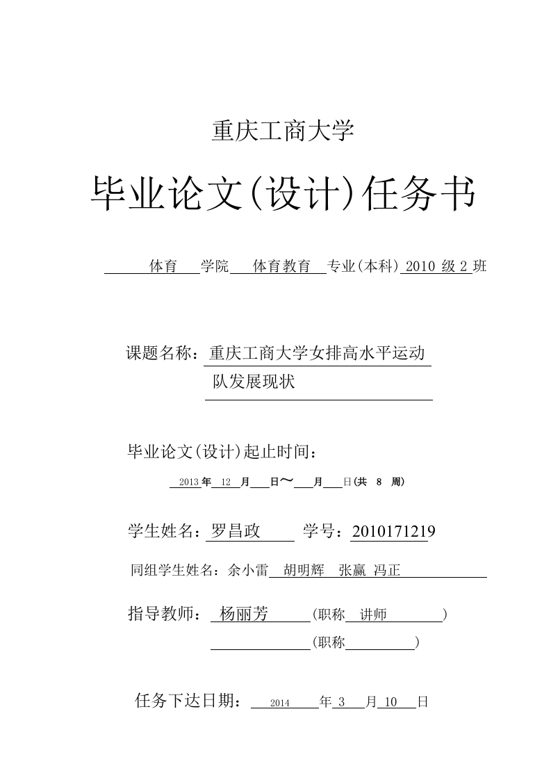 重庆工商大学毕业论文(设计)任务书体育学院体育教育专业(本科)2010级2班课题名称:重庆工商大学女排高水平运动队发展现状毕业论文(设计)起止时间:学生姓名:罗昌政学号:2010171219同组学生姓名:余小雷胡明辉张赢冯正指导教师:杨丽芳(职称讲师(职称任务下达日期:2014年3月10日重庆工商大学毕业论文(设计)任务书1.本课题是重庆工商大学女排高水平运动队近五年发展现状综述就目前收集到的相关文献资斜来看,重夫工商大学女排高水平运动队是国家教育部布点的“培养高水平运动员排球项目试点单位”,。有常年坚持训练的各类运动代表队,在重庆市和全国各种比赛中均取得优异成绩。如,沙滩排球多次获得全国各组别冠军,女排获得重庆市排球比赛“十八连冠”,多次在中国大学生排球联赛中进入“八强”,代表重庆市参加第六、七、八届全国大学生运动会排球比赛,成为西部唯一跻身决赛的女排队伍。总体看来,重庆工商大学女排高水平运动队的组建、管理、训练、发展等方面都进行了深对。大致可以分为以下五大类:收集重夫工商大学女排高水平运动队的相关资料科二、查阅与分析组建、管理办法、比赛成绩方面内容三、了解教练员运动员水平及日常训川练方面内容四、访问教练员及运动员并观摩训川练五、对女非高水平运动队比赛成绩做出分析价值并作出研究课题任务的具体要求主要参考文献(指导教师选定部分)指导教师(签字)日期年月日学生(签字)日期年月日注:此任务书由指导教师填写,指导教师和接受任务的学生均应签字。重庆工商大学毕业论文(设计)开题报告