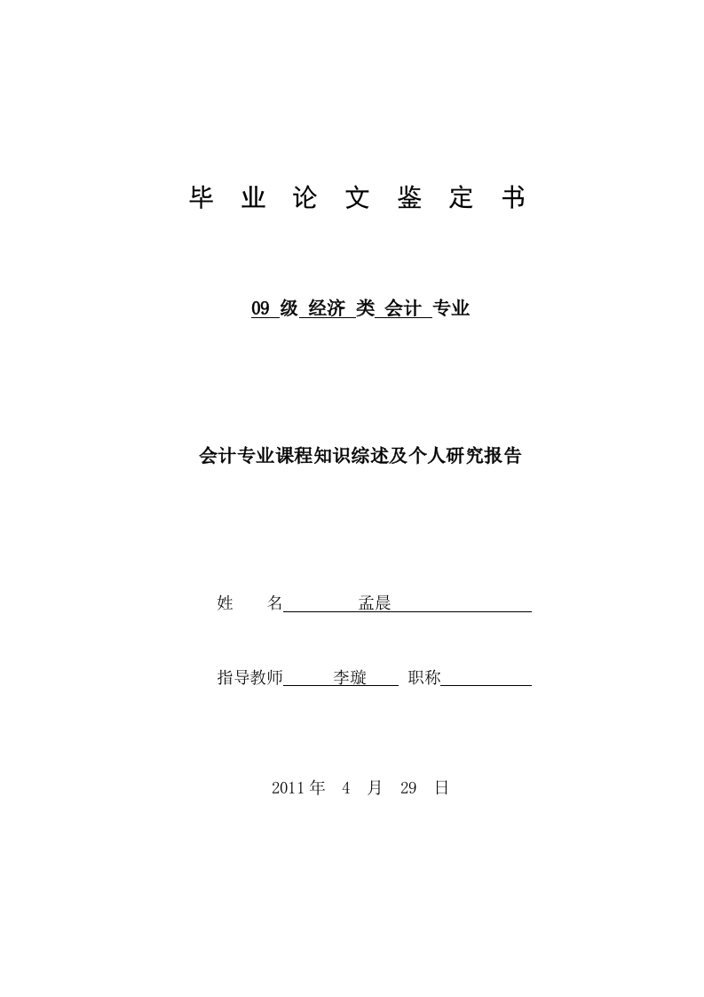 毕业论文鉴定书09级经济类会计专业会计专业课程知识综述及个人研究报告姓名孟晨指导教师李璇职称2011年4月29日会计专业课程核心知识综述及个人应用问题研究报告摘要:会计是一个信息系统,对信息进行加工、储存并向外输送对报表使用者有用的信息。会计核算的内容是企业各项经济交易和经济事项,所以会计核算本质上是对各项经济交易和经济事项计量、确认、记录和报告的过程。关键词:会计要素标准建立确认标准一、财务会计课程核心知识综述会计要素又称为会计对象要素,是会计理论研究的重要内容。会计要素定义是否科学合理,直接影响会计目标的实现和会计方法的建立与运用。科学合理的会计要素体系对于完善企业会计准则、实现会计目标以及为信息使用者提供有用的会计信息具有重要意义。会计要素,国际会计准则委员会在《关于编制和提供财务报表的框架》中称之为财务报表的要素,并指出“财务报表描绘交易和其他事项的财务影响,是根据交易和其他事项的经济特性,把他们分成大类,这些要素在资产负债表和利润表的列示,是一个进一步分类的过程”。[]在会计核算过程中,会计确认决定了各项经济交易和经济事项“是否”、“何时”、“怎样”进入会计核算系统。六大会计要素有不同的具体确认标准。企业应当按照规定的会计计量属性进行计量,确定相关金额。企业在对会计要素进行计量时,一般应当采用历史成本。[2]在某些情况下,为了提高会计信息质量,实现财务报告目标,企业会计准则允许采用重置成本、可变现净值、现值、公允价值计量,应当保证所确定的会计要素金额能够取得并可靠计量,如果这些金额无法取得或者可靠地计量的,则不允许采用其他计量属性。1.资产资产是指企业过去的交易或者事项形成的、由企业拥有或者控制的、预期会给企业带来经济利益的资源。按照流动性对资产进行分类,可以分为流动资产和非流动资产。流动资产是指可以在一年或超过一年的一个营业周期内变现或者耗用的资产,主要包括货币资金、交易性金融资产、应收和预付款项、存货等。除流动资产以外的其他资产,都属于非流动资产,包括长期股权投资、固定资产、无形资产和其他资产等。特征:①资产能够直接或间接地给企业带来经济利益。②资产是为企业所拥有的,或者即使不为企业所拥有也是企业所控制的。1③资产是由过去的交易或事项形成的(而不能是预期的资产)2.负债负债是指企业过去的交易或者事项形成的、预期会导致经济利益流出企业的现时义务。现时义务是指企业在现行条件下已承担的义务。未来发生的交易或者事项形成的义务,不属于现时义务,不应当确认为负债。负债按偿还期限长短通常可分为:流动负债和长期负债(1)流动负债是指偿还期限在一年以内或超过一年的一个营业周期以内的债务,包括:短期借款、应付票据、应付账款及预收账款、应付职工薪酬、应付股利、应交税费、其他应付款、一年内到期的长期负债和其他流动负债等。特征:①负债的清偿预期会导致经济利益流出企业。②负债是由过去的交易或事项形成的,导致负债的交易或事项必须已经发生或能够可靠计量。负债按流动性分类,可分为流动负债和非流动负债。非流动负债是指偿还期在1年以上或者超过1年的一个营业周期以上的负债优点:一是可以保持企业原有的股权结构不变和股票价格稳定.二是不影响原有股东对企业的控制权三是举借可以增加股东的收益四是非流动复债支付的利息具有抵税功能不利影响:一是举借非流动负债可能带来股东收益的减少二是举借非流动负债必须按规定到期偿还三是举借非流动负债可能会给企业带来较大的财务风险.3.所有者权益所有者权益是指企业资产扣除负债后由所有者享有的剩余权益。即一个会计主体在一定时期所拥有或可控制的具有未来经济利益的资源的净额。又称为股东权益。所有者权益金额取决于资产和负债的计量。所有者权益项目应当列入资产负债表。企业的所有者和债权人均是企业资金的提供者,因而所有者权益和负债(债权人权益)二者均是对企业资产的要求权,但二者之间又存在着明显的区别。2