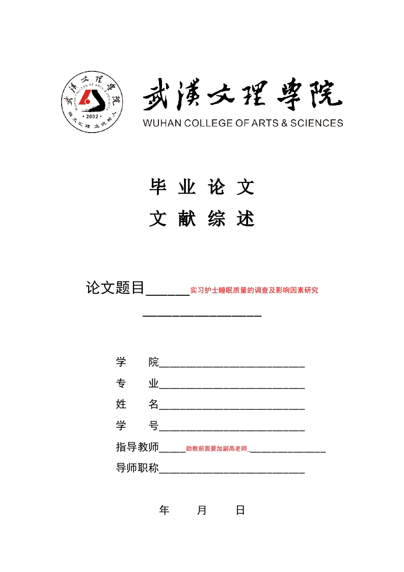 WUHAN COLLEGE OF ARTS SCIENCES毕业论文文献综述论文题目实习护士睡眠质量的调查及影响因素研究学院专业姓名学号指导教师助教前面要加副高老师导师职称年月日实习护士睡眠质量的调查及影响因素研究文献综述1引言护士的身心健康是医院护理服务质量的重要保证。只有护士自身健康状况达到一个良好的水平,才能更好地承担起其角色功能,为人们提供高质量的健康服务。实习护士也是我国医疗卫生系统的重要组成部分,良好的睡眠质量是实习护士开始护士工作的基础保障。因此,研究实习护士睡眠质量,探讨其影响因素,并提出相应干预措施,对现代医院管理工作有着极其重要的意义。2正文2.1实习护士睡眠质量现状盛嘉伟等采用匹兹堡睡眠质量指数量表对护士睡眠情况进行调查,结果显示:护士的PSQI总分高于国内常模。李青青等采用睡眠状况自评表(SRSS)调查结果显示:护士睡眠因子总分与7项或9项因子分高于常模,护士睡眠障碍的比例在调查对象中均占60%以上,中度睡眠问题发生率显著高于常模。褚欣悦对574名综合医院护士进行生活质量评定中也发现护士的睡眠与休息低于常模。失眠症是一种最常见的睡眠障碍。赵利梅等调查结果也显示一线护士的失眠症患病率相对较高,分别为27.3%、51.0%。由此可见,护士的睡眠问题比较突出,应引起足够的重视。肖蓉娟等人对广州市某医院实习护士睡眠质量调查显示,33.5%的实习护士存在睡眠障碍同。陶花、华亚芳等人对三级甲等医院医护人员睡眠质量调查显示,医生睡眠障碍发生率为45.77%,护士睡眠障碍发生率为70.88%6。马玲等人对急诊科护士工作应激与睡眠质量关系调查显示,急诊科护士PSQI总分为6.95士2.71,高于其他科护士,除了药物催眠,其他各项睡眠质量成分比较均有统计学差异,初级职称的医护人员较高级职称医护人睡眠质量差。钟雅稚等人对上海市三级甲等医院护士睡眠质量研究显示,57.4%的护士存在不同程度的睡眠质量问题,监护室的护士睡眠问题发生率最高⑧。张传翠对影响护士睡眠质量因素调查研究显示,28.42%的护士存在睡眠质量问题9。2.2实习护士睡眠质量影响因素睡眠问题可使护士出现一系列的身心症状,如头痛、胃肠不适、困倦、易疲劳、易激惹、负性情绪增加、神经衰弱、社交活动减少、自我评价降低等,有时可导致家庭问题或发生交通意外。护士身心问题又可能导致组织成员间沟通不良,矛盾或冲突增加,组织工作绩效下降,护士工作满意度低,护士缺勤,更换工作,离开工作岗位等,从而影响了整个护理团体的形象及护理工作的协调性、计划性。同时,睡眠不足,护士有可能出现注意力和警觉水平降低,对病人病情变化的察觉与认识能力下降,护士发生错误、事故的机率增加。影响实习护士睡眠质量的因素主要有生理、心理及社会环境因素。生理因素如自主神经的高度警觉状态、下丘脑-垂体-肾上腺轴过度反应等都是睡眠问题的诱发因素©。有调查显示,不同性别实习护士睡眠质量有差别,且女生的睡眠质量低于男生。可能因女生较易多愁善感,易受外界环境影响,另外由于女生本身的生理原因,如经期的腹痛等相关症状,也妨碍睡眠。精神心理因素如沉思默想、忧虑等是睡眠问题的长期影响因素。而睡眠前状态如活跃的思考、忧虑、设想等均与失眠密切相关。国内研究者对207名医学生采用匹兹堡睡眠质量指数(PSQI)量表、焦虑自评量表(SAS)和抑郁自评量表(SDS)研究其与睡眠质量相关性表明,焦虑、抑郁得分与PSQI总分及各维度得分存在显著的相关性。匡玲等对国内两所高校的1200名学生进行调查,该研究显示睡眠障碍人群有情绪不稳定性、偏内向、掩饰性等人格倾向。社会因素如实习护士学业负担重,专业态度紧张,通常熬夜学习并更担心自己的学习及对成绩欠满意等。有研究称高达43.5%的实习护士压力感知水平较高,其睡眠受到学业压力的影响。其他影响因素还有作息不规律、人际关系、身体状况、宿舍环境、晚睡、深夜上网、负性生活事件及家庭关怀等。Azad MC等还认为其与所处职位相关,护士的睡眠质量影响最为普遍,而普通的工人影响较小。Giri PA等人的研究表明:睡前思维和睡眠时间的减少以及睡眠问题的增多有显著的关系。睡前思维涉及到对白天发生的应激事件的回忆和对其认知的过程,如果思考过度或者对应激事件有消极的评价,就会造成无法入睡或者睡眠质量降低。3结论总之,影响实习护士睡眠质量的因素主要有学习态度、生活方式、学业压力、