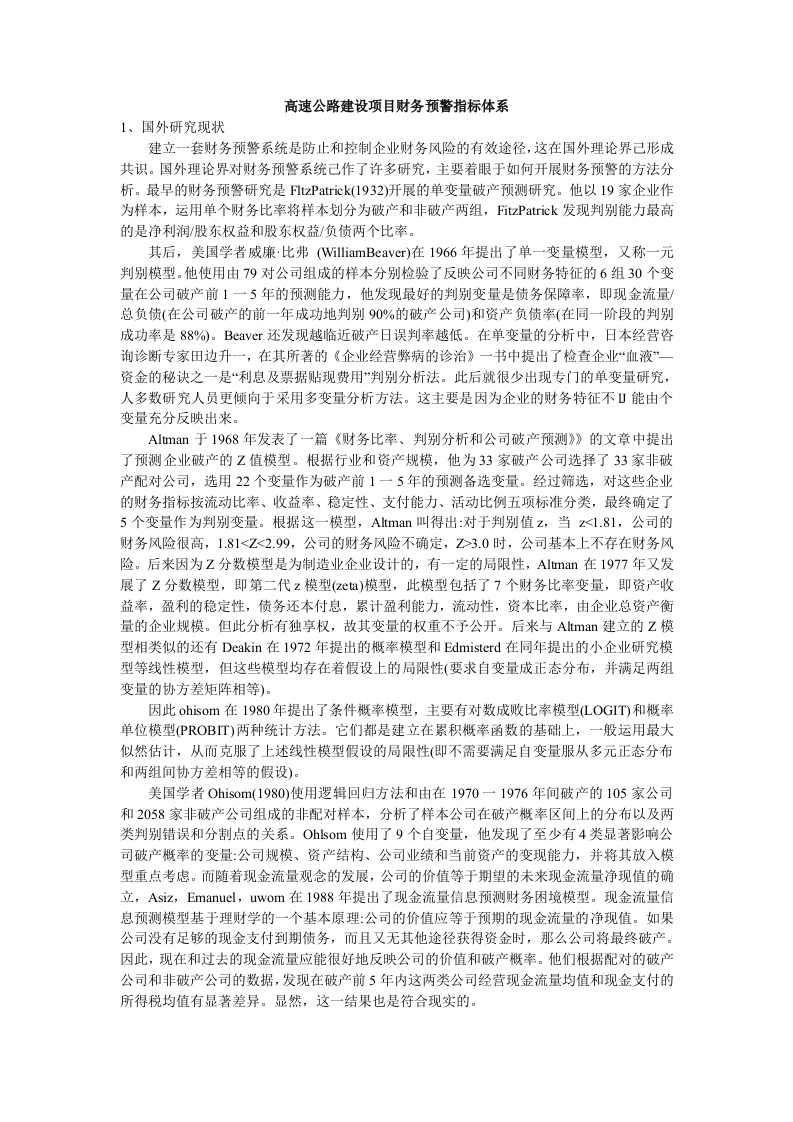 高速公路建设项目财务预警指标体系1、国外研究现状建立一套财务预警系统是防止和控制企业财务风险的有效途径,这在国外理论界己形成共识。国外理论界对财务预警系统己作了许多研究,主要着眼于如何开展财务预警的方法分析。最早的财务预警研究是FltzPatrick(1932)开展的单变量破产预测研究。他以19家企业作为样本,运用单个财务比率将样本划分为破产和非破产两组,FitzPatrick发现判别能力最高的是净利润/股东权益和股东权益/负债两个比率。其后,美国学者威廉·比弗(WilliamBeaver)在1966年提出了单一变量模型,又称一元判别模型.他使用由79对公司组成的样本分别检验了反映公司不同财务特征的6组30个变量在公司破产前1一5年的预测能力,他发现最好的判别变量是债务保障率,即现金流量/总负债(在公司破产的前一年成功地判别90%的破产公司)和资产负债率(在同一阶段的判别成功率是88%。Beaver还发现越临近破产日误判率越低。在单变量的分析中,日本经营咨询诊断专家田边升一,在其所著的《企业经营弊病的诊治》一书中提出了检查企业“血液”一资金的秘诀之一是“利息及票据贴现费用”判别分析法。此后就很少出现专门的单变量研究,人多数研究人员更倾向于采用多变量分析方法。这主要是因为企业的财务特征不山能由个变量充分反映出来。A1tman于1968年发表了一篇《财务比率、判别分析和公司破产预测》》的文章中提出了预测企业破产的Z值模型。根据行业和资产规模,他为33家破产公司选择了33家非破产配对公司,选用22个变量作为破产前1一5年的预测备选变量。经过筛选,对这些企业的财务指标按流动比率、收益率、稳定性、支付能力、活动比例五项标准分类,最终确定了5个变量作为判别变量。根据这一模型,Altman叫得出:对于判别值z,当z<1.81,公司的财务风险很高,1.813.0时,公司基本上不存在财务风险。后来因为Z分数模型是为制造业企业设计的,有一定的局限性,Altman在1977年又发展了Z分数模型,即第二代z模型(2心a)模型,此模型包括了7个财务比率变量,即资产收益率,盈利的稳定性,债务还本付息,累计盈利能力,流动性,资本比率,由企业总资产衡量的企业规模。但此分析有独享权,故其变量的权重不予公开。后来与Altman建立的Z模型相类似的还有Deakin在l972年提出的概率模型和Edmisterd在同年提出的小企业研究模型等线性模型,但这些模型均存在着假设上的局限性(要求自变量成正态分布,并满足两组变量的协方差矩阵相等)。因此ohisom在1980年提出了条件概率模型,主要有对数成败比率模型LOGIT)和概率单位模型PROBIT)两种统计方法。它们都是建立在累积概率函数的基础上,一般运用最大似然估计,从而克服了上述线性模型假设的局限性(即不需要满足自变量服从多元正态分布和两组间协方差相等的假设)。美国学者0 hisom(1980)使用逻辑回归方法和由在1970一1976年间破产的105家公司和2058家非破产公司组成的非配对样本,分析了样本公司在破产概率区间上的分布以及两类判别错误和分割点的关系。Ohlsom使用了9个自变量,他发现了至少有4类显著影响公司破产概率的变量:公司规模、资产结构、公司业绩和当前资产的变现能力,并将其放入模型重点考虑。而随着现金流量观念的发展,公司的价值等于期望的未来现金流量净现值的确立,Asiz,Emanuel,uwom在l988年提出了现金流量信息预测财务困境模型。现金流量信息预测模型基于理财学的一个基本原理:公司的价值应等于预期的现金流量的净现值。如果公司没有足够的现金支付到期债务,而且又无其他途径获得资金时,那么公司将最终破产。因此,现在和过去的现金流量应能很好地反映公司的价值和破产概率。他们根据配对的破产公司和非破产公司的数据,发现在破产前5年内这两类公司经营现金流量均值和现金支付的所得税均值有显著差异。显然,这一结果也是符合现实的。另外除了有定量预警分析方法,还有定性预警分析方法。美国的仁瀚·阿根蒂创造的管理评分法,就是根据管理评分的得分高低判断企业处境的好坏。同时随着统计技术和计算机技术的不断发展,功效系数法、递归分类、人工智能及人Ⅰ一神经元网络也逐渐被引入到财务失败预警研究中。西方企业和学者对财务预警系统的设计,就是在可能产生危机的警源上设置警情指标,随时对企业的运行状态进行监测,并用危机警度来预报危机的程度。其目的是对威胁企业生存、发展的重大战略问题进行事先预告与分析,或通过对己发生事件所得到的重要启示,提前或及时地把握危机信息,达到防患于未然的目的。在所有这些研究中,Beave;:作为早期单变量判定模型较为成熟的研究者,功不可没;Altman提出的多变量比率预测模型则进一步推动了财务预警研究的发展;而Asiz、Emanuel和uwom等提出的现金流量信息模型则丰富了财务预警研究的体系。2、国内研究现状在国内,近年来我国逐步开始了企业财务风险评估和预警的研究。吴世农、黄世忠(1986)曾介绍了企业破产的分析指标和预测模型;周首华等在1996年提出了F分数预测模型,他是以compustarPcPlus会计资料库中1990年以来的4160家公司为样本,通过调整和更新指标对Z分数模型进行了修正,也取得了一定的效果。陈静(1999)利用1995年的27家sT公司和27家非ST公司,使用了1995一1997年的财务报表数据,进行了单变量分析和二类线