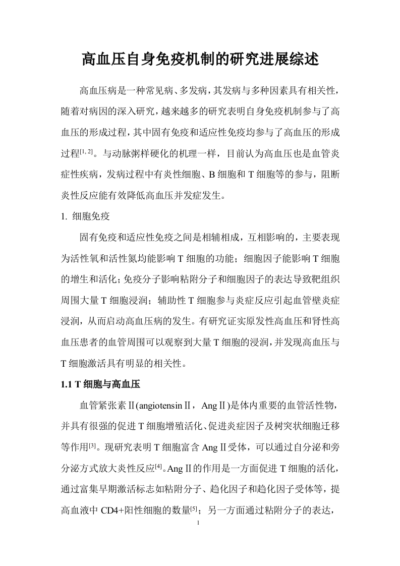 高血压自身免疫机制的研究进展综述高血压病是一种常见病、多发病,其发病与多种因素具有相关性,随着对病因的深入研究,越来越多的研究表明自身免疫机制参与了高血压的形成过程,其中固有免疫和适应性免疫均参与了高血压的形成过程,2。与动脉粥样硬化的机理一样,目前认为高血压也是血管炎症性疾病,发病过程中有炎性细胞、B细胞和T细胞等的参与,阻断炎性反应能有效降低高血压并发症发生。1.细胞免疫固有免疫和适应性免疫之间是相辅相成,互相影响的,主要表现为活性氧和活性氮均能影响T细胞的功能:细胞因子能影响T细胞的增生和活化:免疫分子影响粘附分子和细胞因子的表达导致靶组织周围大量T细胞浸润:辅助性T细胞参与炎症反应引起血管壁炎症浸润,从而启动高血压病的发生。有研究证实原发性高血压和肾性高血压患者的血管周围可以观察到大量T细胞的浸润,并发现高血压与T细胞激活具有明显的相关性。1.1T细胞与高血压血管紧张素II(angiotensin IⅡ,AngIⅡ)是体内重要的血管活性物,并具有很强的促进T细胞增殖活化、促进炎症因子及树突状细胞迁移等作用)。现研究表明T细胞富含AngIⅡ受体,可以通过自分泌和旁分泌方式放大炎性反应。AngIⅡ的作用是一方面促进T细胞的活化,通过富集早期激活标志如粘附分子、趋化因子和趋化因子受体等,提高血液中CD4+阳性细胞的数量];另一方面通过粘附分子的表达,促进组织中炎症细胞的浸润。其机理主要通过还原型辅酶Ⅱ途径产生活性氧,而活性氧可导致炎症细胞的局部浸润6。T细胞导致高血压的机制可能主要与下列因素有关:T细胞直接或者间接刺激其他细胞释放炎症因子或者招募大量细胞因子,血管发生炎性反应,逐步形成心肌纤维化和血管重构,导致机体高血压的形成,最终引起靶组织的损伤7,8)。T细胞中的Th1细胞主要产生干扰素-y(NF-y)、白细胞介素(L)-2、肿瘤坏死因子(TNF)-a和TNF-B,而Th2细胞产生L4、L-5、L-10和转化生长因子(TGF)-B9,1o。有研究发现AngIⅡ相关高血压的患者予以TNF-a拮抗剂治疗,可以明显降低高血压和血管功能障碍的发生率,对肾脏的损害作用也明显降低,故认为T1相关细胞因子对高血压具有重要的作用。另一项研究表明Th17细胞为除Th1和Th2细胞之外的重要细胞,其不仅抑制炎症反应,还可引起细胞因子和粘附分子的表达,是促进炎症因子在局部组织中的浸润,参与高血压形成的重要因子山四。1.2调节性T细胞与高血压调节性T细胞(regulatory T cell,Treg)是具有免疫抑制作用的T细胞亚群,主要以CD4+CD25+Teg为主,对维持免疫耐受和免疫稳态具有重要作用2。Treg具有两大功能:免疫无能性和免疫抑制性,其具有特征性的转录因子FoxP3,对其显性和功能具有控制作用。Teg除了对T细胞具有调节作用,对树突状细胞和巨噬细胞具有明显的抑制作用。Treg对免疫抑制作用主要表现为以下几个方面:①对树突状细胞的成熟和功能具有明显的抑制作用,主要通过下调CD80和2CD86等刺激因子的表达来实现:②通过产生L-10和TGF-B等抑制性细胞因子;③对其他免疫细胞的杀伤作用,主要与颗粒酶-B和穿孔素等有关3-16。Treg对AngIⅡ相关高血压具有明显的抑制作用,抑制心肌纤维化和心肌肥大,减轻心肌炎性反应,说明Trg对心脏的保护作用独立于血压的调节,为免疫调节治疗高血压奠定了理论基础。2.体液免疫体液免疫主要由B细胞参与,合成免疫球蛋白(immunoglobulin,g),有研究证实高血压患者的IgG和IgM含量明显升高并与血压水平呈正相关,而补体C3明显降低,与血压水平呈负相关。其机理可能是高血压患者的T细胞功能减退和CD8+数量的明显下降,对B细胞发生明显的抑制作用,使B细胞产生的IgG等出现明显改变,导致机体抗原抗体复合物的形成,造成补体的激活,引起血管内皮细胞的损伤8)。此外大颗粒淋巴细胞有明显的免疫调节作用,当大颗粒淋巴细胞数量减少或功能低下时,对CD8+T细胞和B细胞的抑制功能减弱,使B细胞功能亢进,形成大量自身抗体,从而引起自身免疫损伤鬥。体液免疫在高血压形成过程中主要表现为新生的抗原如氧化修饰的蛋白、核酸等的暴露,诱导细胞死亡释放细胞内抗原等,其中具有重要作用的是热休克蛋白(HSP)20),其在免疫反应中转运抗原肽,形成抗原抗体复合物,并刺激T细胞形成。越来越多的研究表明高血压与自身抗体的形成和水平有关。有研究表明恶性高血压和难治性高血压患者的抗G蛋白偶联受体水平