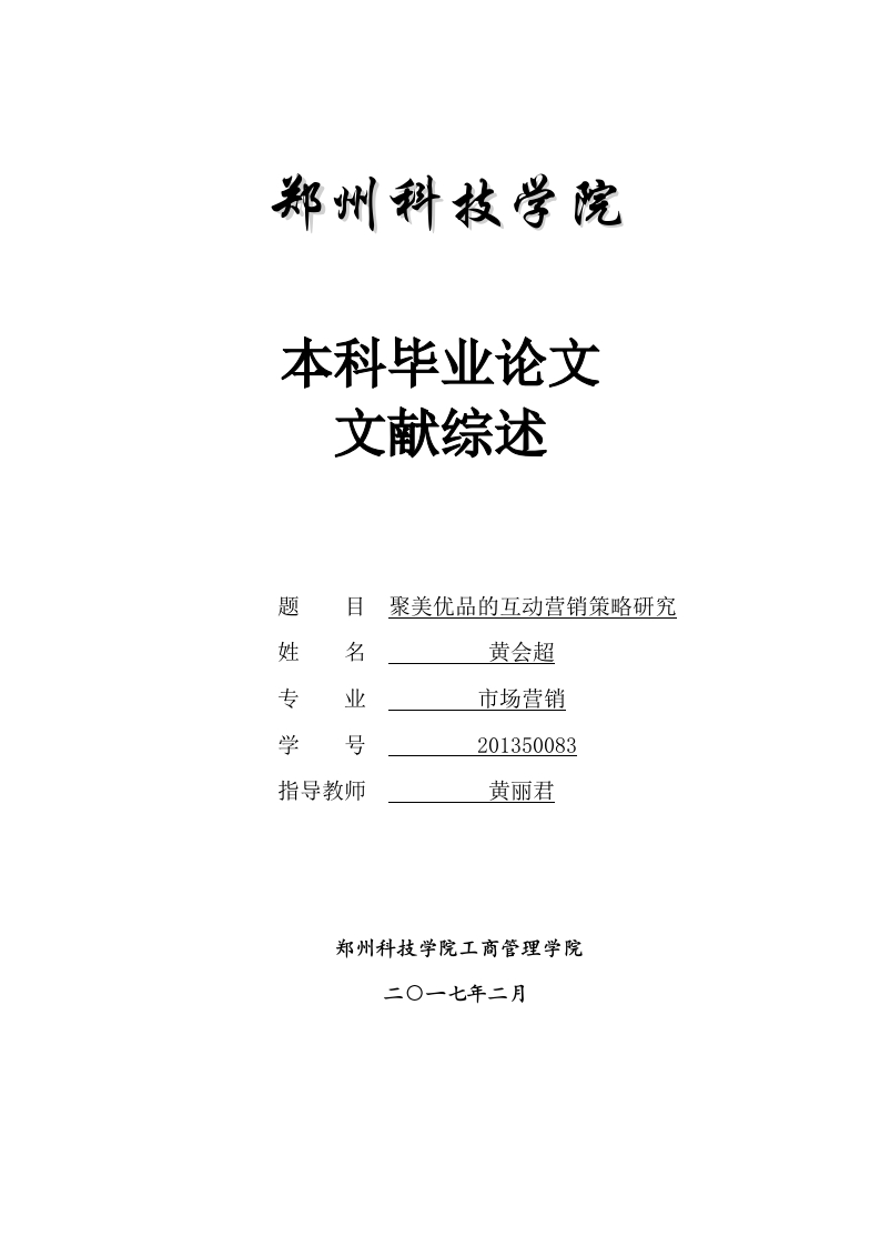 郑州科技学院本科毕业论文文献综述题目聚美优品的互动营销策略研究姓名黄会超专业市场营销学号201350083指导教师黄丽君郑州科技学院工商管理学院二O一七年二月聚美优品的互动营销策略研究文献综述摘要:现阶段,随着人们消费群体的变化和信息技术的不断发展,越来越多的购物网站采用了互动营销的方式来进行产品营销活动。本文着重梳理了关于互动营销的相关理论,对国内外学者的互动营销研究成果进行系统分析,发现国内外学者仅对互动营销的理论取得了研究程度,却尚未对近年来兴起的微博、微信等互动营销平台进行深入研究,使得互动营销理论缺乏足够的说服力。关键词:互动营销:营销策略:研究1互动营销的概述互动营销,是一种不同于传统营销模式,以网络为媒体实施的双向营销方式。通过前期目标客户群体的精准定位,不断完善客户信息数据库,通过良好的营销内容设计,促进客户重复购买,互动营销最根本的在于实现消费者和企业的良性互动,让消费者和企业之间从单一的“生产一销售一购买”关系转变为你中有我,我中有你的关系。而不同的定义方式,对互动营销的内容有着不同的理解。互动式营销,指企业应该想方设法向消费者提供比功能性利益更多的好处,把营销活动延伸到产品的营销过程之前、之中、之后,并在各个层面加强与消费者的互动,培养与消费者的关系。企业一方面应使消费者在互动过程中培养品牌体验提高品牌忠诚度,另一方面,企业也应通过与消费者的互动更深刻了解市场。互动式营销要求企业在三大利益方面与消费者进行交互式活动。这些利益包括传统的功能性利益、流程上的利益和关系上的利益。功能性利益,指的是产品及其性能特点、质量、价格等,营销者应从消费者的需要出发,在产品开发、定价及宣传沟通等多方面充分采纳消费者的意见。流程上的利益,是指消费者从开始考虑购买产品到购买、到消费、到售后服务,一直到重复购买的整个过程中所享受的利益。关系上的利益,是指消费者通过与企业建立长期稳定的关系而享受的利益。它包括消费者长久以来良好的产品体验、企业基于个人化服务为消费者带来的额外价值、消费者通过与企业分享信息所获得的好处、以及不同的忠诚度计划给消费者带来的好处等。此定义着重强调互动营销的全程性,强调互动营销所应达到的目的及与消费者建立的利益关系。2国外研究成果在国外研究现状中,LindaTucci(2014)强调互动营销应该在任何时间、任何地点都能够实现公司与目标客户之间的“双向沟通”,克服了传统市场营销的单向传播模式和无法与目标客户进行有效沟通的瓶颈。Verhoef(2015)认为互动营销是公司营销方式的一个组成部分。互动营销是传统营销的一种扩展,延伸到互联网上,在线营销和线下营销是一种相辅相成,相互促进的营销系统。WoodruffRB(2013)提出了互动营销的理论框架。树立正确心态、注重电子商务发展的可持续性、精心设计产品与服务、多媒体集成、会员和协同营销、企业系统和虚拟团队的建立,拓展利润来源削。科特勒在2011年6月提出:“科学和技术将影响世界各国,推动他们走向全球化,也涉及到消费,促进他们实现社区化沟通”。在线社区有了企业积极参与,便能够更好地为消费者服务。社会资本,即“网上社会资本”得到了有效的利用,应用互动式营销的企业能够在市场营销中赢得竞争优势。BrianHalligan,DharmeshShah等在20l1年9月《互动营销》中将Web上多种媒体形式巧妙地结合在一起,形成集客式营销。3国内研究成果高炜(2013)分析了企业互动营销现状,以发展的眼光看待问题,深入阐释了互动营销的实际状况,并提出企业在互动营销过程中产生的各种现实问题,包括传播能力有限、信息量大易被忽略、负面信息易造成粉丝流失、以及营销效果评估难度大等问题,并针对问题提出相应的解决措施例。陈永东(2014)运用大量知名企业成功案例,逐步讲解了企业微博运营的策略和方法。同时,通过对微博营销的SWOT分析,深入分析了在营销过程中微博自身的优势、劣势和面临的威胁和机会,而且对企业在营销方式进行概述。此外,还详细介绍了如何进行企业互动营销的整体规划,如何通过企业微博塑造品牌等问题阿。王娟娟(2012)详细介绍了互动营销中存在的不可避免的弱点,并讲解了如何在法律支持的前提下,在法治规范的基础上,实现对互动营销的积极引导和有效管理,进行阐述促进其更快发展。2