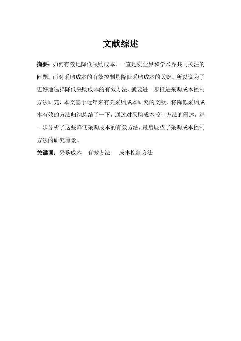 文献综述摘要:如何有效地降低采购成本,一直是实业界和学术界共同关注的问题。而对采购成本的有效控制是降低采购成本的关键。所以说为了更好地选择降低采购成本的有效方法、就要进一步推进采购成本控制方法研究,本文基于近年来有关采购成本研究的文献,将降低采购成本有效的方法归纳总结了一下,通过对采购成本控制方法的阐述,进一步分析了这些降低采购成本的有效方法,最后展望了采购成本控制方法的研究前景。关键词:采购成本有效方法成本控制方法前言随着中国逐步融入全球制造体系,我国企业面临的竞争越来越激烈。而成本作为企业运作的资本,是企业生产发展的关键。如何合理的利用成本是企业具有竞争力的核心,而降低企业在采购中的成本又是增强企业竞争力的重要组成部分。通过统计可知,企业中的采购成本占总成本的40%以上,而制造行业原材料和服务的采购成本占到了总成本的50%~80%,由此可知采购成本已成为企业成本的最大组成部分,所以说如何降低采购成本已经成为各行各业关注的焦点,而采购成本控制的重要性及迫切性日益显著。一些国内外学者对降低采购成本的方法以及采购成本控制方法都做了很多的研究,并取得了一系列研究成果。他们从不同的角度,阐述了降低采购成本出现的问题、以及对降低采购成本的控制方法和措施。理论概述(一)、采购成本的构成及决定因素吴丽威(2011)在《浅谈钢铁企业如何强化管理降低采购成本》中提到采购成本是有材料成本,采购管理成本,储存成本三大组成部分。但采购成本构成具有多样性和动态性的特征,影响采购成本的主要因素有四个:采购市场信息因素,面临多变的国内、国际市场,迅速的掌握、搜集市场信息是影响采购成本的关键。采购数量因素,经济批量订购的方式可以通过改变价格影响采购成本。采购价格因素,是物资成本和费用的主要组成,是采购成本高低的决定因素。物资的运力成本因素,如何以最短的时间和最少的费用完成物资在时间和空间上的转移是影响采购成本重要因素。领导的采购决策因素,在多变的市场前提下,领导的预见性,判断力和灵活性也是决策的重要因素。(二)、A企业简介降低采购成本的重要性刘刚(2006)在优化采购管理,降低采购成本一文中指出了降低采购成本对企业具有非常大重要性,其具体表现:降低采购成本是企业参与市场竞争的需要,如今,企业对采购工作越来越重视,采购管理水平不断提高,降低采成本己成为企业获取利润的又一途径:降低采购成本是企业实施低成本战略的必然要求,实施低成本战略,可以在行业中保持比较竞争优势。(三)、采购成本控制方法分析采购成本的传统定义采用企业通用的会计准则,对采购成本的定义不具有针对性,不能反映采购成本的全貌。基于战略性采购的成本控制方法。郭海森,彭烨提出战略采购的最优方法是建立双赢的战略合作伙伴关系。在这方面,国外的研究则更深入一些。Jean Nollet等(2005)从利润、集团规模、受益人、供应市场、成员关系等方面讨论了加入采购联盟实施联合采购的有点和不足。Henrik Agndal和U1fNi1sson(2007)研究发现,将作业成本法应用于长期采购管理过程中,会产生与供应商关系管理相关成本,这些成本使作业成本法的