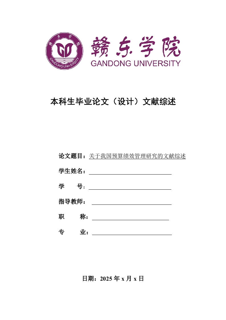 赣东学院GANDONG UNIVERSITY本科生毕业论文(设计)文献综述论文题目:关于我国预算绩效管理研究的文献综述学生姓名:学指导教师:职称:专业:日期:2025年x月x日一、引言我国全面深化改革的总目标是完善和发展中国特色主义制度,推进国家治理体系和治理能力现代化。财政是国家治理的基础和重要支柱,通过预算可实现财政的基础性和支柱性作用。国家治理体系现代化建立在现代财政制度之上,其中的核心是建设现代预算制度。在国家治理体系中,现代预算制度扮演着不可或缺的重要角色,是国家治理能力的坚实基础和重要保障。实施预算绩效管理可以发挥其在优化财政资源配置、提升政策效益、提高公共服务供给水平和质量等方面积极作用。2014年《预算法》的修订和2020年《中华人民共和国预算法实施条例》的颁布对我国预算绩效管理的实施提供了法律保障。2018年发布的《关于全面实施预算绩效管理的意见》指出,注重以结果为导向、强调成本效益、硬化责任约束,力争用3一5年内基本建成全方位、全过程、全覆盖的预算绩效管理体系,实现预算和绩效管理一体化。党的十九大提出要全面实施绩效管理,党的二十大提出要健全现代预算制度,目前社会各界都在关注和讨论预算绩效管理的相关主题,预算绩效管理的研究也备受重视。二、预算绩效管理相关概念界定在界定预算绩效管理的概念之前,需要先理清预算绩效和绩效预算的区别,绩效预算起源于西方,学术界并没有统一明确的概念界定,最早的记录可追溯到l950年,美国总统预算管理办公室(0 ffice of Management and Budget)认为绩效预算在请求拨款时应阐述拨款的目标、达成目标所需的花费、哪些指标量化来衡量每项任务取得成绩。预算绩效的核心要义是以政府绩效为依据对预算实施全程管理)(白景明,2011)。绩效预算是一个大系统,而预算绩效是这个大系统中的子系统(董为民,2007)。2011年,财政部发布的《关于推进预算绩效管理的指导意见》指出预算绩效是指预算资金所达到的产出和结果。其次,绩效预算与预算绩效管理在定义上也有所区别,高志立(2015)认为绩效预算以绩效为主线,使绩效信息能够在各个环节及时传递与应用,从而形成良性管理循环同。学者何文盛、杜晓林(2019)认为预算绩效管理是绩效预算概念“中国化”的产物,可将预算绩效管理看作是绩效预算的初级阶段⑥。不少学者发现绩效预算与预算绩效管理不仅在理论上有所不同,在实践过程中用词也有所不同,绩效预算这个术语在学术研究中较为常见,但是在改革实践中使用较多的术语则是预算绩效管理、财政支出绩效评价等(牛美丽,2012)。预算绩效管理是将预算管理和绩效管理相结合的实践,符合预算管理的内在要求,在实施预算管理的过程中,将绩效管理的理念和方法贯穿到预算管理的实践过程中,实现二者的有机融合⑧(王海涛,2014)。预算绩效管理构建了一个完整的管理机制,即“预算编制有目标、预算执行有监控、预算执行有评价、评价结果有反馈和反馈结果有应用”的循环管理过程。通过有效衔接各个环节,预算绩效管理可以充分发挥其优势,改变预算资金分配的模式,实现财政资源的高效配置,提高财政的可持续性,改善和提高民生水平,为经济发展提供有效保障。三、预算绩效目标管理的相关研究国内学者研究主要集中在预算绩效目标管理的功能定位、理论基础、绩效评价目标与部门管理目标之间的关系、推行预算绩效目标管理过程中的难点分析与现实困境这四个方面。(一)预算绩效目标管理的功能定位预算绩效目标的制定是开展预算绩效管理工作的先决条件,同时也是实施预算绩效管理工作能否取得实质性进展的关键。绩效目标管理是深化预算绩效管理改革的核心环节,是全过程预算绩效管理的根源,也是编制部门预算、实施绩效监控、开展绩效评价等工作的重要基础和依据。为实现有效的预算绩效管理,必须重视绩效目标管理工作的开展⑨(李伟、向立,2022)。(二)预算绩效目标管理的理论基础预算绩效目标管理需要一定的理论基础,众多学者选择目标设置理论来分析预算绩效目标管理相关问题。绩效目标设置是绩效目标管理的基本环节,绩效目标结果的有效实施立足于绩效目标设置的优劣,因此预算绩效目标管理要起作用,关键在于运用目标设置理论。因此,陈凯和肖鹏(2019)提出以下四点建议:一是将短期绩效目标与战略目标相均衡:二是合理设置目标难度和提高绩效目标明确度:三是在设定目标时,充分考虑下级意见,做到与下级的“心理契约”和“正式契约”相一致;四是设定绩效目标需要选择合理的参照系©。(三)绩效评价目标与部门管理目标之间的关系部门管理目标是绩效评价目标确立的原则和依据©(何文盛、杜晓林,2019),绩效管理由先前的事后评价逐步转向为事前管理,将绩效目标融入到部门预算“二上二下”的全过程之中,务必构建和贯彻绩效目标与预算编制申报、审核、批复的三个同步的工作协同机制(夏先德,2013)。(四)推行预算绩效目标管理过程中的难点分析与现实困境在实践的过程中存在以下四方面难点与困境:一是在预算决策过程中存在着政治因素影响,预算绩效管理的实行会受到多部门、多单位竞争预算资源的政治博弈因素的影响,政治博弈因素的存在使得不同部门对于预算资源的分配产生逆