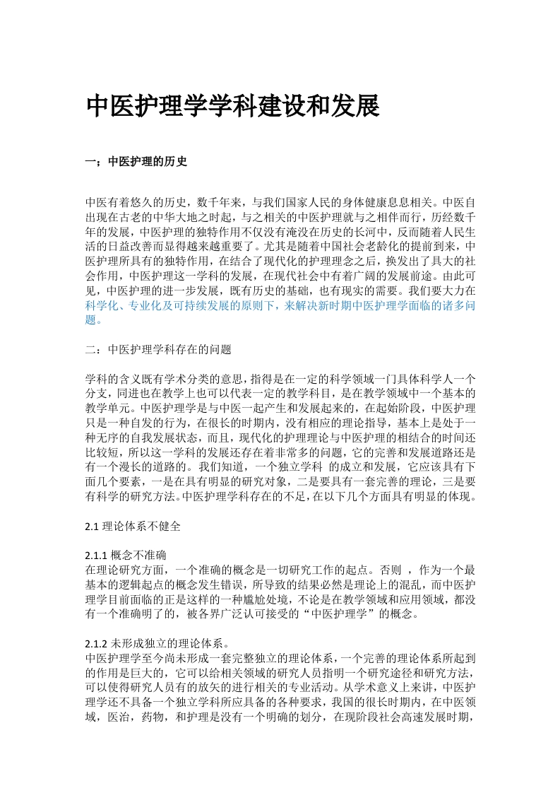中医护理学学科建设和发展一;中医护理的历史中医有着悠久的历史,数千年来,与我们国家人民的身体健康息息相关。中医自出现在古老的中华大地之时起,与之相关的中医护理就与之相伴而行,历经数千年的发展,中医护理的独特作用不仅没有淹没在历史的长河中,反而随着人民生活的日益改善而显得越来越重要了。尤其是随着中国社会老龄化的提前到来,中医护理所具有的独特作用,在结合了现代化的护理理念之后,换发出了具大的社会作用,中医护理这一学科的发展,在现代社会中有着广阔的发展前途。由此可见,中医护理的进一步发展,既有历史的基础,也有现实的需要。我们要大力在科学化、专业化及可持续发展的原则下,来解决新时期中医护理学面临的诸多问题。二:中医护理学科存在的问题学科的含义既有学术分类的意思,指得是在一定的科学领域一门具体科学人一个分支,同进也在教学上也可以代表一定的教学科目,是在教学领域中一个基本的教学单元。中医护理学是与中医一起产生和发展起来的,在起始阶段,中医护理只是一种自发的行为,在很长的时期内,没有相应的理论指导,基本上是处于一种无序的自我发展状态,而且,现代化的护理理论与中医护理的相结合的时间还比较短,所以这一学科的发展还存在着非常多的问题,它的完善和发展道路还是有一个漫长的道路的。我们知道,一个独立学科的成立和发展,它应该具有下面几个要素,一是在具有明显的研究对象,二是要具有一套完善的理论,三是要有科学的研究方法。中医护理学科存在的不足,在以下几个方面具有明显的体现。2.1理论体系不健全2.1.1概念不准确在理论研究方面,一个准确的概念是一切研究工作的起点。否则,作为一个最基本的逻辑起点的概念发生错误,所导致的结果必然是理论上的混乱,而中医护理学目前面临的正是这样的一种尴尬处境,不论是在教学领域和应用领域,都没有一个准确明了的,被各界广泛认可接受的“中医护理学”的概念。2.1.2未形成独立的理论体系。中医护理学至今尚未形成一套完整独立的理论体系,一个完善的理论体系所起到的作用是巨大的,它可以给相关领域的研究人员指明一个研究途径和研究方法,可以使得研究人员有的放矢的进行相关的专业活动。从学术意义上来讲,中医护理学还不具备一个独立学科所应具备的各种要求,我国的很长时期内,在中医领域,医治,药物,和护理是没有一个明确的划分,在现阶段社会高速发展时期,如果中医护理不能快速的形成一套完善的理论基础给予支撑,它的发展毫无疑问将会受到极大的制约,会严重影响整个中医领域快速发展。2.1.3同时在学科分类方面,中医护理学也一直存在争议,至今仍然没有一个统一的结论。中医护理学是脱胎于中医理论,从其产生的历史根源来看,是应该划分到中医这一领域的:但是中医护理学本身是具有明显的护理学的属性,将其划分到护理学也不是不可以。,2.14由于中医护理理论学如今仍然是一个待发展的学科,由于发展的时间短,存在着很多的问题,再加上中医护理学前景不十分明朗,所以导致学科选择上处于一个偏冷门的地位,投入到这一学术领域的人才很少,后续研发动力不足。在中医护理领域,人才培养方面也存在着诸多的不足,现阶段,我国在医疗方面的人才培育机制是院校培养和在职人员定期培训这两种方式。但在中医护理学方面,还存在着明显的定位不确定,课程安排不合理,培训内容具有明显的西化现象,这些现象都说明了一个问题,那就是对中医护理学缺乏一个清晰的认识,没有建立起一个完全的中医思维方式,三随着我国人民的生活水平不断的提高,以及我国在医疗卫生方面的体制改革不断的深入,中医及其相关的各个领域都面临着一个非常好的发展机遇,我们一定不能错过这一机遇,使中医护理学通过自身的改革,适应社会的需求,扩大发展空间,加强相关的理论研究,探索出一条具有特色的中医护理的发展之路。这就要求我们必须做好以下几个方面的工作3.1正确的确立自身的定位,要对自身的发展方向有一个清晰无误的了解,在我国的现阶段,中医护理学在学术界有二个定位方案,一个定位方案是中医护理学是中医临床医学下属的二级学科,另一个定位方案是护理学下属的二级学科。根据我国目前的现实情况,大多数人认为,将中医护理学划分为护理学领域的一个二级学科,好像更有利于它的快速发展。但是实际上,现代的中医护理学是传统的中医护理的基础上融入了一些现代的护理理念而演化形成的,如果将它作为一个“交叉学科”,也许才是中医护理学的真实体现。3.2将高层次人才和专科人才的培养有机结合,是中医护理学发展的基础和有效的保证。高层次人才的培养通常包括研究型人才和实用性人才二个方面,研究型人才通过对硕土,博士这一类以科学研究为主的人才培养,是对中医护理理论科研的发展有着重要的作用:而对高层次实用型人才的培养,在我国是通过一些医学院校和医疗机构之间联合进行一些“中医专科护士”的培养来进行的,并取得了很好的成效。3.3加强理论研究,对中医护理学的理论内涵加强研究,丰富学科的理论基础,是中医护理学有一个更大发展的前提。现阶段中医护理学所采用的理论大都是从中医学理论和护理学理论中借鉴的一些理论来指导临床实践,还没