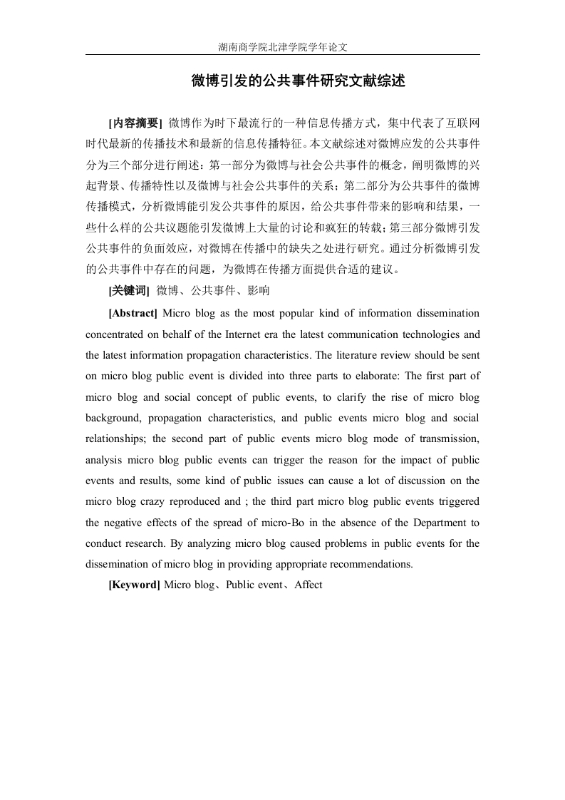 湖南商学院北津学院学年论文微博引发的公共事件研究文献综述[内容摘要】微博作为时下最流行的一种信息传播方式,集中代表了互联网时代最新的传播技术和最新的信息传播特征。本文献综述对微博应发的公共事件分为三个部分进行阐述:第一部分为微博与社会公共事件的概念,阐明微博的兴起背景、传播特性以及微博与社会公共事件的关系:第二部分为公共事件的微博传播模式,分析微博能引发公共事件的原因,给公共事件带来的影响和结果,一些什么样的公共议题能引发微博上大量的讨论和疯狂的转载:第三部分微博引发公共事件的负面效应,对微博在传播中的缺失之处进行研究。通过分析微博引发的公共事件中存在的问题,为微博在传播方面提供合适的建议。关键词]微博、公共事件、影响[Abstract]Micro blog as the most popular kind of information disseminationconcentrated on behalf of the Internet era the latest communication technologies andthe latest information propagation characteristics.The literature review should be senton micro blog public event is divided into three parts to elaborate:The first part ofmicro blog and social concept of public events,to clarify the rise of micro blogbackground,propagation characteristics,and public events micro blog and socialrelationships;the second part of public events micro blog mode of transmission,analysis micro blog public events can trigger the reason for the impact of publicevents and results,some kind of public issues can cause a lot of discussion on themicro blog crazy reproduced and the third part micro blog public events triggeredthe negative effects of the spread of micro-Bo in the absence of the Department toconduct research.By analyzing micro blog caused problems in public events for thedissemination of micro blog in providing appropriate recommendations.[Keyword]Micro blog、Public event、Affect湖南商学院北津学院学年论文在微博上,140字的力量能积羽沉舟,1秒钟转发能在短短时间内将线上舆论转变为线下动员,而开放平台、随时随地分享让个体声音获得了无限放大的可能,经由微博杠杆,蚂蚁的力量也能撬动现实。这已不再是危言耸听。一、选题背景及选题意义(一)选题背景微博,即微博客(Micro Blog)的简称,是一个基于用户关系信息分享、传播以及获取平台,用户可以通过WEB、WAP等各种客户端组建个人社区,以140字左右的文字更新信息,并实现即时分享。简单的说,微博就是一种允许用户即时更新简短文本(通常少于200字),并公开发布的博客的形式,允许任何人阅读或者只能由用户选择的群组阅读。从微博的发送特性上来看,微博客具备4A的元素(Anytime,Anywhere,Anyone,Anything),成为一种流动的互联网装置。2006年3月,博客技术先驱blogger创始人埃文·威廉姆斯(Evan Wil1iams)创建的新兴公司Obvious推出了大微博服务。在最初阶段,这项服务只是用于向好友的手机发送文本信息。Twitter是2006年3月由b1 ogger的创始人威廉姆斯(Evan Wil1iams)推出的,英文原意为小鸟的叽叽喳喳声,用户能用如发手机短信的数百种工具更新信息。Twitter的出现把世人的眼光引入了一个叫微博的小小世界里。Twitter是一个社交网络及微博客服务。用户可以经由SS、即时通信、电邮、Twitter网站或Twitter客户端软件(如Twitterrific)输入最多140字的文字更新,Twitter被A1exa网页流量统计评定为最受欢迎的50个网络应用之一。从2008年进入中国,到2009年被中国社科院评价为“杀伤力最强的舆论载体”,到2010年的“微博元年”称号,微博,只花了短短两年多的时间,就在我国传播媒介中占据了极其重要的位置。如今,有公共事件的地方基本都有微博的身影,微博与事件大有捆绑之势。2010年舟曲泥石流、宜黄拆迁自焚、上海静安大火事件,2011甬温线特大铁路事故、郭美美事件、故宫“十重门”等,微博都给我们留下了深刻的印象,微博也曾一度影响了事情的发展。作为网络舆论的一股新生强势力量,微博在公共事件中的影响力不容小视。2010年国内微博迎来来春天,微博像雨后春笋般崛起。四大门户网站均开设微博。根据相关公开数据,截至2010年1月份,该产品在全球已经拥有7500万注册用户。第1页共8页湖南商学院北津学院学年论文中国互联网络信息中心(CNNIC)于2011年7月19日发布《第28次中国互联网络发展状况统计报告》,报告显示,2011年上半年,中国微博用户从6331万增至1.95亿,增长约2倍。该《报告》指出,中国互联网的普及率增至36.2%,较2010年增加1.9%。2011年上半年,我国微博用户数量从6331万增至1.95亿,半年增幅高达208.9%。微博在网民中的普及率从13.8%增至40.2%。从2010年底至今,手机微博在网民中的使用率比例从15.5%上升到34%。2012年中国社科文献出版社上月底发布的中国新媒体发展报告显示:中国社科文献出版社在京发布的《新媒体蓝皮书:中国新媒体发展报告(2012)》指出,作为一种新型媒介工具,微博传播对于社会发展有着明显的积极作用,但其负面效应也很显著。而中国微博发展快,用户增长迅速,自然容易滋生一些新的问题。这也引发了笔者对微博引发的公共事件进行研究。(二)选题意义理论意义:微博作为时下最流行的一种信息传播方式,集中代表了互联网时代最新的传播技术和最新的信息传播特征。研究“微博”是紧跟时代脉搏,能了解信息时代最新的传播趋势。同时,对新的传播媒介“微博”的研究能够让我们重新审核经典的传播理论,进行理论知识的更新和创新。实践意义:随着社会的发