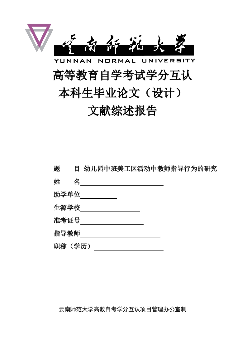 YUNNAN NORMAL UNIVERSITY高等教育自学考试学分互认本科生毕业论文(设计)文献综述报告题目幼儿园中班美工区活动中教师指导行为的研究姓名助学单位生源学校准考证号指导教师职称(学历)云南师范大学高教自考学分互认项目管理办公室制论文(设计)题目幼儿园中班美工区活动中教师指导行学科分类为的研究88047文献综述摘要:美工区域活动是幼儿在区域活动中比较感兴趣的一种活动,幼儿可以根据自己的兴趣和需要,自由选择绘画和手工材料,大胆创作。主要研究昆明市A幼儿园美工区域活动中教师指导的现状及目前存在的问题,采用了文献研究法、访谈法和观察法,观察对象为昆明市A幼儿园中的七个中班,访谈的对象是幼儿园中班教师。从教师对中班美工区域活动指导的角度,深入观察和分析,发现教师指导存在材料准备的层次性差,利用率低:未明确活动介入的前提:行为目标导向性比较强:偏重教学结果评价的问题,针对问题分析原因,教师对美工区域活动的内涵和价值认识不足:美工区活动中教师控制较多:教师忽视美工区域活动中幼儿的主体地位:教师缺乏必要的美术专业素养方面的原因。因此教师应该有效投放美工区域材料,激发幼儿探索的兴趣;明确观察的目的,提高观察能力:在目标模式的指导之下,关注活动过程:对于整个活动过程教师要及时有效地进行评价,这样才能有效提升教师在美工区域活动指导的实践能力,从而更好地促进幼儿的学习与全面发展。关键词:美工:区域活动:教师指导:主体地位文献综述的主要内容:1、主要观点美术教育是幼儿的全面发展的重要组成部分,也是艺术的语言和表现形式,是幼儿能接触到的美感,帮助幼儿形成健全的人格,丰富刺激美感,创造美,并可以得到美好的教育。从而促进幼儿终身可持续发展,这表明了艺术活动对幼儿的重要性。但目前中班幼儿美工区域能力活动存在一些问题:老师以指导为主,不顾及幼儿,忽视幼儿的中心主体地位:活动形式单一、内容比较笼统,出现重技能轻创造性的现象,忽视幼儿的探索性:教师指导缺乏系统性、全面性,将重点只放在活动的目标上,降低了幼儿的积极性与兴趣性:对于美工领域的材料投放,教师没有目标和计划。本论文希望能促进中班美工活动时教师能力的增进,对教师有效的指导方案的改善也有很大作用。2、内容概述主要研究昆明市A幼儿园美工区域活动中教师指导的现状及目前存在的问题,采用了文献研究法、访谈法和观察法,观察对象为昆明市A幼儿园中的七个中班,访谈的对象是幼儿园中班教师。从教师对中班美工区域活动指导的角度,深入观察和分析,发现教师指导存在材料准备的层次性差,利用率低:未明确活动介入的前提;行为目标导向性比较强:偏重教学结果评价的问题,针对问题分析原因,教师对美工区域活动的内涵和价值认识不足:美工区活动中教师控制较多:教师忽视美工区域活动中幼儿的主体地位:教师缺乏必要的美术专业素养方面的原因。因此教师应该有效投放美工区域材料,激发幼儿探索的兴趣:明确观察的目的,提高观察能力:在目标模式的指导之下,关注活动过程:对于整个活动过程教师要及时有效地进行评价,这样才能有效提升教师在美工区域活动指导的实践能力,从而更好地促进幼儿的学习与全面发展。3、研究方法(1)文献研究法以现代网络为主,参考传统书籍,收集有关幼儿美工区相关文献,并展开记录、交流、整理工作,在综合分析的基础上,了解目前中班幼儿及教师在美工区域活动中的现状,为本研究的顺利进行积累相关理论。(2)访谈法对昆明市A幼儿园中的14名幼儿园中班教师进行访谈,深入了解中班幼儿美工区域活动的真实、具体情况。(3)观察法该方法在很多领域研究中都得到广泛应用。利用了眼睛、耳朵等感官去感知观察对象并进行记录。本研究在观察过程中,观察了幼儿园的7个中班。从教师材料投放、活动介入、评价的环节进行观察,了解存在的问题,分析问题出现的原因。参考文献[1]卢迎新.幼儿园自主游戏中教师有效介入研究D].山东师范大学,2016.[2]安.S.爱泼斯坦、伊莱.特里米斯Misunderstandings and effective strategies in art teachingactivities in kindergartens[M]2012 (1):16.[3]Torenz Art,literature and technology in pre-service kindergartenteacher training[J].Earlychildhood education journal,2014,35(4):327-333.[4]Thompsonc,Baless Michael doesn't like my dinosaurs ":conversations in a preschoolart class[J].Studies in art education,2013:43-55.[5]Babcock,Hartle,Lamme.Prosocial behaviors of five-year-old children in sixteen learn inactivitycenters[],Journal of research in childhood education,2015,9(2):113-127.[6]Vennml,Wolerym.Embedding instruction in artivities to teach preschooler s with