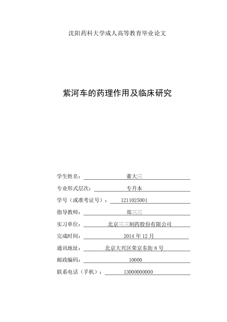 沈阳药科大学成人高等教育毕业论文紫河车的药理作用及临床研究学生姓名:董大三专业形式层次:专升本学号(或准考证号):1211025001指导教师:郑三三实习单位:北京三三制药股份有限公司完成时间:2014年12月通讯地址:北京大兴区荣京东街8号邮政编码:10000联系电话(手机):13000000000成人高等教育毕业论文诚信声明本人郑重声明:所呈交的毕业论文,是本人在指导老师的指导下,独立进行研究工作所取得的成果,成果不存在知识产权争议,除文中已经注明引用的内容外,本论文不含任何其他个人或集体已经发表或撰写过的作品成果。对本文的研究做出重要贡献的个人和集体均已在文中以明确方式标明。本人完全意识到本声明的法律结果由本人承担。毕业论文作者签名:年月日目录摘要1第1章紫河车概述1.1紫河车来源与功效21.2有效成分…1.3炮制方法1.4真伪鉴别1.4.1性状鉴别法1.4.2理化鉴别法.…1.4.3水试、火试鉴别法.…31.4.4聚丙烯酰胺凝胶电泳鉴别第2章紫河车药理作用及临床研究42.1药理作用…2.1.1增强机体免疫力作用2.1.2抗感染作用…2.1.3激素样作用.…2.1.4凝血作用.…2.2临床应用.2.2.1溃疡疾病.….52.2.2肝脏疾病2.2.3皮肤疾病.….52.2.4泌尿系统疾病.52.2.5呼吸系统疾病2.2.6肿瘤…2.2.7妇科疾病…2.2.8其他临床应用参考文献致谢…