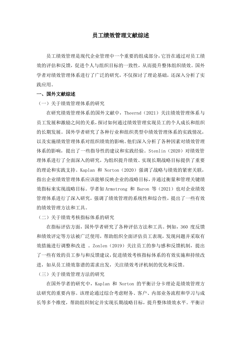 员工绩效管理文献综述员工绩效管理是现代企业管理中一个重要的组成部分,它旨在通过对员工绩效的评估和反馈,促进个人与组织目标的一致性,从而提升整体组织绩效。国外学者对绩效管理体系进行了广泛的研究,不仅探讨了理论基础,还深入分析了实践应用。一、国外文献综述(一)关于绩效管理体系的研究在研究绩效管理体系的国外文献中,Theernd(2021)关注绩效管理体系与员工发展和激励之间的关系,探讨如何通过绩效管理实现员工的个人成长和组织的长期发展。国外学者研究了各种行业和组织类型中绩效管理体系的实践情况,以及实施绩效管理体系对组织绩效的影响。他们深入分析了各种因素对绩效管理体系的影响,提出了一些指导性的建议和实践经验。Stenlin(2020)对绩效管理体系进行了全面深入的研究,为组织提升绩效、实现长期战略目标提供了重要的理论和实践支持。Kaplan和Norton(2020)强调了战略与绩效的紧密关联,指出企业绩效管理体系应该能够反映企业的战略目标,并通过衡量和管理关键绩效指标来实现战略目标。学者如Armstrong和Baron等(2021)也对企业绩效管理体系进行了深入研究,强调了绩效管理的系统性和综合性,提出了一些有效的绩效管理方法和工具。(二)关于绩效考核指标体系的研究在指标评估方面,国外学者研究了各种评估方法和工具。例如,360度反馈和绩效评定等方法被广泛使用,帮助组织全面评估员工表现,发现问题并采取有效措施进行调整和改进。Zonlen(2019)关注员工的参与感和反馈机制,提出了一些有效的员工参与和反馈建议,促进绩效考核指标体系的有效实施和持续改进,如从员工绩效靠谱的需求出发,关注绩效考评机制的优化和反馈。(三)关于绩效管理方法的研究在国外学者的研究中,Kaplan和Norton的平衡计分卡理论是绩效管理方法研究的重要内容。该理论通过综合考虑财务、客户、内部业务流程和学习与成长等多个维度,帮助组织制定并实现长期战略目标,提升整体绩效水平。平衡计分卡方法被广泛应用于企业管理中,为组织提供了有效的绩效管理模式。另外,关键绩效指标(KPIs)方法也是国外学者研究的热点之一。通过设定具体、可衡量的关键绩效指标,可以评估和监测组织、部门或个体的表现情况,帮助组织实现目标导向的管理,促进持续改进和提升绩效水平。KPIs方法有助于明确绩效目标,指导员工的工作重点和行为,提高工作效率和绩效表现。二、国内文献综述(一)关于绩效管理体系的研究在国内的研究中,对企业绩效管理体系的概念和研究主要集中在如何通过有效的绩效指标和评估体系来提升企业绩效。刘茜(2024)等学者认为,企业绩效管理体系应该注重数据的收集、分析和应用,以实现对企业绩效的动态监控和管理。翟新雨(2024)等学者指出,企业绩效管理体系还应该结合员工的个人绩效管理,通过激励机制和绩效奖励来激发员工的工作动力,从而提升整体企业绩效。通过综合国内研究现状可以看出,对企业绩效管理体系的研究在国内主要关注如何通过科学有效的管理方法和体系来提高企业绩效,为企业管理提供了一定的理论和实践指导。何晓明(2024)和张一伟(2024)提出了不同的绩效激励机制,如奖金制度、晋升机制等,用以激励员工积极工作,并提高员工的工作动力和绩效表现。绩效激励机制的设计和实施对于激发员工的工作热情和潜力具有重要意义。王成(2024)提出了各种改进措施,如培训发展、员工反馈机制等,帮助组织发现问题、及时调整,并持续提升绩效水平。这些改进措施有助于优化绩效管理体系,实现组织的可持续发展。(二)关于绩效考核指标的研究在国内文献中,绩效考核指标的选择和设计是研究的重点之一。郭婧(2024)研究了各种评估方法和工具,如绩效评分、综合评估等,帮助组织全面评估员工表现,发现问题并采取有效措施进行调整和改进。评估指标的科学性和公正性对于激励员工、提高绩效水平至关重要。在绩效考核指标的实际应用方面,国内学者也进行了一些研究。陈恳(2024)关注不同行业和组织类型中绩效考核指标的实践情况,分析了实施这些指标对组织绩效的影响,并提出一些实用性的建议和经验,帮助企业建立科学有效的绩效考核体系。(三)关于绩效管理方法的研究张毓(2023)对传统的关键绩效指标方法进行优化和调整,从财务因素和动态因素两个角度对绩效考核内容和方法进行重新设计,提升绩效考核的合理性。赵淼(2023)认为,对于企业来说,目前应用最为广泛的绩效管理方法是目标管理法,该方法注重企业利润和成长目标,并将企业的业绩增长目标落实到每一个员工身上,并激励员工完成绩效目标。何永伟(2024)认为在企业绩效管理中应用大数据技术,可以对企业内部管理中员工复杂的绩效数据进行精准分析和直观展示,帮助管理人员通过可视化数据准确了解员工表现,对员工薪资确立提供必要依据,对企业创新发展和经济效益提升发挥重要的作用。当前,多数企业在绩效管理中存在对大数据技术应用不足、管理模式单一、管理方式滞后、绩效管理标准不明晰等问题,有待从管理方式、管理模式等方面进行改进和优化。三、文献评述综上所述,通过对国内外企业员工绩效管理体系的相关研究成果进行学习后发现,不同的学者对绩效考核的概念认识存在些许的差异,但是对于绩效考核的积极意义是