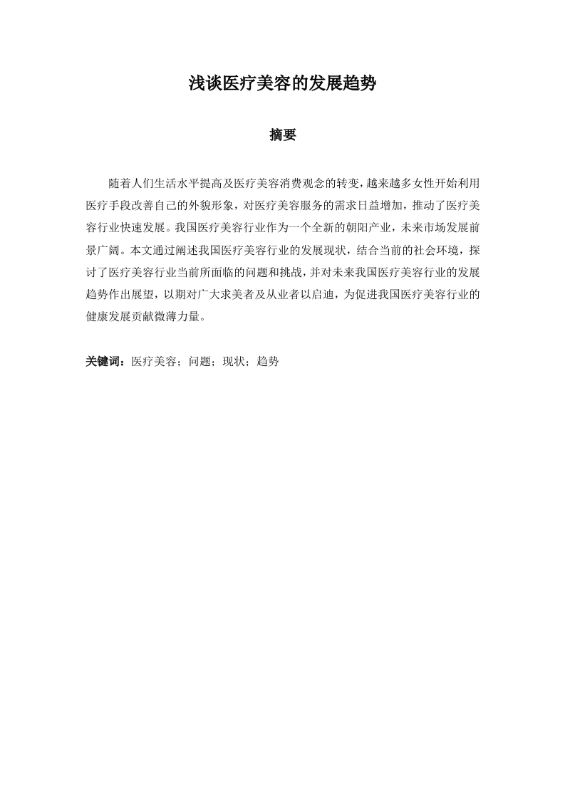 浅谈医疗美容的发展趋势摘要随着人们生活水平提高及医疗美容消费观念的转变,越来越多女性开始利用医疗手段改善自己的外貌形象,对医疗美容服务的需求日益增加,推动了医疗美容行业快速发展。我国医疗美容行业作为一个全新的朝阳产业,未来市场发展前景广阔。本文通过阐述我国医疗美容行业的发展现状,结合当前的社会环境,探讨了医疗美容行业当前所面临的问题和挑战,并对未来我国医疗美容行业的发展趋势作出展望,以期对广大求美者及从业者以启迪,为促进我国医疗美容行业的健康发展贡献微薄力量。关键词:医疗美容:问题:现状:趋势目录前言…1医疗美容行业的概况…1.1医疗美容行业的发展历程.11.2医疗美容诊疗项目的分类2医疗美容行业面临的问题及对策.22.1营销模式现状及问题22.2咨询与服务的现状及问题.…2.3消费者对医疗美容项目及产品的认识问题…32.4医疗美容行业乱象对策.33医疗美容行业的发展趋势3.1“轻医美”是未来大趋势43.2医美产品和服务透明化3.3服务顾客以人为本3.4行业可待统一标准化4结语5文献参考…致谢…前言改革开放以来,随着我国国民经济实力的不断提升,人们开始关注生活的品质,对美的意识越来越强烈,对医疗美容需求呈高速上升趋势,越来越多的人希望通过医疗手段改善自身容貌,提升自己的形象,于是医疗美容行业应运而生。医疗美容指的是运用手术、药物、医疗器械以及其他具有创伤性或者侵入性的医学技术方法对人的容貌和人体各部位形态进行修复与再塑的美容方式。医疗美容是一种医疗活动,其从业人员必须符合国家相关条例资质以及取得相关卫生行政部门的批准,发放医疗机构执业许可证之后才能从事该行业②,和普通的生活美容有很大区别。近年来,随着社会上越来越多民营医疗美容机构的出现,民营医疗美容医院开始崛起,特别是在服务和患者满意度方面受到越来越多求美者的认可,成为大多数求美者的主要选择,推动了中国医疗美容行业快速发展。随着医疗美容市场的蓬勃发展,医疗美容行业整体呈现出增长速度快、行业利润高且竞争激烈等一系列的特点。医疗美容行业的发展在满足大多数求美者的需求的同时,也引发了许多社会问题,但其发展趋势依旧令人看好。1医疗美容行业的概况1.1医疗美容行业的发展历程医疗美容的起源可以追溯到古印度鼻再造术,同时我国《晋书》魏泳之传中也描述了类似唇腭裂修补手术。在此后漫长的历史进程中,各类文献或多或少都有整形手术的痕迹。现代医疗美容起于16世纪,主要针对一些身体部位有缺陷的患者,目的是为了治疗身体畸形。战争的相继爆发,导致了大量残疾病例的产生,人们对于战争创伤后的修复需求增加,其需求特点仍是治病救人。随着时代的发展以及传统思想观念的转变,人们不再认为美是一种天然禀赋,越来越多人逐渐开始接受并利用医疗手段来改造自己的身体,提升外貌形象,希望通过这种方式实现对美的追求。于是医疗美容业开始在许多国家兴起,目前较为成熟的地区主要有韩国、日本、美国。在我国,现代整形手术起始于20世纪二十年代,以上海首个整形外科门诊为标志。随着民营医疗美容机构的不断扩张,我国医疗美容行业开始进入发展期。近几年,在颜值经济和网红经济影响下,涌现出大量医疗美容机构,消费者需求