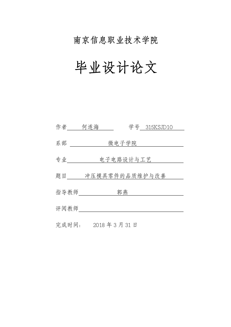 南京信息职业技术学院毕业设计论文作者何连海学号315KSD10系部微电子学院专业电子电路设计与工艺题目冲压模具零件的品质维护与改善指导教师郭燕评阅教师完成时间:2018年3月31日毕业设计(论文)中文摘要(题目):冲压模具零件的品质维护与改善摘要:现在市场竞争愈发地激烈,对于产品来说,它是否可以很早地在市场里发售决定了其成败。模具本身是一种产品生产工具,具备较好的效率以及质量,在生产产品的过程里,模具开发需要耗费特别多的时间。所以很多客户都希望模具开发能够具备更小的开发周期,大多数客户最为重视的就是模具交货期,其次为价格以及质量。可是加工商往往因为赶交期而忽略了品质的重要性,常常因交货品质的不过关而延误交期、耽误生产时间,甚至因此而流失商机造成不可避免的损失。因此目前最应该重视的问题就是怎样能够尽可能地高性价比地生产加工模具。所以,模具零件的生产品质便变得尤为重要,然而模具零件的加工工艺种类繁多,且各加工工艺之间的加工领域各不相同。因此各加工工艺之间常常发生矛盾、激化矛盾、难以相互配合。又如何能达到不同模具零件的加工要求呢?本文的目标便是合理并有效的安排各加工工艺之间的流程,以达到密切配合,消化内部矛盾从而提高模具零件的加工品质和模具零件的加工效率,以此达到改善模具零件的品质并长期协调维护生产目的。关键词:模具零件加工工艺解决方法目录1引言2模具零件常见加工工艺2.1电火花线切割加工2.2研磨加工2.3CNC加工2.4精密放电加工3常见问题与解决3.1加工工艺的排序混乱3.2模具零件的加工工艺不符3.3模具零件要求复杂加工工艺难以实现3.4模具零件加工异常及返工结论致谢参考文献