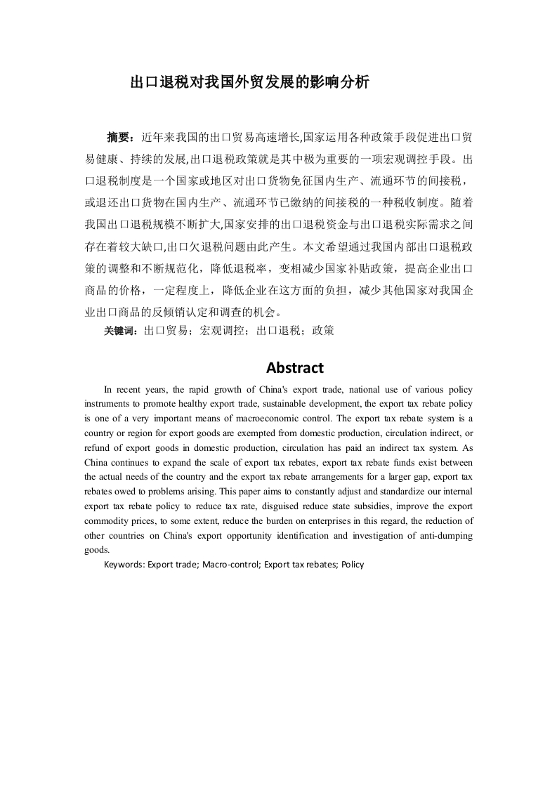 出口退税对我国外贸发展的影响分析摘要:近年来我国的出口贸易高速增长,国家运用各种政策手段促进出口贸易健康、持续的发展,出口退税政策就是其中极为重要的一项宏观调控手段。出口退税制度是一个国家或地区对出口货物免征国内生产、流通环节的间接税,或退还出口货物在国内生产、流通环节已缴纳的间接税的一种税收制度。随着我国出口退税规模不断扩大,国家安排的出口退税资金与出口退税实际需求之间存在着较大缺口,出口欠退税问题由此产生。本文希望通过我国内部出口退税政策的调整和不断规范化,降低退税率,变相减少国家补贴政策,提高企业出口商品的价格,一定程度上,降低企业在这方面的负担,减少其他国家对我国企业出口商品的反倾销认定和调查的机会。关键词:出口贸易:宏观调控:出口退税:政策AbstractIn recent years,the rapid growth of China's export trade,national use of various policyinstruments to promote healthy export trade,sustainable development,the export tax rebate policyis one of a very important means of macroeconomic control.The export tax rebate system is acountry or region for export goods are exempted from domestic production,circulation indirect,orrefund of export goods in domestic production,circulation has paid an indirect tax system.AsChina continues to expand the scale of export tax rebates,export tax rebate funds exist betweenthe actual needs of the country and the export tax rebate arrangements for a larger gap,export taxrebates owed to problems arising.This paper aims to constantly adjust and standardize our internalexport tax rebate policy to reduce tax rate,disguised reduce state subsidies,improve the exportcommodity prices,to some extent,reduce the burden on enterprises in this regard,the reduction ofother countries on China's export opportunity identification and investigation of anti-dumpinggoods.Keywords:Export trade;Macro-control;Export tax rebates;Policy一、出口退税的基本理论1.1出口退税的定义出口货物退税,简称出口退税,其基本含义是指对出口货物退还其在国内生产和流通环节实际缴纳的产品税、增值税、营业税和特别消费税。国家的出口退税是一个国家税收的重要组成部分。相应的计算公式为:应退税额=出口货物的购进金额X退税率或者为应退税额=出口货物的进项税额一出口货物不予退税的税额出口货物不予退税的税额=出口货物的购进金额X(增值税暂行条例规定的税率一适用的退税率)1.2出口退税的基本特点我国的出口退税制度在多年运行的基础上,参考国际上的常用方法,己经形成了具有自我特色的、自成体系的专项税收制度。我国的出口退税制度与其他税收制度相比有着以下的特点:(1)出口退税是一种收入退付行为出口退税制度作为一种具体的税收制度,与其他税收制度的目的恰恰相反。出口退税是在货物出口之后,国家将己经在国内对出口货物进行征收的流转税返还给企业的一种退付或减免税收的行为。因此,其他税收的目的是为了筹集资金,而出口退税制度则是为了返还资金。(2)出口退税具有调节职能的单一性我国对出口货物实行出口退税的主要目的是使企业的出口▣货物以不含税的价格参与国际市场竞争,是一项提高企业产品竞争力的政策性举措。其他税收制度的具有鼓励与限制并存、收入与减免并存的双向调节职能,而出口退税制度具有比较单一的职能调节功能。(3)出口退税属间接税范畴内的一种国际惯例目前,很多国家均通过不用的实施政策实行着间接税收制度,但是对一国出口商品实行“零税率”而言,大部分国家的间接税制度是一致的。为了遵守出口商品间接税的“零税率”原则,针对退税与免税,有的国家只实行其中的一种,有的国家同时实行两种,所不同的就在于其实施方式,但是,其目的都是对出口商品实行退换或减免间接税。各国均根据自己国家的国情,制定了适合自身的与征税制度密切有关的出口退税制度,出口退税制度一旦脱离征税制度,则出口退税就会失去依据。1.3出口退税的基本原则作为一国总体税制的重要组成部分,出口退税制度应遵循总体税制所确立的基本原则。但是,出口退税在遵循普遍原则的基础上,又有着自身的特殊性,具有着自身固有的原则。(1)国际惯例原侧国际惯例原则是指主权国家为促进本国涉外经贸活动的发展,在参加国际经贸活动与国际分工时所执行的某项政策措施符合国际的一定准则。在国际贸易过程中,各国税收制度的不同所引起的国际间的税收差异必然会引起出口货物成本的含税量不同,这就使得各国的出口产品在国际市场上根本无法公平竞争。因此,为了使得国际市场上的产品进行公平竞争,就得按照国际惯例,对出口货物退还本国已征税款。(2)国民待遇原则在民事权利方面,一个国家对在自己国境内的本国公民以及外国公民以及企业给予同等待遇的原则称为国民待遇原则,是最惠国待遇原则的重要补充。根据国民待遇原则,进口国往往会依照消费地原侧对进口商品征收间接税。在这种情况下,实行出口退税一方面是一种避免重复征税的有效措施:令一方面,出口国对进口货物征收与国内货物同等税率的增值税和消费税等,既可以避免两国对同一货物的双重征税,又可使进口产品承担同国内产品同等的税负,使国内产品与进口产品公平竞争。(3)属地管理原则又称为领土原则,是指针对在一国领域范围内发生的经济行为,本国有权利按照本国的税收法律实行管