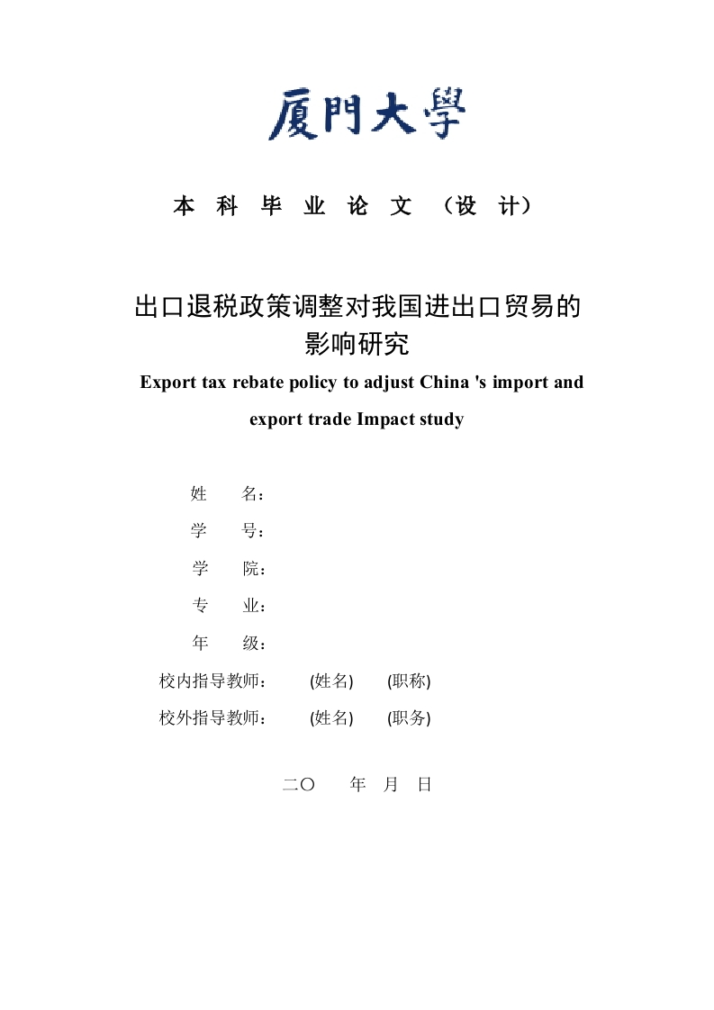 厦門大學本科毕业论文(设计)出口退税政策调整对我国进出口贸易的影响研究Export tax rebate policy to adjust China 's import andexport trade Impact study姓名:学号:学专业:年级:校内指导教师:(姓名)(职称)校外指导教师:(姓名)(职务)年月日厦门大学本科学位论文诚信承诺书本人呈交的学位论文是在导师指导下独立完成的研究成果。本人在论文写作中参考其他个人或集体已经发表的研究成果,均在文中以适当方式明确标明,并符合相关法律规范及《厦门大学本科毕业论文(设计)规范》。学生声明(签名):年月日