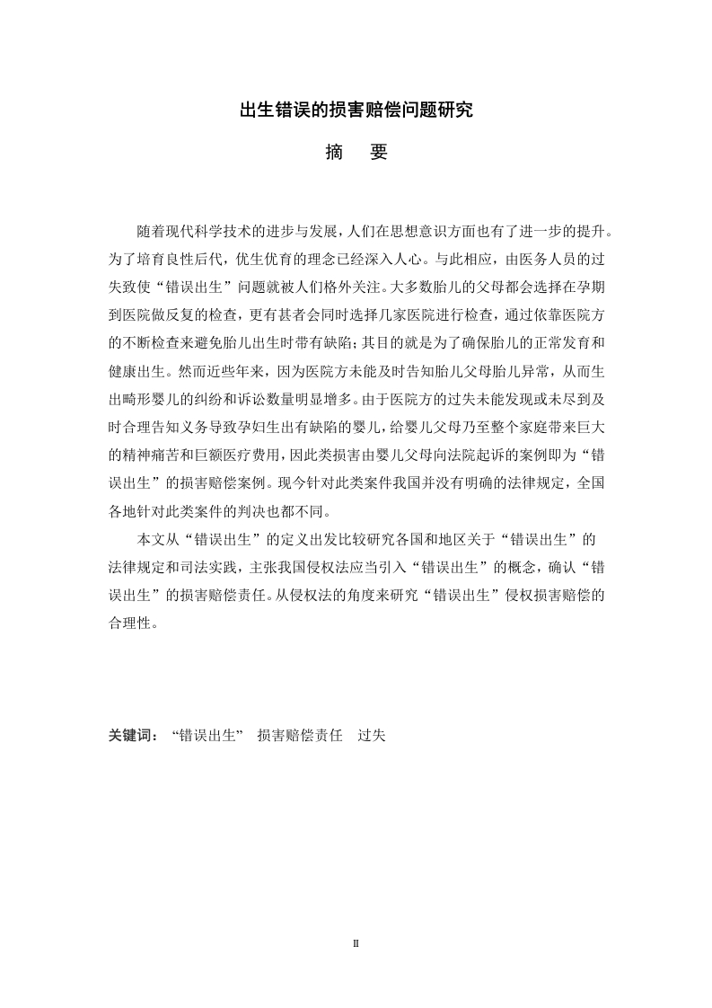 出生错误的损害赔偿问题研究摘要随着现代科学技术的进步与发展,人们在思想意识方面也有了进一步的提升。为了培育良性后代,优生优育的理念已经深入人心。与此相应,由医务人员的过失致使“错误出生”问题就被人们格外关注。大多数胎儿的父母都会选择在孕期到医院做反复的检查,更有甚者会同时选择几家医院进行检查,通过依靠医院方的不断检查来避免胎儿出生时带有缺陷:其目的就是为了确保胎儿的正常发育和健康出生。然而近些年来,因为医院方未能及时告知胎儿父母胎儿异常,从而生出畸形婴儿的纠纷和诉讼数量明显增多。由于医院方的过失未能发现或未尽到及时合理告知义务导致孕妇生出有缺陷的婴儿,给婴儿父母乃至整个家庭带来巨大的精神痛苦和巨额医疗费用,因此类损害由婴儿父母向法院起诉的案例即为“错误出生”的损害赔偿案例。现今针对此类案件我国并没有明确的法律规定,全国各地针对此类案件的判决也都不同。本文从“错误出生”的定义出发比较研究各国和地区关于“错误出生”的法律规定和司法实践,主张我国侵权法应当引入“错误出生”的概念,确认“错误出生”的损害赔偿责任。从侵权法的角度来研究“错误出生”侵权损害赔偿的合理性。关键词:“错误出生”损害赔偿责任过失Research on the compensation for the wrong birthABSTRACTWith the progress and development of modern science and technology,people havefurther promotion in ideology.In order to cultivate benign offspring,the concept ofeugenics has been deeply rooted.Accordingly,the fault of the medical personnelcauses the problem of"wrong birth"to be paid attention to.Most fetal parents willchoose to go to the hospital during pregnancy to do repeated tests,but also chooseseveral hospitals to check,by relying on the hospital side of the continuous inspectionto avoid birth defects,the purpose is to ensure fetal normal development and healthybirth.In recent years,however,the number of disputes and lawsuits involvingmalformed infants has increased markedly because the hospital has failed to informfetal parents of fetal abnormalities in time.Because the negligence of the hospital sidefails to discover or do not fulfil the obligation of timely and reasonable informing thepregnant woman to produce the defective baby,causes great mental anguish and hugemedical expenses to the infant parents and even the whole family,so the case that theclass damages is sued by the infant parents to the court is the "wrong birth"case ofdamages.There are no clear legal provisions for such cases in our country,and thejudgments against such cases are different throughout the country.Based on the definition of"false birth",this paper studies the legal provisions andjudicial practice of"false birth"in various countries and regions,and advocates thatthe concept of"false birth"should be introduced into the tort law of China,and theliability of"wrongful birth"should be confirmed.From the angle of tort law,thispaper studies the rationality of"false birth"tort damages.Key Words:Wrong birth Damages liability fault上海外国语大学贤达经济人文学院毕业论文(设计)出生错误的损害赔偿问题研究出生错误的损害赔偿问题研究目录绪论21.1“错误出生"的定义312“错误出生”、“错误怀孕”、“错误生命”的区别31.21“错误出生”与“错误怀孕”的辨析.1.22“错误出生”与“错误生命”的辨析.2各国和地区关于“错误出生”的法律规定和司法实践..42.1英美法系国家2.2大陆法系国家622.2我国台湾地区.…2.3.1“错误出生”的赔偿诉讼案件623.2“血友病遗传基因诊断”纠纷案件23.3我国对”错误出生”的态度.93“错误出生”损害赔偿的界定和范围93.1“错误出生”损害赔偿的界定…932.1财产损害4对我国完善相关法律、法规的建议.…参考文献…
