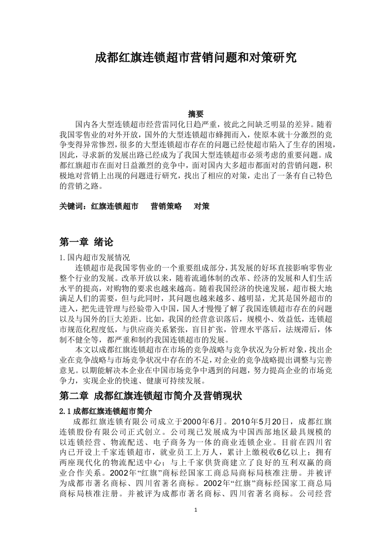 成都红旗连锁超市营销问题和对策研究摘要国内各大型连锁超市经营雷同化日趋严重,彼此之间缺乏明显的差异。随着我国零售业的对外开放,国外的大型连锁超市蜂拥而入,使原本就十分激烈的竞争变得异常惨烈,很多的大型连锁超市存在的问题已经使超市陷入了生存的困境,因此,寻求新的发展出路已经成为了我国大型连锁超市必须考虑的重要问题。成都红旗超市在面对日益激烈的竞争中,面对国内大多超市都面对的营销问题,积极地对营销上出现的问题进行研究,找出了相应的对策,走出了一条有自己特色的营销之路。关键词:红旗连锁超市营销策略对策第一章绪论1.国内超市发展情况连锁超市是我国零售业的一个重要组成部分,其发展的好坏直接影响零售业整个行业的发展。改革开放以来,随着流通体制的改革、经济的发展和人们生活水平的提高,对购物的要求也越来越高。随着我国经济的快速发展,超市极大地满足人们的需要,但与此同时,其问题也越来越多、越明显,尤其是国外超市的进入,把先进管理与经验带入中国,国人才慢慢了解了我国连锁超市存在的问题以及与国外的巨大差距。比如,我国的经营意识落后,规模小、效益低,连锁超市规范化程度低,与供应商关系紧张,盲目扩张,管理水平落后,法规滞后,体制不健全等,都严重和制约我国连锁超市的发展。本文以成都红旗连锁超市在市场的竞争战略与竞争状况为分析对象,找出企业在竞争战略与市场竞争状况中存在的不足,对企业的竞争战略提出调整与完善意见。以期能解决本企业在中国市场竞争中遇到的问题,努力提高企业的市场竞争力,实现企业的快速、健康可持续发展。第二章成都红旗连锁超市简介及营销现状2.1成都红旗连锁超市简介成都红旗连锁有限公司成立于2000年6月。2010年5月20日,成都红旗连锁股份有限公司正式创立。公司现已发展成为中国西部地区最具规模的以连锁经营、物流配送、电子商务为一体的商业连锁企业。目前在四川省内已开设上千家连锁超市,就业员工上万人,累计上缴税收6亿以上:拥有两座现代化的物流配送中心;与上千家供货商建立了良好的互利双赢的商业合作关系。2002年“红旗”商标经国家工商总局商标局核准注册。并被评为成都市著名商标、四川省著名商标。2002年“红旗”商标经国家工商总局商标局核准注册。并被评为成都市著名商标、四川省著名商标。公司经营业绩跨入全国商业企业百强:中国连锁百强企业、中国百家快速消费品连锁零售企业、中国服务业企业500强、中国零售业区域明星企业、中国连锁业最佳本土品牌奖、四川企业100强、四川商业企业最大规模10强、全国食品商品流通百强骨干企业:荣获中国消费者协会全国商业服务业“诚信单位”、全国“最具成长性企业”、全国商务系统先进集体:四川省现代流通先进企业、四川省优势商业零售企业、成都市民营企业50强、成都市再就业工作先进集体、成都市纳税先进企业等荣誉。红旗连锁的健康发展,为推进现代流通业的发展及川内经济建设起到了积极作用。成都红旗连锁有限公司的前身是成立于1969年的四川地区最大的副食品零售企业、成都三大老牌商场之一的国营成都市红旗商场。上世纪九十年代,红旗商场为了谋求发展,以超前的眼光成立了红旗商场批发公司直销商场,将分场开到各大小区内,成为当时并不多见的社区连锁超市。2000年6月,红旗商场批发公司在曹世如的带领下,脱离红旗商场实施改制,单独组建了民营的红旗连锁有限公司。2002年3月,红旗连锁有限公司成功注册了相关类别的“红旗”商标。同时被评为成都市著名商标、四川省著名商标。2005年3月,红旗连锁有限公司通过曲线方式收购了成都红旗商场(集团)有限公司。2010年5月20日,成都红旗连锁股份有限公司正式创立.2012年4月,红旗连锁网购商城将上线。2012年4月23日,红旗连锁网购商城正式上线。2.2红旗连锁超市的发展现状红旗连锁以“服务大众、方便人民”为服务宗旨,以“诚信经商、便民利民”为经营宗旨,以“方便、实惠、放心”为经营理念,以“红旗连锁一一您的好邻居”为市场定位,以“统一形象、统一采购、统一价位、统一服务、统一考核、统一配送”的“六统一”为经营管理模式,以“忠于职责、廉洁奉公、为人正派、胸怀大局”为管理干部的行为准则,树立“热情、真诚、团结、敬业”的红旗精神。在发展过程中,公司完善了西河、簇桥两大物流配送中心,占地10万余平方米:日配货量近2000吨:可支撑60亿元以上的年商品销售额。现已发展成为中国西部地区最具规模的以连锁经营、物流配送、电子商务为一体的商业连锁企业。目前在四川省内己开设上千家连锁超市,就业员工上万人:拥有两座现代化的物流配送中心:与三千多家供货商建立了良好的互利双赢的商业合作关系。2009年,营业收入24.86亿元,2010年,营业收入27.65亿元,2011年,营业额则达到34.5亿元,总资产则达到15.5亿元。第三章成都红旗连锁超市营销存在的问题3.1良好的地理位置并没有带来良好的利润大型连锁超市在地理位置选择方面谨慎细致,力求占尽地利优势。通常大型连锁超市多处于交通便利的地区,拥有稳定的客源和一定规模的客流量。目前红旗连锁超市占地面积在3000平方米以上的大型店面营业情况并不是十分理想,商品品种齐全,