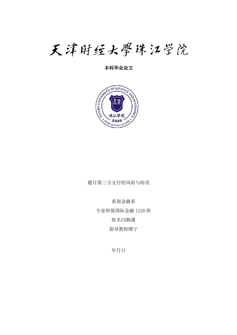 本科毕业论文2006题目第三方支付的风险与防范系别金融系专业班级国际金融1220班姓名闫颖譞指导教师缪宁年月日内容摘要现今,人们购物、交费等都通过第三方支付平台进行。随着第三方支付的大规模应用,其带来的各类风险也是不容忽视的。互联网第三方支付服务的出现,为网络交易提供了安全保障和信用支持。然而第三方支付过程中发生的各类案件屡见不鲜。本文首先介绍了概述了第三方支付意义,其次介绍了其优缺点以及发展状况。并且通过对中美两大第三方支付平台一一Paypal、支付宝从发展、支付环境、运作模式和监管这四方面的详细比较。从而指出第三方支付所面临的风险,并根据各类风险给出了详细的防范措施。关键字:第三方支付:风险:防范2AbstractNowadays,People shop and pay fee via three-party payment.As the large-scaleapplication of three-party payment,it is inevitable that it will cause kind ofrisks.Three-party service offer safe guarantee and credit support to internettransaction.However,it is normal that lots of cases happen when people are payingby three-party payment.In this article,firstly,it introduce the meaning ofthree-party payment,and then telling the advantages and disadvantages and itsdevelopment situation.What's more the article indicate the risks of three-partypayment and provide the solution which can tackle the problem through thecomparison of the three-party payment in China and US-Zhifubao and Paypal fromdevelopment,paying environment,operation mode and supervise.Key word:Three-party payment;Risks;Precaution3