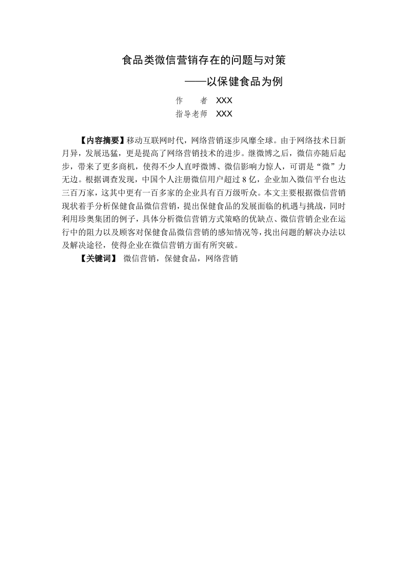 食品类微信营销存在的问题与对策—以保健食品为例作者XX指导老师XX【内容摘要】移动互联网时代,网络营销逐步风靡全球。由于网络技术日新月异,发展迅猛,更是提高了网络营销技术的进步。继微博之后,微信亦随后起步,带来了更多商机,使得不少人直呼微博、微信影响力惊人,可谓是“微”力无边。根据调查发现,中国个人注册微信用户超过8亿,企业加入微信平台也达三百万家,这其中更有一百多家的企业具有百万级听众。本文主要根据微信营销现状着手分析保健食品微信营销,提出保健食品的发展面临的机遇与挑战,同时利用珍奥集团的例子,具体分析微信营销方式策略的优缺点、微信营销企业在运行中的阻力以及顾客对保健食品微信营销的感知情况等,找出问题的解决办法以及解决途径,使得企业在微信营销方面有所突破。【关键词】微信营销,保健食品,网络营销论文目录(一)研究背景(二)研究意义1二、文献综述..(一)国外研究现状(二)国内研究现状..1三、保健食品微信营销概述2(一)微信平台概述234四、珍奥集团微信营销现状分析.…5(一)珍奥集团简介·5(二)珍奥集团微信营销现状分析...5(三)保健食品微信营销存在的问题.·6五、提升保健食品微信营销效果的建议(一)匹配合理的营销策略7(二)构建立体化营销模式...7(三)塑造良好的品牌形象7(四)妥善保管用户的隐私.8六、结语8一、前言(一)研究背景随着互联网技术的快速发展以及智能手机的普及,移动网民数量增长迅速,广大的社会群众与互联网的联系越来越紧密。根据产业内研究院发布的数据,国内手机用户数量超过12亿,移动互联网的发展已形成井喷式发展,用户比率达百分之八十点九之高。互联网的崛起带动了微信的变化,微信这种通讯软件迟早将走在QQ、飞信等手机通讯软件,成为当之无愧的即时通讯新秀。据了解,微信app于2012年8月正式上线,其点对点的精准推送和与QQ一样强大的交流功能吸引了人们的关注,同时也为企业网络营销提供了新的途径。(二)研究意义在微信不断普及的背景下,进入大众视野的自然会有微信营销模式,这是一种精准的营销,随着营销理念和营销模式的不断成熟,这将使企业获益颇多。本文主要以保健食品为中心,以微信营销为支撑点,分析其利弊以及现状,只为更好找出保健食品的营销模式、让微信营销能够在互联网文化兴起背景下发挥最大的价值,为企业创造更大利益。二、文献综述(一)国外研究现状调查发现,国外没有大范围的推广微信而且其中的微信研究很少,国外主要针对线上传统4P、4C、4R理论,并且更多营销模式都还在不断变化,探寻合适发展策略。追溯到2012年微信上市,就国外而言,最初开始接触并使用微信通讯功能的并不多,主要用途为聊天、通话,随着微信市场拓宽,推广力最大的当属东南亚地区,使用率最高的是马来西亚,当然中东地区也有,比如巴基斯坦、印度。相较于普通用户聊天、通话,商务人士更倾向于使用微信进行交易,尤其是与中国外商打交道时。(二)国内研究现状腾讯旗下的微信是目前不可忽视互联网产品,在各种媒体各界和深度微信用户看来,微信似乎带来了新的互联网商业模式,对现有互联网模式与互联网结合的传统企业产生了深远影响。微信营销方式聚集人的方法和传播信息的途径与现