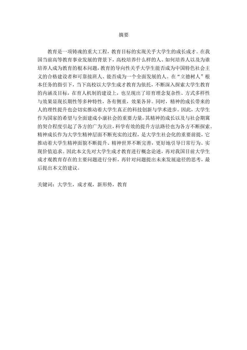 摘要教育是一项铸魂的重大工程,教育目标的实现关乎大学生的成长成才。在我国当前高等教育事业发展的背景下,高校培养什么样的人、如何培养人以及为谁培养人成为教育的根本问题,教育的导向性关乎大学生能否成为中国特色社会主义的合格建设者和可靠接班人、能否成为一个全面发展的人。在“立德树人”根本任务的指引下,当下高校以大学生成才教育为依托,不断深入探索大学生教育的内涵及目标,在育人机制的建设上,也呈现出了培育理念复杂性、方式多样性与效果显现长期性等多种特性,各有侧重,效果各异。同时,精神的成长带来的人的理性提升也会切实推动着大学生真正的科技创新与学术进步。因此,大学生作为国家的希望与全面建成小康社会的重要力量,其精神的成长以及与社会期冀的契合程度引起了各方的广为关注,科学有效的提升方法路径也为各方不断探索。精神成长作为大学生精神层面不断充实的过程,是大学生社会化的重要前提,它推动着大学生精神面貌不断提升、精神世界不断完善,更好地引导日常行为、实现价值追求。因此本文先对大学生成才教育进行概念论述,再对我国目前大学生成才观教育存在的主要问题进行分析,再针对问题提出未来发展途径的思考,最后提出本文的建议。关键词:大学生,成才观,新形势,教育目录1绪论.31.1研究背景….31.2研究意义…1.3研究现状….41.3.1国内研究现状1.3.2国外研究现状.…62大学生成才观教育概述.2.1大学生成才观教育的内涵.2.2大学生成才观教育的主要内容…2.3大学生成才观教育的意义…83大学生成才观教育存在的主要问题.…3.1成才教育培育理念缺乏突破.3.2成才教育培育方法较为单一.83.3人才培育成果与社会需求并不完全统3.4学生自身重视程度不够.94媒体环境下大学生成才观教育途径思考..941大学生提升自我素养,充分发挥主体作用94.1.1构建相关网站,提升大学生政治及思想道德素养94.1.2重视大学生主体作用,充分发挥主观能动性104.2优化新形势下大学生成才观教育社会大环境…114.2.1家庭教育4.2.2社会教育.…11新形势下当代大学生成才观教育的思考1绪论1.1研究背景21世纪充满了机遇和挑战,世界各国各地区的发展都建立在知识经济的基础上。在人力资源配置逐步趋向社会化、全球化的今天,人才所起的作用越来越大,已成为经济发展和社会进步最重要的资源和强劲的推动力。中国有超过13亿的人口,是一个人力资源大国。2003年,我国首次召开人才工作会议,《中共中央国务院关于进一步加强人才工作的决定》(中发[2003]16号)中指出:实施人才强国战略是党和国家一项重大而紧迫的任务。并强调“树立科学的人才观。人才存在于人民群众之中。只要具有一定的知识或技能,能够进行创造性劳动,为推进社会主义物质文明、政治文明、精神文明建设,在建设中国特色社会主义伟大事业中作出积极贡献,都是党和国家需要的人才。要坚持德才兼备原则,把品德、知识、能力和业绩作为衡量人才的主要标准,不唯学历、不唯职称、不唯资历、不唯身份,不拘一格选人才。鼓励人人都作贡献,人人都能成才”。中共中央国务院进一步明确,人才问题是关系到党和国家事业发展的关键问题,人才资源是最重要的战略资源,适应国内外形势的发展变化,完善社会主义市场经济体制等,关键在于人才。而大学生是中国特色社会主义事业的建设者和接班人,是全面建成小康社会、实现中华民族伟大复兴中国梦的创造者和实现者。大学生的成长成才,事关党和人民伟大事业的实现,事关中华民族能否屹立于世界民族之林,更关乎大学生个人日后能否有意义的发展。大学生成长成才的重要性使得成才问题吸引了国家、社会及高校等各方的广泛关注,教育培养目标以及如何开展教育活动也受到了各方的高度重视。成才教育作为一种重要的育人理念出现在高校的教育视线内并在高校中广为传播,如清华大学“培养具有为国家社会服务之健全品格的人才”的理念、武汉理工大学实施的“责任、诚信、成才”教育、西南交通大学“有社会担当和健全人格,有职业操守和专业才能,有人文情怀和科学素养,有历史眼光和全球视野,有创新精神和批判思维”的“五有”培养目标等。成才教育是一个系统的育人工程,其实施具有理念复杂性、方式多样性与时间长期性等多种特性。如何更好地开展成才教育,方式方法从提出至今就在不断探索的道路上。自从上个世纪九十年代初高等学校毕业生就业制度改革以来,大学生成才问题越来越受到高等教育者、受教育者的共同关注。研究发现,目前,在对待大学生成才的问题上,许多高校教育工作者、学生家庭成员和社会就业单位不同程度地存在着几种认识误区:一是认为大学生成人就能够成才,成才就等于成人,因此,忽略了当代大学生在人格、心理、情商和人际关系等方面的缺陷,使大学的成才教育处于盲目和拔苗助长的状态。二是认为大学学历就等于高素质,因此,忽略了人才所需要的能力培养。三是认为学生过级考证就等于学校的声誉和教育的社会价值。因此,在高等学校普遍存在教育短视化现象。四是认为对学生施教传道虚无,而对学生施教授业真实,因此,在高等学校普遍存在德育弱化或德育课程化的现象。上述四种认识误区说明,无论是高校,还是社会单位,不管是教育工作