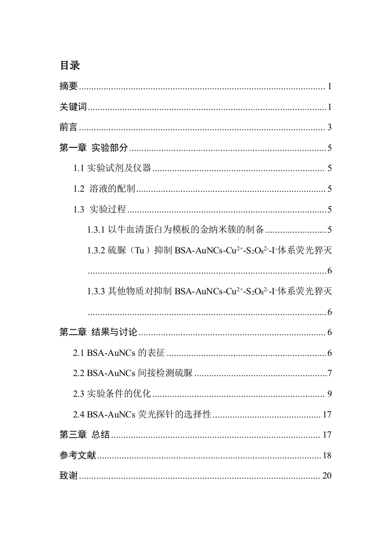目录摘要关键词前言3第一章实验部分51.1实验试剂及仪器1.2溶液的配制51.3实验过程…1.3.1以牛血清蛋白为模板的金纳米簇的制备1.3.2疏脲(Tu)抑制BSA-AuNCs-Cu2+S2Og2体系荧光猝灭.61.3.3其他物质对抑制BSA-AuNCs-Cu2+-S2Og2-I体系荧光猝灭第二章结果与讨论62.1BSA-ANCs的表征2.2BSA-AuNCs间接检测硫脲>2.3实验条件的优化.…92.4BSA-AuNCs荧光探针的选择性第三章总结17参考文献18致谢20苏州大学本科生毕业论文基于荧光金纳米簇的高灵敏度疏脲检测摘要近年来随着纳米技术的发展,纳米材料作为一种新型荧光材料被广泛运用到分析领域山。目前已研究发现的荧光纳米材料主要包括以下几种:有机染料、聚合物点、碳量子点、半导体量子点、荧光金属纳米簇(FM NCs)等2-]。金纳米簇是一种尺寸小于3m的一种新型荧光材料,因其具有易合成、光稳定性高、低毒性等突出优势,被广泛用于各种目标物的检测。在本论文中,我们以牛血清蛋白为模板合成荧光金纳米簇。研究发现在向金纳米簇中加入碘离子、过硫酸盐以及铜离子时,其荧光发生明显的猝灭:如果同时加入硫脲,荧光发生恢复。通过荧光金纳米簇的恢复程度,可以实现对硫脲的灵敏检测。在最佳条件下,荧光的猝灭程度与硫脲的浓度呈一定的线性关系,其线性范围是0.24.0M,检测限可达0.03uM,有望实现实样检测。关键词:金纳米簇,荧光增强,过硫酸盐,碘离子,铜离子,硫脲苏州大学本科生毕业论文AbstractIn recent years,with the development of nanotechnology,nanomaterials have been widely used in the analysis field as a kind ofnovel fluorescent material.The fluorescent nanomaterials that have beenstudied so far include mainly organic dyes,polymer dots,carbon quantumdots,semiconductor quantum dots,fluorescent metal nanoclusters (FMNCs)and so on.Gold nanoclusters are a novel fluorescent material with asize of less than 3 nm.They are widely used for the detection of varioustargets due to their outstanding advantages such as easy synthesis,highlight stability,and low toxicity.In this paper,we synthesize fluorescent gold nanoclusters usingbovine serum albumin as a template.When iodide,persulphate,andcopper ions are added to gold nanoclusters,the fluorescence issignificantly quenched.However,when thiourea is added at the sametime,the fluorescence was recovered.Under an optimized condition,theextent of quenching was found linearly related to thiourea concentrationin the range of 0.2-4.0 uM,and thiourea as low as 0.03 uM could bedetected.This method is expect to implement real sample testing.Keywords:Gold nanoclusters;Fluorescence enhancement:Iodine;Copper ions:Thiourea