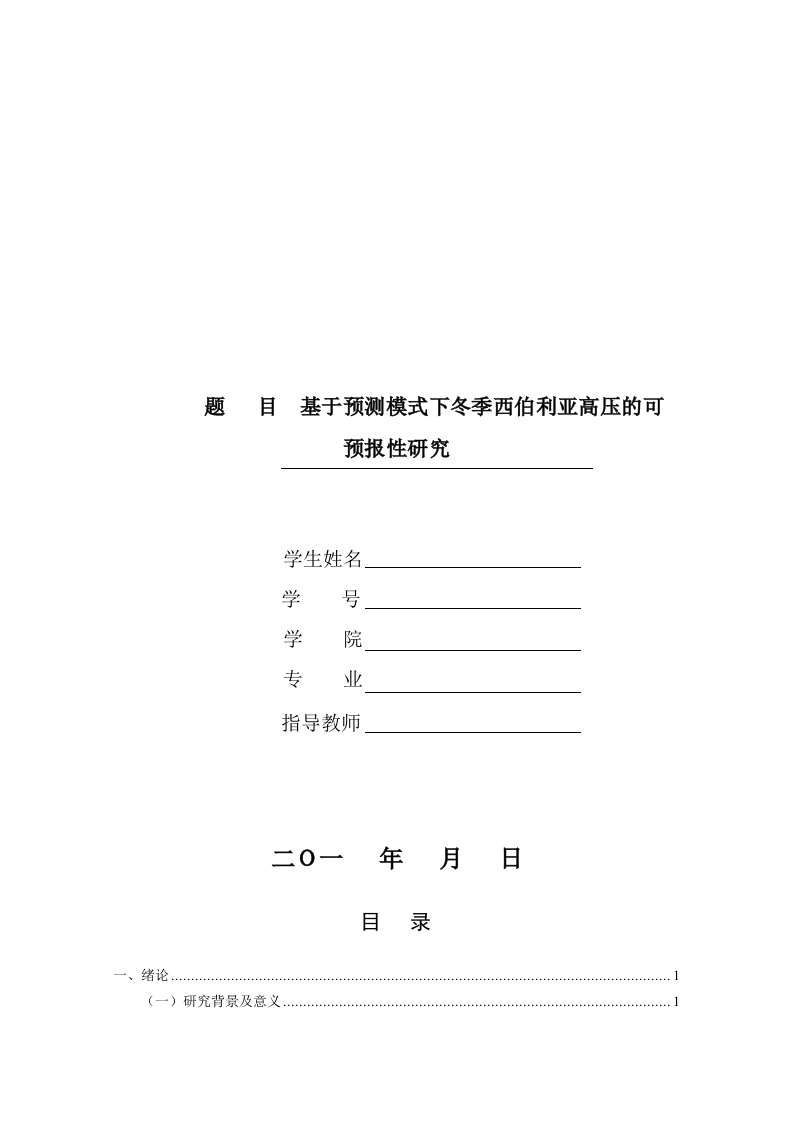 题目基于预测模式下冬季西伯利亚高压的可预报性研究学生姓名学号学院专业指导教师二0一年月日目录(一)研究背景及意义1(二)国内外研究进展.…1.西伯利亚高压形成和发展机制的研究.…2.西伯利亚高压对天气和气候的影响.23.影响西伯利亚高压变化的因子..3二、冬季西伯利亚高压的主要年际变化模态…4(一)数据来源和方法介绍2.方法介绍…4(二)冬季西伯利亚高压的变化…(三)PC1的年际变化与大气环流的关系5(四)PC2的年际变化与大气环流的关系..6(五)PC3的年际变化与大气环流的关系7三、冬季西伯利亚高压的主要年际变化模态对东亚气温的影响8(二)冬季西伯利亚高压的主要年际变化模态影响东亚气温的物理机制…9四、冬季西伯利亚高压与北大西洋涛动指数的滑动T检验…10(一)检验方法…2.曼-肯德尔(Mann-Kendal)检验..10(二)冬季西伯利亚高压与北大西洋涛动指数的滑动T检验…11参考文献:…基于预测模式下冬季西伯利亚高压的可预报性研究XXX(作者姓名,居中、宋体、四号)南京信息工程大学X学院,江苏南京210044(作者单位,居中、宋体、小五号)摘要:本文利用NCEP/NCAR月均海平面气压再分析资料,对西伯利亚高压从1979一2017年共38个冬季(12月至次年2月)进行经验正交函数分解(Empirical0 r thogonalFunction,EOF)。结论认为,第1模态呈现区域内变化一致性,第2模态呈现区域内南北气压变化特征为反相形态,第3模态呈现区域内东西气压变化特征为反相形态,并且这三个模态变化过程中的时间序列表现出了突出的年际规律。之后又对大气环流及具有密切关联的东亚气温异常进行一体化的综合研究,第1模态条件下大气环流从三个层面进行影响观察,其中地面体现在海陆气压差的变化,500hPa体现在东亚大槽强度出现的变化,200Pa纬向风场上两个不同气候带急流强度改变,即温带和副热带,同时西伯利亚高压负向位时,东亚气温变化特征会偏暖,而当处在正向位时,东亚地区气温特征为偏冷:第2模态的变化特征与北极涛动、北大西洋涛动间存在着较大关联,在高度上表现为南北环状模态,且气压特征是准正压,当西伯利亚高压变化特征为北强南弱,其对应的环状模态与A0正相位存在较大一致性,温带急流曲线趋向削弱,而东亚偏暖,同时如果其特征为北弱南强,这一阶段东亚气温变化会偏冷:第3模态存在相关性作用的欧亚大陆局部大气环流,与北大西洋涛动存在希并不明显的间接关联,西伯利亚高压东强西弱的气压差变化情况时,东亚北部气温变化会趋暖,而西南部气温变化会趋冷,当气压差变化为东弱西强,东亚北部气温变化会趋冷,西南部气温变化会趋暖。关键词:西伯利亚高压:年际变化模态:北大西洋涛动:东亚气温
