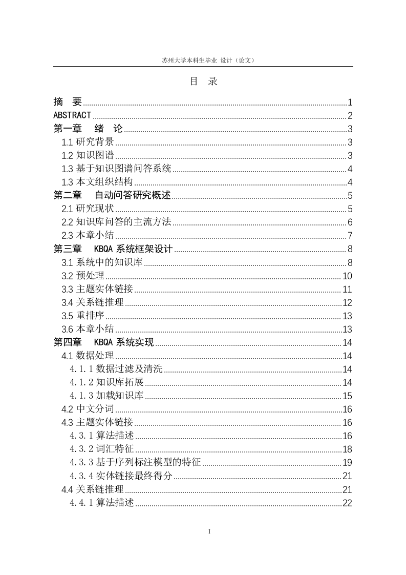 苏州大学本科生毕业设计(论文)目录摘要ABSTRACT第一章绪论1.1研究背景31.2知识图谱31.3基于知识图谱问答系统41.3本文组织结构第二章自动问答研究概述.52.1研究现状2.2知识库问答的主流方法62.3本章小结7第三章KBQA系统框架设计83.1系统中的知识库3.2预处理…103.3主题实体链接113.4关系链推理123.5重排序133.6本章小结.13第四章KBQA系统实现144.1数据处理144.1.1数据过滤及清洗144.1.2知识库拓展144.1.3加载知识库154.2中文分词.…164.3主题实体链接164.3.1算法描述164.3.2词汇特征184.3.3基于序列标注模型的特征194.3.4实体链接最终得分214.4关系链推理214.4.1算法描述22苏州大学本科生毕业设计(论文)4.4.2基于字粒度的匹配度234.4.3基于词粒度的匹配度254.4.4遇到的问题264.5问句输入输出264.6实验结果274.7本章小结28第五章总结与展望295.1本文总结295.2展望30参考文献31致谢苏州大学本科生毕业设计〔论文)摘要在当今社会,随着信息技术的飞速发展,人们对于信息准确化的需求越来越高,各种各样的信息获取方式层出不穷,传统的以关键词匹配以及文档检索为基础的搜索方法需要一场变革。现在很多研究者在信息检索中逐渐加入基于知识库的自动问答技术。同时,基于知识库的问答具有更简洁、更高效、更直接和更准确的特点,可以很好的提高获取信息的效率。目前关于中文知识库问答的研究还远远不足。由于中文表达的多样性以及中文句法结构的复杂性,中文知识库问答是一个非常有挑战性的工作。作者因为上述原因选择知识库问答的研究课题。本文主要研究工作如下:1)使用一种基于排序的实体链接方法。这种方法利用词汇特征和基于序列标注模型的语义特征。其中的基于序列标注模型的语义特征有效克服了知识库中实体构词特征稀疏以及无法利用知识库的实体词典等之前无法解决的问题。更适合中文问句主题实体链接。2)使用一种基于匹配度计算的关系链推理方法。这种方法从两个方面去描述问句与候选关系链的匹配程度。在字粒度上,使用char-based F1BLEU方法,在基于知识库的问答中,我们可以把问句泛化后得到的pattern看做参考译文,候选关系链看做预测译文。在词粒度上,先把问句以及对应的候选关系链用向量表示,然后计算问句和候选关系链的余弦相似度。3)构建了一个基于知识图谱的中文开放领域知识库问答系统。关键词:知识图谱:关系链推理:实体链接:问句分类:相似度计算:自然语言处理作者:马进指导教师:陈文亮1