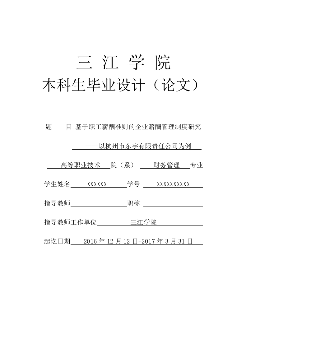 三江学院本科生毕业设计(论文)题目基于职工薪酬准则的企业薪酬管理制度研究以杭州市东宇有限责任公司为例高等职业技术院(系)财务管理专业学生姓名XXXXXX学号XXXXXXXXXX指导教师职称指导教师工作单位三江学院起讫日期2016年12月12日-2017年3月31日摘要批注[Administratorl]:小对全文内容的高度概括,需要精炼语言,不要直接从文章中摘出几句或只是重复一遍结论。企业中的竞争,其实是人才竞争,所以企业薪酬管理制度是一项很重要的内容,它不仅仅是对人们付出的简单地认可和肯定,更加是企业价值体系建设地强有力的支撑以及战略规划的落地的有效保障。能建立一套公平、合理、科学的薪酬管理制度,不但能为企业招揽许多人才,还能提高老职工的工作积极性,进一步提高企业总体的经营效益。通过对杭州市东宇有限责任公司薪酬管理的理念、企业现行管理制度进行了深入、具体的调查、分析和研究,概括出了几条可供企业参考借鉴的思路和方法,同时也客观地总结出了企业的薪酬管理制度目前所存在的一些需要改进的不足之处,其存在的若干问题并得出了相应的一些对策和建议。关键词:职工:职工薪酬;人才竞争:薪酬管理制度批注Administrator2:为了便于作文献索引和检索而选取的能反映论文主题内容的词或词组,一般37个,以分号隔开ABSTRACTEnterprise in the competition,in fact,is the competition for talent,so the enterprisesalary management system is a very important part.It is not only the people paysimply recognized and affirmed,more is enterprise value system construction ofstrong support and strategic planning landing effective protection.To establish a fair,reasonable and scientific compensation management system,not only can attractmany people for the enterprise,but also improve the enthusiasm of the work of the oldworkers,and further improve the overall management efficiency of enterprises.Theconcept of Hangzhou City Dong woo limited liability company compensationmanagement,the existing enterprise management system were a deep and detailedinvestigation,analysis and research,summarizes several reference for enterprise ideasand methods,and objectively summed up the enterprise salary management system atpresent,the existence of some need to improve deficiencies,the existing problems anddraw the some corresponding countermeasures and suggestions.Key words:Staff And Workers;Staff Salary;Talent Competition;Salary ManagementSystem