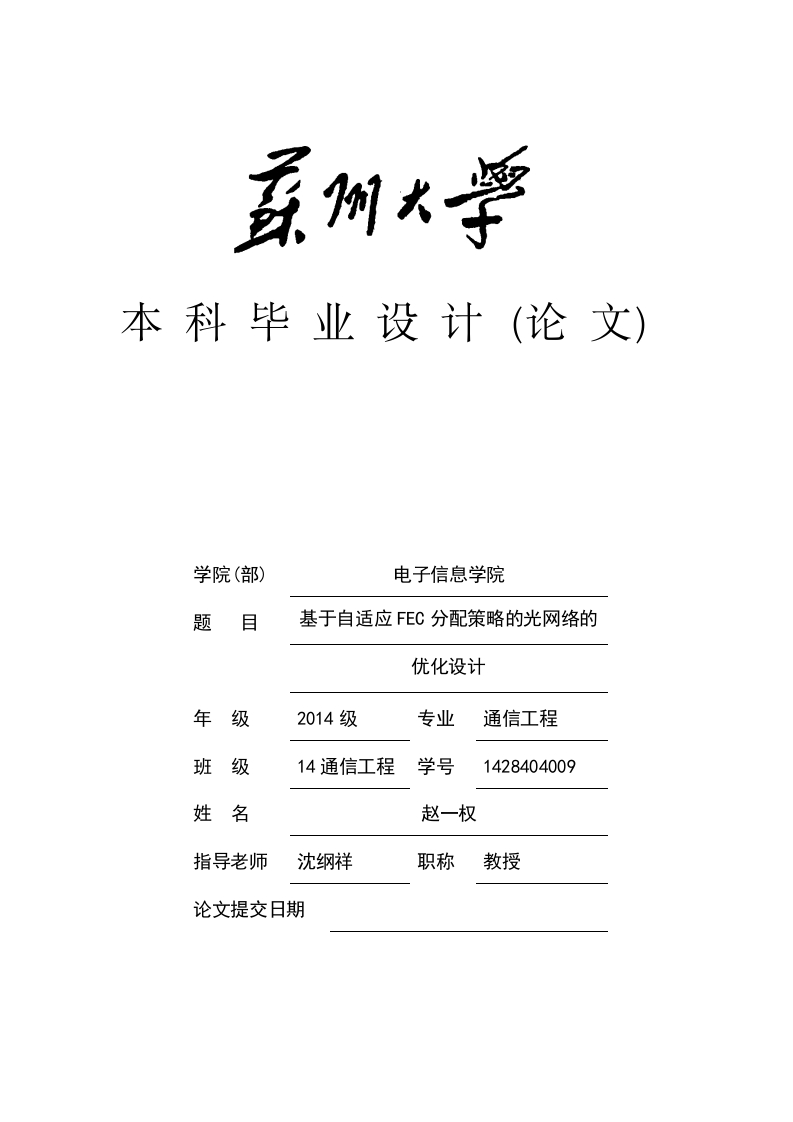本科毕业设计(论文)学院(部)电子信息学院题目基于自适应FEC分配策略的光网络的优化设计年级2014级专业通信工程班级14通信工程学号1428404009姓名赵一权指导老师沈纲祥职称教授论文提交日期目录Abstract...2第一章绪论31.1研究背景..1.2本文研究内容和章节安排第二章网络模型..62.3光通道0SNR评估模型..6103.1基于调制格式不可调的EC自适应选择策略…103.2基于调制格式可调的EC自适应选择策略·123.3启发式算法...13第四章结果和性能分析..·15第五章总结与展望19参考文献..2022苏州大学本科生毕业设计(论文)摘要前向纠错编码(FEC)技术由于可以用于补偿光信噪比(OSNR)的恶化,被广泛应用于光传输系统。通常,为满足所有光通道需求,网络会选择同一类型性能最高的FEC,这将导致频谱资源的浪费。而且,在弹性光网络中,由于可以灵活的选择调制格式,这种固定的FEC选择策略将更严重的影响网络的频谱使用效率。因此,本文基于调制格式可调的弹性光网络,提出了一种自适应FEC分配策略,并为光通道路由,调制格式选择和频谱分配问题,提出了高效的启发式算法。仿真结果表明,FEC选择策略可以显著提高网络频谱使用效率。关键词:弹性光网络,前向纠错编码,光信噪比
