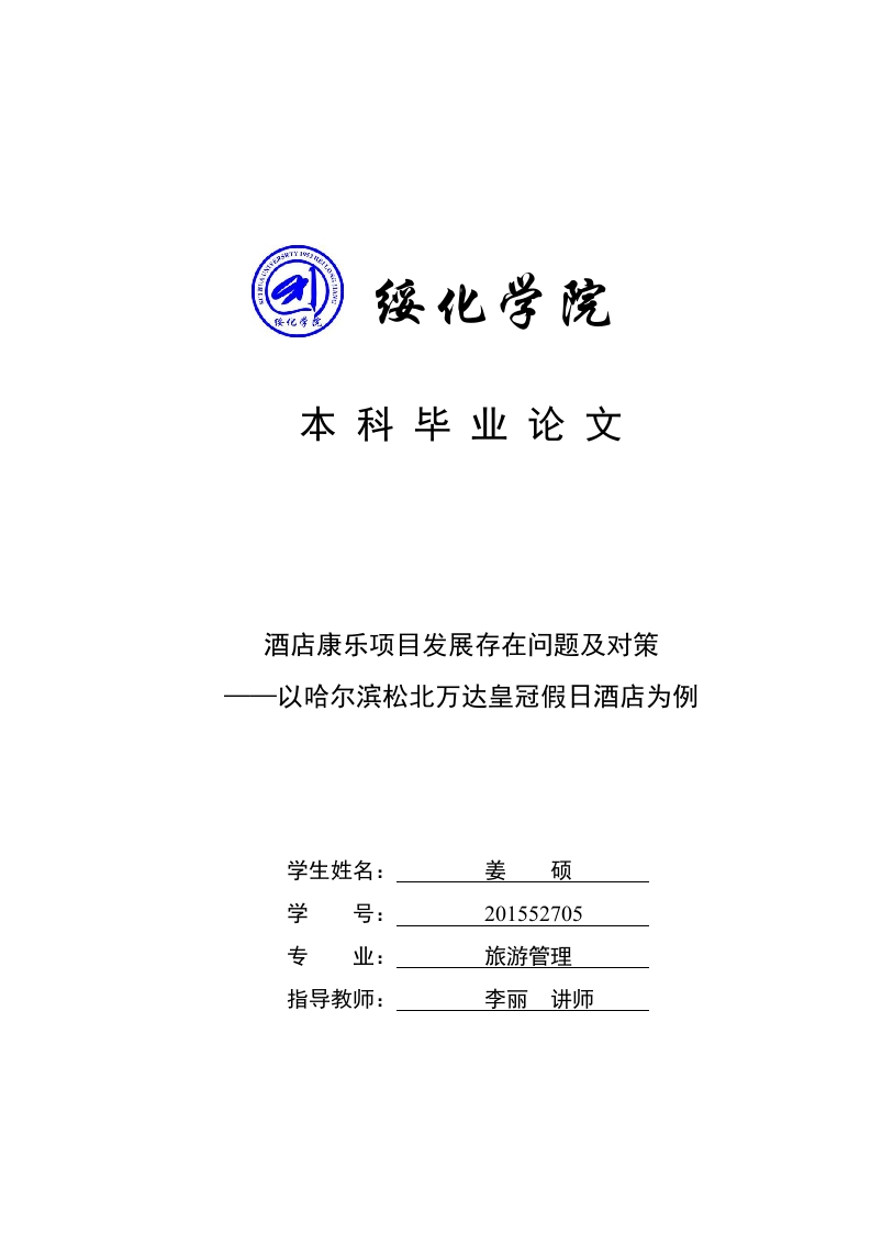 绥化学院本科毕业论文酒店康乐项目发展存在问题及对策一以哈尔滨松北万达皇冠假日酒店为例学生姓名:姜硕学号:201552705专业:旅游管理指导教师:李丽讲师Suihua University Graduation PaperThe Problems and Countermeasuress oftheDevelopment of the Hotel's RecreationalProject --Taking the Crown Holiday Inn ofSongbei Wanda in Harbin as an exampleStudent nameJiang ShuoStudent number201552705MajorTourism managementSupervising teacherLi Li LecturerSuihua University摘要近几年,国内康乐业发展快速,康乐部在各高星级酒店的地位越来越明显,特别是度假型的高星级酒店,酒店管理者更加重视对康乐部的发展和管理。虽然康乐部门在日益发展,但仍然存在不足,目前针对这方面的研究和探讨也相对薄弱。本文对哈尔滨松北万达皇冠假日酒店的康乐部门进行了实践调研,同时结合酒店的经营现状进行分析,通过对其康乐部的康乐项目设置、康乐品牌项目经营特色、康乐项目营收比例、康乐项目同行业竞争、顾客对康乐项目需求等方面调查研究,对哈尔滨松北万达皇冠假日酒店康乐部发展提出了建议,以期对我国酒店康乐部门的建设和发展有所帮关键词:哈尔滨松北万达皇冠假日酒店;康乐项目;现状分析;对策