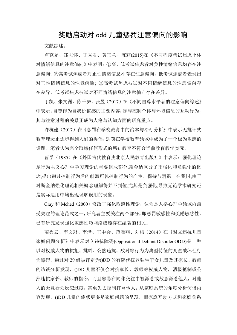 奖励启动对odd儿童惩罚注意偏向的影响文献综述:卢克龙、郑志怀、丁秀君、黄玉兰、陈莉(2015)在《不同程度考试焦虑个体对情绪信息的注意偏向》中表明:①高、低考试焦虑者对负性情绪信息均存在注意偏向;②高考试焦虑者对正性情绪信息不存在注意偏向,低考试焦虑者表现出对正性情绪信息的注意解除;③高考试焦虑被试对不同情绪信息的注意偏向存在差异,低考试焦虑被试对不同情绪信息的注意偏向存在差异。丁凯、张文渊、陈千癸、张昱(2017)在《不同自尊水平者的注意偏向综述》中表示:自尊作为自我价值感的主要内容,参与控制个体与环境信息的互动行为,其与注意过程的关系正成为人格与认知方面的研究重点。许杭建(2017)在《惩罚在学校教育中的治本与治标分析》中表示无批评式教育理念正逐步得到人们的提倡,惩罚在学校教育领域中成为了一个极为敏感的话题。笔者认为完全取缔任何形式的惩罚教育不符合当前教育教学实际。曹孚(1985)在《外国古代教育史北京人民教育出版社》中表示:强化理论是行为主义心理学学习理论的重要组成部分,斯金纳区分了正强化和负强化的概念,提出通过控制行为后的刺激可以控制行为的产生、保持与消退。在我国,由于对斯金纳强化理论相关概念理解得并不到位,尤其是负强化,导致无论学术研究还是实际运用中均出现误解误用的现象。Gray和Mched(2000)修改了强化敏感性理论,认为是人格心理学领域内最受关注的理论范式之一,研究者主要关注两个部分,即惩罚敏感性和奖励敏感性。已有研究发现强化敏感性巧网络成瘾存在湿著的相关。蔺秀云、李文琳、李泽、王中会、范腾燕、刘杨(2014)在《对立违抗儿童家庭问题分析》中表示对立违抗障碍(Oppositional Defiant Disorder,,ODD)是一种以对权威人物的抗拒、挑衅、公然违抗、敌对等行为为典型特征的儿童破坏性行为障碍。通过对29组被评定为0DD的有隔代抚养独生子女儿童及其家长、教师的访谈分析发现,ODD儿童不仅会对抗家长、教师等权威人物,消极抵制或公然违抗家长、教师的指令,而且容易在同伴交往中被激惹或故意激惹他人,对他人的无意行为反应过度,甚至失去控制打骂他人。从家庭系统的角度分析访谈内容发现,ODD儿童的症状更多是家庭问题的呈现,而家庭互动方式和家庭关系则是导致症状产生的主要家庭原因。其中,家庭互动方式是直接的浅层次的原因,而家庭关系则是隐藏在背后的深层次原因。刘杨、李泽、蔺秀云、范腾艳(2015)在《对立违抗障碍儿童的家庭教养方式及对其症状的影响》中表示在对立违抗儿童的干预中,应加大父辈在儿童教养中的参与度,减少祖父母与父母异辈之间、父母之间的不一致教养行为,还应把祖辈纳入到干预体系中,并为家庭提供一些具体的教养技能。蔺秀云、李文琳、黎燕斌、赵悦彤、申军华、方晓义(2016)在《对立违抗障碍儿童家庭影响因素和家庭相关干预方案》中表示:对立违抗障碍(OppositionalDefiant disorder,,ODD)是一组以对权威人物的抗拒、挑衅、公然违抗、敌对等行为为典型特征的破坏性行为障碍。以往众多研究表明,家庭因素是影响ODD及其症状表现的至关重要因素。总结以往文献,将家庭中影响ODD及其症状表现的因素划分为整体水平、互动水平和个体水平三个层面。整体水平主要包括家庭社会经济地位、家庭氛围:互动水平主要是不同子系统的互动状况,包括教养方式、夫妻关系:个体水平主要包括父母的精神健康状况、文化水平、压力、心理控制源和儿童的智力水平、气质特质、其它行为和情绪问题。与之相应的,对ODD及其症状的家庭相关的干预措施中也会涉及到三个层面。干预措施中,父母行为训练模式及其变式都已经被实践和研究证明效果显著。这些变式主要有:不服从儿童帮助项目、亲子互动治疗、顽劣年纪系列以及积极教养计划等。今后研究应该对家庭影响因素进一步整合,并考虑到中国家庭独生子女、隔代抚养、多人管理孩子等的中国文化特点。蔺秀云、黎燕斌、张玉麟、何杰、方晓义(2015)在《父母亲职压力与儿童对立违抗行为的关系:一项交叉滞后分析》中表示:对于有ODD行为表现的男孩来说,其父母第一年的亲职压力能预测他们第二年的ODD行为表现,但对于有ODD行为表现的女孩来说,其父母第一年的亲职压力并不能预测她们第二年的ODD行为表现:而不管是男孩,还是女孩,第一年的ODD行为表现都不能预测第二年的父母亲职压力。研究结果揭示出男孩父母的亲职压力可预测男孩的ODD行为表现,而不论是男孩或女孩的ODD行为表现都不能预测其父母亲职压力,说明父母亲职压力可能是男孩ODD行为表现的影响因素。黎燕斌、侯香凝(2015)在《父母情绪调节困难对流动儿童对立违抗症状的影响:亲子冲突解决方式和儿童情绪调节的作用》中表示ODD症状流动儿童的父母情绪调节、亲子冲突解决方式、儿童情绪调节显著差于对照组儿童;总体上,父母情绪调节困难、亲子冲突解决方式和儿童ODD症状之间两两相关显著,而儿童情绪调节与这几个变量相关不显著;父母情绪调节困难能显著正向预测流动儿童ODD症状,并进一步通过亲子冲突解决方式对流动儿童ODD症状产生影响;儿童情绪调节(儿童情绪调节与儿童情绪消极和不稳)仅在父母情绪调节困难对儿童ODD症状的直接影响中起着显著的调节作用,对亲子冲突