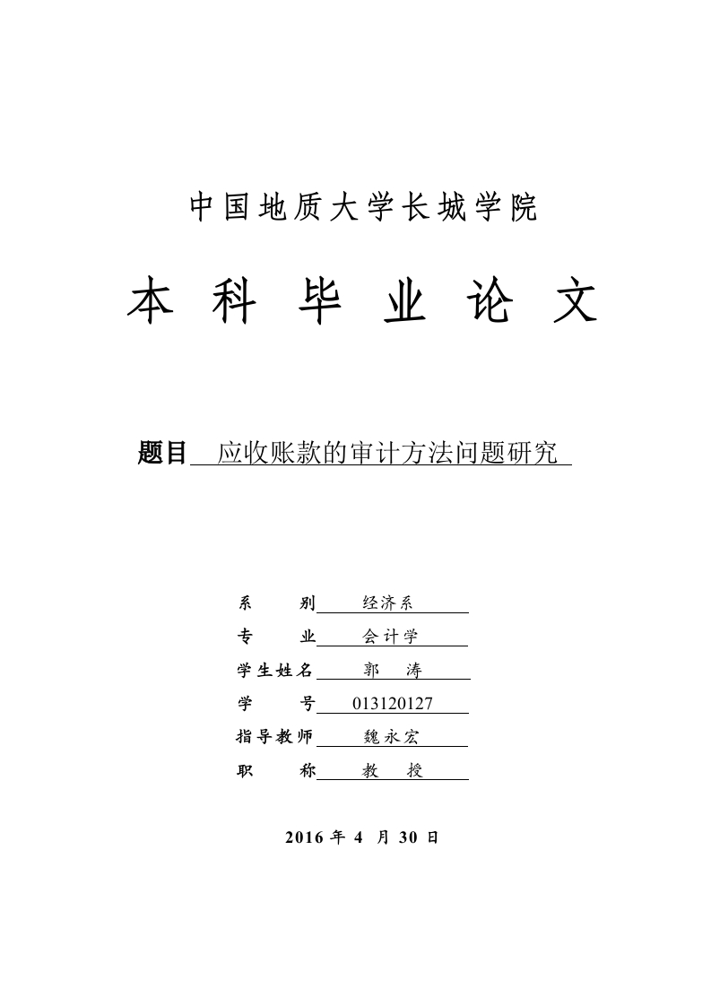 中国地质大学长城学院本科毕业论文题目应收账款的审计方法问题研究系别经济系专业会计学学生姓名郭涛学号013120127指导教师魏永宏职称教授2016年4月30日本科毕业生毕业论文(设计)诚信承诺书毕业论文应收账款的审计方法问题研究(设计)题目学生姓名郭涛专业会计学学号013120127指导老师魏永宏职称教授所在系别中国地质大学长城学院经济学院诚信承诺本人慎重承诺和声明:我承诺在毕业论文(设计)活动中遵守学校有关规定,恪守学术规范,在本人的毕业论文中不剽窃、抄袭他人的学术观点、思想和成果,不篡改研究数据,如有违规行为发生,我愿承担一切责任,接受学校的处理。学生(签名):年月日中国地质大学长城学院毕业论文任务书学生姓名郭涛学号013120127专业班级会计学一班指导教师魏永宏职称教授单位中国地质大学长城学院毕业论文题目应收账款的审计方法问题研究毕业设论文主要内容和要求:主要内容:本文主要对应收账款审计方法问题进行了研究,文章首先对应收账款的内涵进行了分析,限定了本文的研究范围。在此基础之上,对应收账款的特点进行了分析,进而使得本文的研究建立在对应收账款充分了解的基础之上。文章主要分析了目前企业应收账款舞弊的形式,针对这些舞弊的形式,再结合相关的理论,提出了针对性的应收账款审计方法的建议,对了解目前应收账款的舞弊现状和目前审计过程中存在的问题以及如何建立健全应收账款审计方法起到借鉴作用和参考价值。要求:论文撰写要求思路清晰、内容充实、论点明确,论据充分,论证严密,语言通顺。撰写论文前应首先阅读相关的研究资料,掌握学术前沿动态,对相关理论著作要很好的把握,提高理论水平及思想深度。根据开题报告和老师提出的意见对论文提纲进行修改,确定大纲后认真撰写毕业论文。撰写论文结束后要根据老师的修改意见,认真反复的修改论文,并按照要求参加毕业论文的答辩,严格按照论文进度安排进行论文的写作。论文的格式、字数等撰写方面的要求参照《中国地质大学长城学院毕业论文(设计)撰写规范》。毕业论文主要参考资料:[1]中国注册会计师协会编.审计M).北京:中国财政经济出版社,2015:100-150.[2]中国注册会计师协会编.会计M).北京经济科学出版社,2014:96-101.[3)中华人民共和国会计法M.北京:中国法制出版社,2000:50-100.[4潘蓉,试论应收账款审计[).中国外资,2012,(21):15-17.[5)]李保祥,刍议应收账款的审计技巧和方法).中国市场,2015,(32):2326[6陈淼,应收账款的舞弊及审计对策.经济视野,2014,(15):56-57[7)万旻,应收账款风险管理问题探讨.D]华中师范大学,2013[8]李小霞,我国企业应收账款管理研究[D]北京交通大学,2010[9龚明,浅谈加强国有企业审计的方法与对策.[U.全国商情,2015,(24):15-17[10]李季,论经济效益审计方法及具体应用.[).农场经济管理,2014,(10):58-60[11刂王丹,现代风险导向审计方法研究D]武汉科技大学,2010[12]张晓宏、林炳发,应收账款管理审计若干问题探究).审计月刊,2010(2):3334[13]秦燕,企业应收账款的审计方法探讨凹.财经界,2010(3):143[14杨桂云,关于应收账款的业务控制及审计目标的分析).商场现代化,2011(16):116[15]Research on Accounts Receivable Control Problem in Stages,YuanYuan Song,[J].Advanced MaterialsResearch,2013