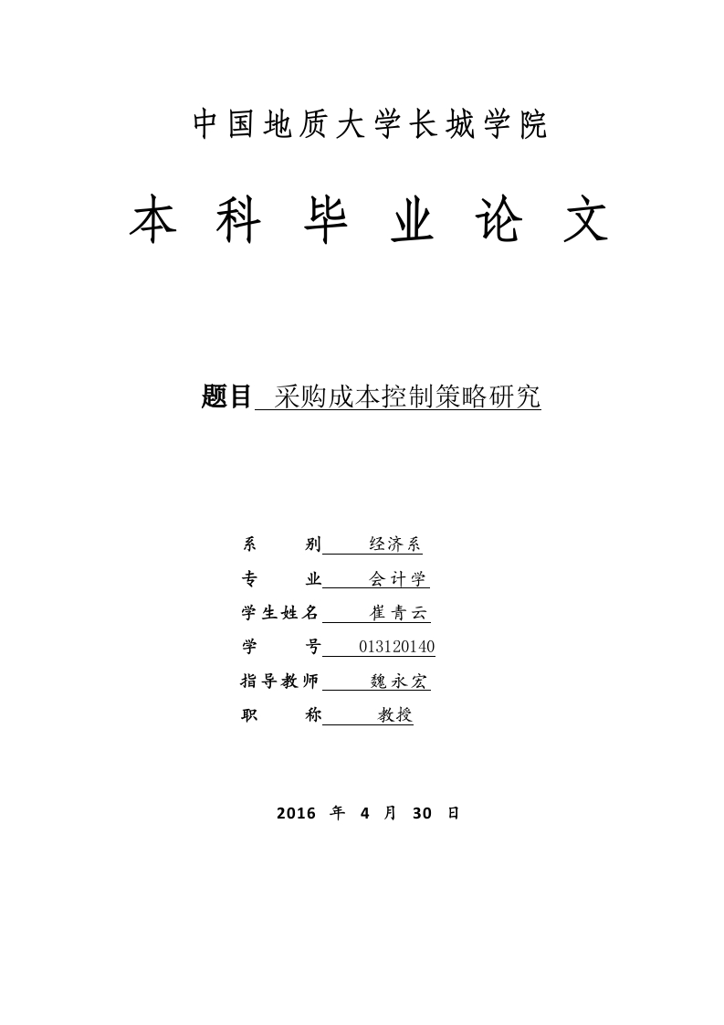 中国地质大学长城学院本科毕业论文题目采购成本控制策略研究系别经济系专业会计学学生姓名崔青云学号013120140指导教师魏永宏职称教授2016年4月30日本科毕业生毕业论文(设计)诚信承诺书毕业论文采购成本控制策略研究(设计)题目学生姓名崔青云专业会计学学号013120140指导老师魏永宏职称教授所在系别经济系诚信承诺本人慎重承诺和声明:我承诺在毕业论文(设计)活动中遵守学校有关规定,恪守学术规范,在本人的毕业论文中不剽窃、抄袭他人的学术观点、思想和成果,不篡改研究数据,如有违规行为发生,我愿承担一切责任,接受学校的处理。学生(签名):年月日中国地质大学长城学院毕业论文任务书学生姓名崔青云学号013120140专业班级会计学一班指导教师魏永宏职称单位中国地质大学长城学院毕业论文采购成本控制策略研究题目毕业论文主要内容和要求:主要内容:本文介绍了我国中小企业采购成本控制现状,通过研究采购成本控制的相关理论和现状进行全面的分析以改善采购成本制度不完善,缺乏系统观、全局观等问题,旨在更形象地理解采购成本,以进一步找到更好的解决我国现在企业所存在的采购问题的方法。本文将选择最优的采购方案,抓住成本重心,减少中间环节,降低采购成本,为企业实现采购成本的最小化已达到企业最大利益化。要求:论文撰写要求思路清晰、内容充实、论点明确,论据充分,论证严密,语言通顺。撰写论文前应首先阅读相关的研究资料,掌握学术前沿动态,对相关理论著作要很好的把握,提高理论水平及思想深度。根据开题报告和老师提出的意见对论文提纲进行修改,确定大纲后认真撰写毕业论文。撰写论文结束后要根据老师的修改意见,认真反复的修改论文,并按照要求参加毕业论文的答辩,严格按照论文进度安排进行论文的写作。论文的格式、字数等撰写方面的要求参照《中国地质大学长城学院毕业论文(设计)撰写规范》。毕业论文主要参考资料:[1]霍红,张玉斌.采购管理实务[0.科学出版社.2010.[2]张浩.采购管理与库存控制[M].北京大学出版.,2010.[3]刘海洋.浅析国企采购成本控制[J刀.经济视野.2014.(09):9495.[4]刘铭,任艳君,周康渠.企业零部件采购成本占比分析模型研究及应用[J刀.煤炭技术.2011,11.(6).[5]袁伟.对项目采购成本控制的几点思考[J刀.财经界.2015.(18):74-74.[6]周桃芳.采购成本控制[J刀.中国管理信息化.2015.(10):32-32.[7]张月艳,谢锟,傅佳佳.浅析企业采购成本控制问题及对策[J刀.财经界.2015.(14):35-35.[8]赵鹤影.如何有效控制采购成本控制[J].企业导报.2015.(11):25-25.[9]周利星.供应链管理视角下的采购成本控制方法研究(J).商场现代化.2015.(07):21-22.[10]蔡琼.信息金融时代的企业整体采购成本控制(J).现代商业.2015.(06):248-249.[11]张健.对项目采购成本控制的几点思考(J).物流工程与管理.2015.(02):41-42.[12]宋宗友.项目采购成本分析(J).物流工程与管理.2013.(02):60-61.[13]Anonymous The Price Goes Down;The Cost Skyrockets.(J).Radio:The Radio TechnologyLeader,.2015,Vol.21(3),pp.42.[14]李东锦.物资供应系统中物资采购成本控制问题以及相应对策研究分析(J).会计师.2014.(10):74-75.[15]邹易炯.企业采购成本控制浅析(J).商情.2014.(41):85-85.
