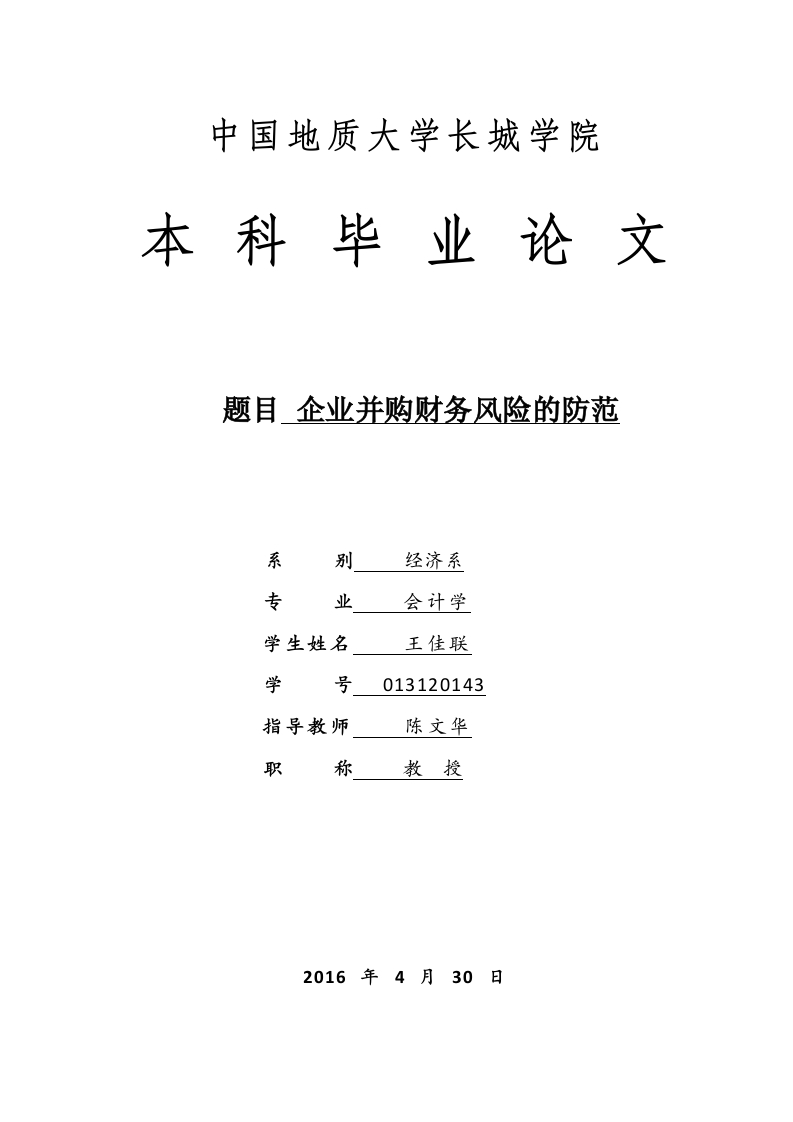 中国地质大学长城学院本科毕业论文题目企业并购财务风险的防范系别经济系专业会计学学生姓名王佳联学号013120143指导教师陈文华职称教授2016年4月30日本科毕业生毕业论文(设计)诚信承诺书毕业论文企业并购财务风险的防范(设计)题目学生姓名王佳联专业会计学学号013120143指导老师陈文华职称教授所在系别经济系诚信承诺本人慎重承诺和声明:我承诺在毕业论文(设计)活动中遵守学校有关规定,恪守学术规范,在本人的毕业论文中不剽窃、抄袭他人的学术观点、思想和成果,不篡改研究数据,如有违规行为发生,我愿承担一切责任,接受学校的处理。学生(签名):年月日中国地质大学长城学院毕业论文任务书学生姓名王佳联学号013120143专业班级会计学一班指导教师陈文华职称单位河北大学毕业论文题目企业并购财务风险的防范毕业论文主要内容和要求:主要内容:并购因其能够为企业带来诸如规模经济、资源配置、组合协同等效应而为当今世界各国企业所追逐。企业并购财务风险是由于并购定价、融资、支付等各项财务决策所引起的,是企业并购成功与否的重要影响因素。通过对企业并购财务风险的界定,剖析了企业并购财务风险的来源,对企业并购财务风险的控制与防范提出了建议,以期降低并购风险,提高企业并购活动的成功率。要求:论文撰写要求思路清晰、内容充实、论点明确,论据充分,论证严密,语言通顺。撰写论文前应首先阅读相关的研究资料,掌握学术前沿动态,对相关理论著作要很好的把握,提高理论水平及思想深度。根据开题报告和老师提出的意见对论文提纲进行修改,确定大纲后认真撰写毕业论文。撰写论文结束后要根据老师的修改意见,认真反复的修改论文,并按照要求参加毕业论文的答辩,严格按照论文进度安排进行论文的写作。论文的格式、字数等撰写方面的要求参照《中国地质大学长城学院毕业论文(设计)撰写规范》。毕业论文主要参考资料:[1]王妍.企业并购财务风险分析.现代企业教育,2014,(0277[2】李金田,李红琨.企业并购财务风险分析与防范).经济研究导刊,2013,(03)[3)储依群.完善企业内部控制的措施.企业导报,2011,12(2).[4王会林.企业并购的融资风险及防范).现代商务,2011.(30).[5)李春媛.如何加强企业财务风险控制.价值工程,2010,(32)[6)侯明花.浅议企业并购财务风险的成因和防范.社科纵横,2010,(O3:34[)韩磊.企业并购的财务风险及其防范措施).中小企业管理与科技(上旬刊).2011(02)[81翟留镜,孙浩.企业并购财务风险分析及防范.西部财会.2011(O3)[9]王凯,李婉弟.企业并购财务风险的防范与控制).中国证券期货.2011(04)[10]郭静荷.企业并购的财务风险分析及其防范).经济与社会发展.2011(04)[11】郑和平.企业并购的财务风险及其防控.财会研究.2011(10)[12]崔洁,袁放建.企业并购的财务风险与防范.理论导刊.2011(04)[13引闵赵亮.企业并购的财务风险及防范途径分析).行政事业资产与财务.2012(14)[14纠王海波.企业集团财务管理体制研究).辽宁行政学院学报.2012(08)[15]Stephen A.Ross,Randolph W.Westerfield,Jeffrey F.Jaffe.Corporate Finance[M].Beijing:ChinaMachine Press-2012