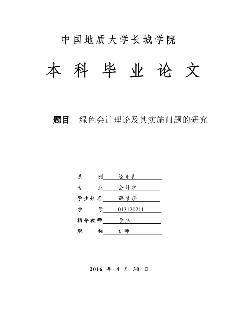 中国地质大学长城学院本科毕业论文题目绿色会计理论及其实施问题的研究系别经济系专业会计学学生姓名薛梦瑶学号013120211指导教师李焦职称讲师2016年4月30日本科毕业生毕业论文(设计)诚信承诺书毕业论文绿色会计理论及其实施问题的研究(设计)题目学生姓名薛梦瑶专业会计学学号013120211指导老师李焦职称讲师所在系别经济系诚信承诺本人慎重承诺和声明:我承诺在毕业论文(设计)活动中遵守学校有关规定,恪守学术规范,在本人的毕业论文中不剽窃、抄袭他人的学术观点、思想和成果,不篡改研究数据,如有违规行为发生,我愿承担一切责任,接受学校的处理。学生(签名):年月日中国地质大学长城学院毕业论文任务书学生姓名薛梦瑶学号013120211专业班级会计学二班指导教师李焦职称讲师单位中国地质大学长城学院毕业论文题目绿色会计理论及其实施问题研究毕业设论文主要内容和要求:主要内容:本文研究集中于绿色会计的确认和计量、实施绿色会计的意义、实施绿色会计存在的问题以及健全绿色会计制度的措施这几个方面来说的。本文展开了对绿色会计的研究,在借鉴前人经验和研究的基础上,采用比较和分析的方法,对绿色会计的内涵及研究意义进行阐述,对国内外绿色会计研究现状进行了分析,分析绿色会计核算中存在的问题,并提出解决绿色会计核算问题的对策。通过对绿色会计基础理论的研究,尝试性的完蕃绿色会计核算体系,以期能对资源的合理利用起到较好的促进作用,促进绿色会计核算在我国的实施,为我国可持续发展战略的实施保驾护航。要求:论文撰写要求思路清晰、内容充实、论点明确,论据充分,论证严密,语言通顺。撰写论文前应首先阅读相关的研究资料,掌握学术前沿动态,对相关理论著作要很好的把握,提高理论水平及思想深度。根据开题报告和老师提出的意见对论文提纲进行修改,确定大纲后认真撰写毕业论文。撰写论文结束后要根据老师的修改意见,认真反复的修改论文,并按照要求参加毕业论文的答辩,严格按照论文进度安排进行论文的写作。论文的格式、字数等撰写方面的要求参照《中国地质大学长城学院毕业论文(设计)撰写规范》。毕业论文主要参考资料:[1]舒岳,蒋麟凤.从制度需求与供给分析环境会计的发展).中国乡镇企业会计,2013,(12):50-51.[2]徐经纬.关于绿色会计在中国实行的初步探讨凹.承德民族师专学报,2012,29(2):82-83.[B)杨柄兰.对绿色会计及其计量的探讨).金卡工程,2013,142):268-269.[4继丹.对中国实施绿色会计的探讨凹.林业科技情报,2012,41(3):92-93[5]曾敏关于构建绿色会计信息披露体系的探讨)金融经济,2011,(9):63-64.[6]王同军对加强我国绿色会计建设的思考.中国经贸,2011,(12):121-122.[7)刘圣维农业企业推行绿色会计必要性探讨).中国农业会计,2013,(5):32-34.[8]刘哲倩.绿色会计与环境保护.环境经济,2013,(10):51-55.[9]郭艳敏绿色会计新理念探讨)现代商贸工业,2009,(5):138-139.[10]王超.浅议绿色会计在水利施工中的应用[).现代商贸,2011,(20):265-266.[11]王彩黎.绿色会计理论的探讨).中国外贸,2011,(9):79.[12]喻强,赵严景.我国绿色会计发展存在的问题及改进措施).全国商情,2011,(20):76-78.[13]张晓丹,叶力.试论绿色会计的实施必要性与措施.理论界,2013,(6):99-100.[14]Sefcik,Stephan E and Soderstrom.Naomi S and Stinson,Christopher H.1997.Accounting ThroughGreen-Colored Glasses:Teaching Environmental Accounting"[J].Issues in Accounting Education.129-140.