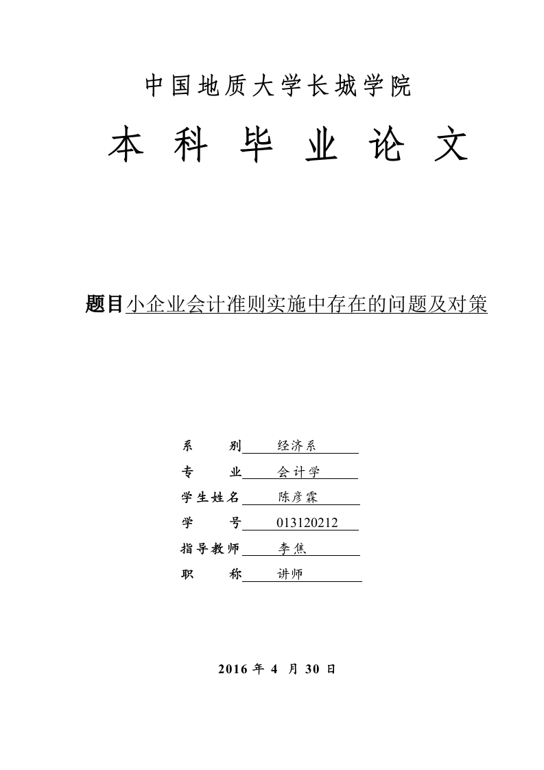 中国地质大学长城学院本科毕业论文题目小企业会计准则实施中存在的问题及对策系别经济系专业会计学学生姓名陈彦霖学号013120212指导教师李焦职称讲师2016年4月30日本科毕业生毕业论文(设计)诚信承诺书毕业论文(设计)题目小企业会计准实施中存在的问题及对策学生姓名陈彦霖专业会计学学号013120212指导老师李焦职称讲师所在系别经济系诚信承诺本人慎重承诺和声明:我承诺在毕业论文(设计)活动中遵守学校有关规定,恪守学术规范,在本人的毕业论文中不剽窃、抄袭他人的学术观点、思想和成果,不篡改研究数据,如有违规行为发生,我愿承担一切责任,接受学校的处理。学生(签名):年月日中国地质大学长城学院毕业论文任务书学生姓名陈彦霖学号013120212专业班级会计学二班指导教师李焦职称讲师单位中国地质大学长城学院毕业论文题目小企业会计准则实施中存在的问题及对策毕业设论文主要内容和要求:主要内容:本文运用会计学,管理学等有关理论,采用分层并将有关信息相结合的方法,从而对小企业会计准则详细内容做了阐述,进行了分析,还结合了现状对实施会计准则过程中发现实施的各种问题,会计准则所在范围以及小企业会计准则的现状做了详细的对比,发现了其中所存在问题而为此作出了相应的优化方案和建议,对小企业提高了经济效益,对管理层也有一些实质上的参考管理方案,促进了小企业更好的发展。要求:论文撰写要求思路清晰、内容充实、论点明确,论据充分,论证严密,语言通顺。撰写论文前应首先阅读相关的研究资料,掌握学术前沿动态,对相关理论著作要很好的把握,提高理论水平及思想深度。根据开题报告和老师提出的意见对论文提纲进行修改,确定大纲后认真撰写毕业论文。撰写论文结束后要根据老师的修改意见,认真反复的修改论文,并按照要求参加毕业论文的答辩,严格按照论文进度安排进行论文的写作。论文的格式、字数等撰写方面的要求参照《中国地质大学长城学院毕业论文(设计)撰写规范》。毕业论文主要参考资料:[1]靳建基.《小企业会计准则》实施中存在的问题及对策凹.现代经济信息,2014,(6):272-276.[2]韩静.《小企业会计准则》实施问题及对策研究心.会计师,2014:6-7.[3)]陈家兴.小企业会计准则实施效应研究D].福建农林大学,2014.[4葛萌竹.我国《小企业会计准则》相关问题研究D).首都经济贸易大学,2013[5)王肠.我国小企业会计准则实施问题研究.会计之友,2012,(⑤):23-24.[6)于昕强.我国中小企业在实施新会计准则中存在的问题及对策).当代经济,2012,(6):120-121.蔺松元.《小企业会计准则》实施的难点与对策).西部财会,2012,(11)21-24.[⑧]李晓慧.小企业会计准则执行问题研究D).东北财经大学,2013.[9]刘莉.浅析实施小企业会计准则存在的问题及对策).时代金融,2015:130-132.[10]刘延云.我国小企业会计规范体系现状及完善途径研究D].西安石油大学,2012.[11]张妙凌,朱平平.《小企业会计准则》实施浅析一一基于SW0T分析法).财会通讯,2013:61-62.[12]Inger Johanne Pettersen,Kari Nyland.Reforms and accounting system changes:A study on theimplementation of accrual accounting in Norwegian hospitals[J].Joumal of Accounting OrganizationalChange,2011.