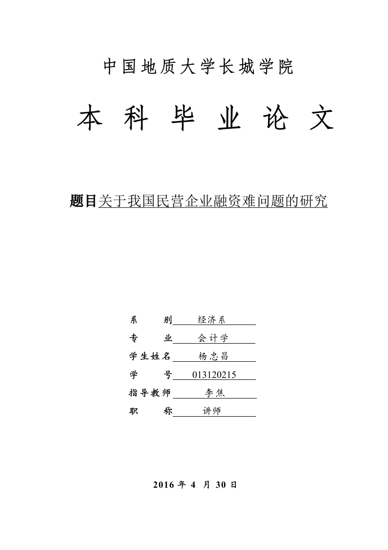 中国地质大学长城学院本科毕业论文题目关于我国民营企业融资难问题的研究系别经济系专业会计学学生姓名杨忠昌学号013120215指导教师李焦职称讲师2016年4月30日本科毕业生毕业论文(设计)诚信承诺书毕业论文关于我国民营企业融资难问题的研究(设计)题目学生姓名杨忠昌专业会计学学号013120215指导老师李焦职称讲师所在系别经济系诚信承诺本人慎重承诺和声明:我承诺在毕业论文(设计)活动中遵守学校有关规定,恪守学术规范,在本人的毕业论文中不剽窃、抄袭他人的学术观点、思想和成果,不篡改研究数据,如有违规行为发生,我愿承担一切责任,接受学校的处理。学生(签名):年月日中国地质大学长城学院毕业论文任务书学生姓名杨忠昌学号013120215专业班级会计学2班指导教师李焦职称讲师单位中国地质大学长城学院毕业论文题目关于我国民营企业融资难问题的研究毕业论文主要内容和要求:主要内容:本文首先阐述了民营企业融资难的现状,在经过总体分析后,指出了阻碍我国民营企业发展的最大障碍是融资难的问题,通过对民营企业融资难问题的深入研究,得出了我国经济制度不完善、信用体系不健全等问题是阻碍我国民营企业融资的最主要原因,最后结合我国国情对我国民营企业融资难的问题提出了些许建议措施。要求:论文撰写要求思路清晰、内容充实、论点明确,论据充分,论证严密,语言通顺。撰写论文前应首先阅读相关的研究资料,掌握学术前沿动态,对相关理论著作要很好的把握,提高理论水平及思想深度。根据开题报告和老师提出的意见对论文提纲进行修改,确定大纲后认真撰写毕业论文。撰写论文结束后要根据老师的修改意见,认真反复的修改论文,并按照要求参加毕业论文的答辩,严格按照论文进度安排进行论文的写作。论文的格式、字数等撰写方面的要求参照《中国地质大学长城学院毕业论文(设计)撰写规范》。毕业论文主要参考资料:[1]杨铁.我国民营企业融资障碍及其解决途径[J刀.合作经济与科技,2015,(04):6365.[2]胡长员.我国民营民营企业融资难的原因及对策分析[J].财经界(学术版),2015,(07):84+291[3]沈立群.我国民营企业跨境并购融资问题探析[D].江西财经大学,2014.[4]杨卉.我国中小民营企业融资研究[D].大连海事大学,2014.[5]方志强.我国民营民营企业融资难问愿探讨[J刀.经营管理者,2015,(26):49.[6]熊绎曼.我国民营民营企业融资难的非经济因素分析[D].湖北工业大学,2013.[7]孙维.浅议我国民营企业融资困境及解决路径[J刀.价值工程,2015,(02):170-171.[8]李德刚.我国中小民营企业融资担保模式研究[D].云南大学,2014.[9]嵇伟强.对中小民营企业融资问题的探讨[J刀.财经问题研究,2014,(S1):121-124.[10]]薛超凯.民营企业融资风险管理研究[D].山东理工大学,2014[11]张艳.民营企业融资困境与对策[D].云南大学,2014.[12]Wagenvoort.SMEFinancing in Europe:Introduction and Overview [J]LocalStrength,Global,Reach,2011,18-19.