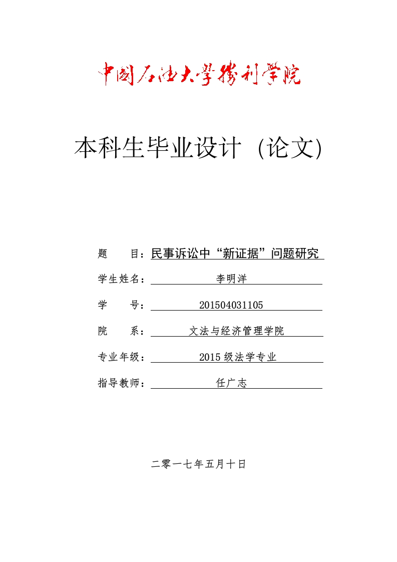 本科生毕业设计(论文)目:民事诉讼中“新证据”问题研究学生姓名:李明洋学号:201504031105院系:文法与经济管理学院专业年级:2015级法学专业指导教师:任广志二零一七年五月十日中国石油大学胜利学院本科毕业设计(论文)摘要民事诉讼中关于新的证据问题的阐述,以及其历史沿革。在我国民事诉讼的发展历程中,实体公正一直是人们不懈追求的价值目标。“新证据”作为举证时限的例外,是受追求实体公正的思想影响的结果。笔者结合自己的审判实践作为法律硕士论文选题进行写作的。本论文以新的证据的概念、特征为主线,通过对有关新的证据材料的分析,归纳得出新的证据的概念,并总结了新的证据的时限性、客观性、可信性与对案件事实及裁判结果的主导性、决定性等四大法律特征我国现行《民事诉讼法》采用的是证据随时提出主义,对于证据的提出时间没有限制,“新证据”可以随时提出,由此产生了很多弊端。本文的写作采取了比较研究与理论分析相结合的方式,借鉴新证据美国、德国、日本、台湾、澳门的有关研究。分析我国新证据的问题现状以及不足,在民事诉讼中一审、二审、再审中存在的问题以及不足。对新证据的正当性危机和缺乏配套制度的评析。完善我国新证据的总体思路和具体设想,以及在一审、二审、再审中的具体方案和完善相应的配套制度。因此,对现行的制度进行改造,建立完善的“新证据”十分必要。关键词:证据:新证据:民事诉讼:规则:制度中国石油大学胜利学院本科毕业设计(论文)ABSTRACTThis paper expounds on the problems of the new evidence in civil litigation,and itshistorical evolution.In the course of development of China's civil litigation,substantivejustice has been the relentless pursuit of the value target.The "new evidence"as theexception of proof limitation is influenced by thought of substantive justice of the result.Theauthor combines own trial practice as a master of law thesis writing.In this paper,theconcept of new evidence,the characteristics as the main line,through the analysis of therelevant materials of the new concept,summed up the new evidence,and summarizes thenew evidence is limited,objectivity,credibility and on the leading case facts and judgment,and decisive four legal characteristics of China's current "Civil Procedure Law is used inevidence at any time,for evidence of no time limit,the"new evidence "can be made at anytime,resulting in a lot of drawbacks.This paper adopts comparative study and theoreticalanalysis the combination of new evidence,from the United States,Germany,Japan,Taiwan,Macao.The related research status analysis of new evidence in our country,in the civilprocedure of first instance,the second trial,the retrial in the existing problems anddeficiencies.Comments on the new evidence of the legitimacy crisis and the lack of perfectour supporting system.China The overall ideas and specific ideas of the new evidence,aswell as in the first instance,the second instance,the retrial of the specific programs andimprove the corresponding supporting system,therefore,the transformation of the existingsystem,the establishment of a sound "new evidence"is necessary.Keywords:Evidence:New evidence:Civil litigation:Rules:System