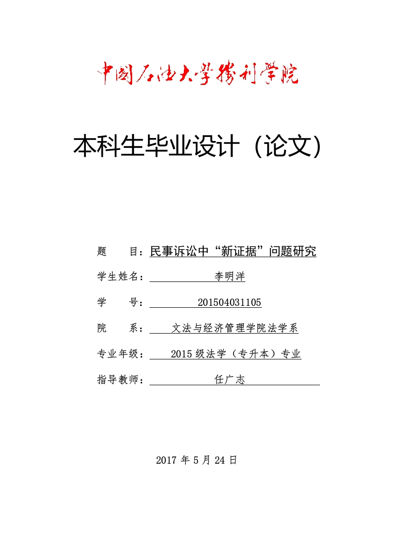 本科生毕业设计(论文)目:民事诉讼中“新证据”问题研究学生姓名:李明洋学号:201504031105院系:文法与经济管理学院法学系专业年级:2015级法学(专升本)专业指导教师:任广志2017年5月24日中国石油大学胜利学院本科毕业设计(论文)摘要民事诉讼中关于新的证据问题的阐述,以及其历史沿革。在举证时限例外的“新证据”,其思想受到了实体公正的影响。本论文以新的证据的概念、特征为主线,通过对有关新的证据材料的分析,归纳得出新的证据的概念。我国采用的是证据随时提出主义,对于证据的提出时间没有限制,“新证据”可以随时提出,由此产生了很多弊端。本文的写作采取了比较研究与理论分析相结合的方式,借鉴其他国家地区的有关研究,对新证据的正当性危机和缺乏配套制度的评析。完善我国新证据的总体思路和具体设想以及相应的配套制度。因此,对现行的制度进行改造,建立完善的“新证据”十分必要。中国石油大学胜利学院本科毕业设计(论文)ABSTRACTThis paper expounds on the problems of the new evidence in civil litigation,and itshistorical evolution.In the proof time exception of "new evidence",the thought has beeninfluenced by the entity justice.In this paper,the concept of new evidence,thecharacteristics as the main line,through the analysis of the relevant evident materials of thenew concept,summed up the new evidence at present "Civil Procedure Law is used inevidence at any time,for evidence of no time limit,the"new evidence "can be made at anytime,resulting in a lot of drawbacks.This paper adopts a comparative analysis of thecombination of theory and methods,based on a comprehensive study of other countries andregions.In China Current situation and deficiency of new evidence,comment on newevidence of the legitimacy crisis and the lack of supporting systems.To improve the overallthinking and specific ideas of new evidence in China and the corresponding supportingsystem.Therefore,the transformation of the existing system,the establishment andperfection of the "new evidence"of ten points.Keywords:Evidence:New evidence:Civil litigation:Rules:System