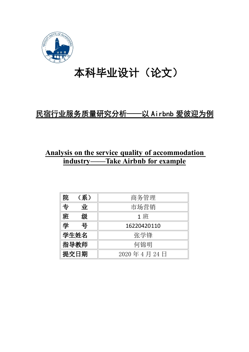 本科毕业设计(论文)民宿行业服务质量研究分析一以Airbnb爱彼迎为例Analysis on the service quality of accommodationindustry-Take Airbnb for example院(系)商务管理专业市场营销班级1班学号16220420110学生姓名张学锋指导教师何锦明提交日期2020年4月24日毕业设计(论文)原创性声明本人郑重声明:所呈交的毕业设计(论文),是本人在指导老师的指导下,独立进行的设计(研究)工作及取得的成果,论文中引用他人的文献、数据、图件、资料均已明确标注出,论文中的结论和结果为本人独立完成,不包含他人已经发表或撰写的作品及成果。对本文的研究作出贡献的个人和集体,均已在论文中作了明确的说明。本人完全意识到本声明的法律结果由本人承担。毕业论文作者(签字):张学锋签字日期:2020年4月24日指导教师评分:评阅教师评分:答辩小组评分:总评成绩:系主任签字(盖章):年月