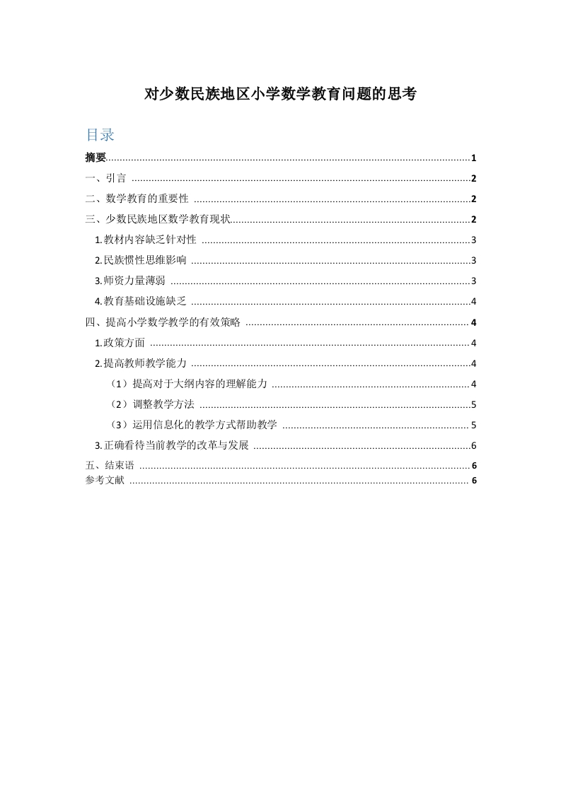 对少数民族地区小学数学教育问题的思考目录一、引言.2二、数学教育的重要性三、少数民族地区数学教育现状21.教材内容缺乏针对性32.民族惯性思维影响3.师资力量薄弱4.教育基础设施缺乏四、提高小学数学教学的有效策略1.政策方面a...m....-...-........-.-.....-...-...--...-.--2.提高教师教学能力.4(1)提高对于大纲内容的理解能力(2)调整教学方法5(3)运用信息化的教学方式帮助教学3.正确看待当前教学的改革与发展五、结束语参考文献6摘要:近年来,教育改革、教育公平屡屡被讨论,与此同时,少数民族地区小学教育也引起了广泛的关注。本文分析了我国少数民族地区小学数学教育的现状,提出了关于少数民族地区数学教育的一些思考,旨在解决少数民族地区数学教育的问题,切实提高少数民族地区的教学质量。由于历史、地理、经济和民族等多重因素,少数民族地区文化教育相对落后。学生数学基础知识掌握的并不好。在实际的教学过程中,教师应该要准确的把握少数民族学生与汉族学生的不同点,不单单是语言和风俗,更要全面的考虑到心理问题等等。关键词:少数民族:小学数学:问题:对策一、引言我国是个由多民族构成的大家庭,不同的民族之间有着较多的差异,体现在生活、风俗和语言上,对于现代的教学体系来说,少数民族的学生显得尤为吃力。改革开放以来,国家大力实施科教兴国战略,将教育问题提到了关乎民族未来、国家命运的高度。而少数民族地区受历史原因、地理条件及民族习惯等因素的影响,文化教育一直相对落后。2002年国务院出台了《关于深化改革加快发展民族教育的决定》,要求要尽快改善少数民族地区教育环境,加强教育基础设施建设,完善民族教育体系。2004年教育部、国务院西部开发办公室印发《2004一2010年西部地区教育事业发展规划》进一步提出了加强落后地区教育事业发展的具体措施。进入2012年,“十二五规划”依然将少数民族地区文化教育事业作为重点工作部署规划。振兴少数民族地区教育,除了政策导向,还要立足于少数民族地区的教学实践,从实际教学中发现问题,解决问题,并最终形成完备的理论体系。二、数学教育的重要性毕达哥拉斯说“万物皆数”。数学不仅仅体现在日常生活中的买卖商品,更是一切科学研究的本源与基础。同时,数学教育在培养人的逻辑思维能力方面具有不可替代的作用。因此,国际上任何国家都非常重视数学教育,世界上很多组织也都通过自身努力改革数学教育,促进数学教学及数学教师的专业化发展。小学数学虽简单,但奠定了数学教育的基础,因此不容忽视。另外,小学生思维简单,还未形成定势,在这个时候通过数学教育培养其数学思维和缜密的逻辑思维,对于其是终生受用的。三、少数民族地区数学教育现状首先,教育中最重要的资源就是教师资源,在优秀教师这一块,师资条件显得非常的薄弱,很多老师对课堂的驾驭能力不够,虽然新课程要求从以教师为转向以学生为主,但是一旦放开手脚让学生自己去探究,学生提出的问题有时候教师也未必能够回答得上,这与教师自身的知识储备有关,与少数民族地区教师素质有关。大部分少数民族地区在我国人烟稀少的地区,经济条件落后,生活水平朴素,教学设施也跟不上,教师自己准备的教学设备有限,很难达到新课程教育标准。我国现行小学数学教学大纲中关于学生的能力要求是:培养学生的计算能力、初步的逻辑思维能力和解决问题的能力。然而由于经济、文化、历史等种种原因,我国少数民族地区的数学教育水平远不能达到上述要求。少数民族地区学生对于现代教育的适应程度远不如汉族学生。政策导向不足,师资力量缺乏,教学设施老旧,这些都限制着少数民族地区数学教育的发展。通过研究这些问题、解决这些问题,对少数民族地区数学教育的发展具有重要意1.教材内容缺乏针对性我国目前教材种类有新课标标准实验版、人教版、北师大版、浙教版、西师大版、青岛版、苏教版、冀教版、青岛版五四制、沪教版等,还有其他版本。虽然版本较多,但针对少数民族地区的教材暂时还没有发行,少数民族地区的学生所使用的教材和汉族学生基本上一样。由于少数民族地区与汉族学生有不同的文化背景和民族习惯,因此汉族学生的教材内容不一定符合他们的思维方式。数学是非常看重抽象思维的学科,形象的实例可以帮助学生理解,但是依据汉族学生生活习惯所列举的实例,少数民族地区学生往往不能理解,这就影响了他们对于内容的理解,更重要的是使他们觉得数学枯燥乏味,缺乏学习兴趣。2.民族惯性思维影响我们都知道,汉族文化博大精深,汉族人对于知识文化的渴求是基于历史的积淀。而少数民族地区则不同,历史上的一些生活习惯使他们中的很多人更重视生存与信仰。社会发展到现代,一些古老的思维依旧影响着他们,使他们认识不到知识的重要性,很多少数民族学生家长不重视知识,也导致学生在学习过程中不用功。3.师资力量薄弱数学教学是非常讲究技巧的,单纯地照本宣科己然不适合现代教育。我国数学教育强调的是记忆与理解,其中理解很大程度上依靠教师的形象表述。另外一方面,课堂互动也是帮助学生更好地学习的途径,将简单的灌输知识变为让学生更主动地学习、更多地参与到教学实践中非常考验教师的能力。我国小学