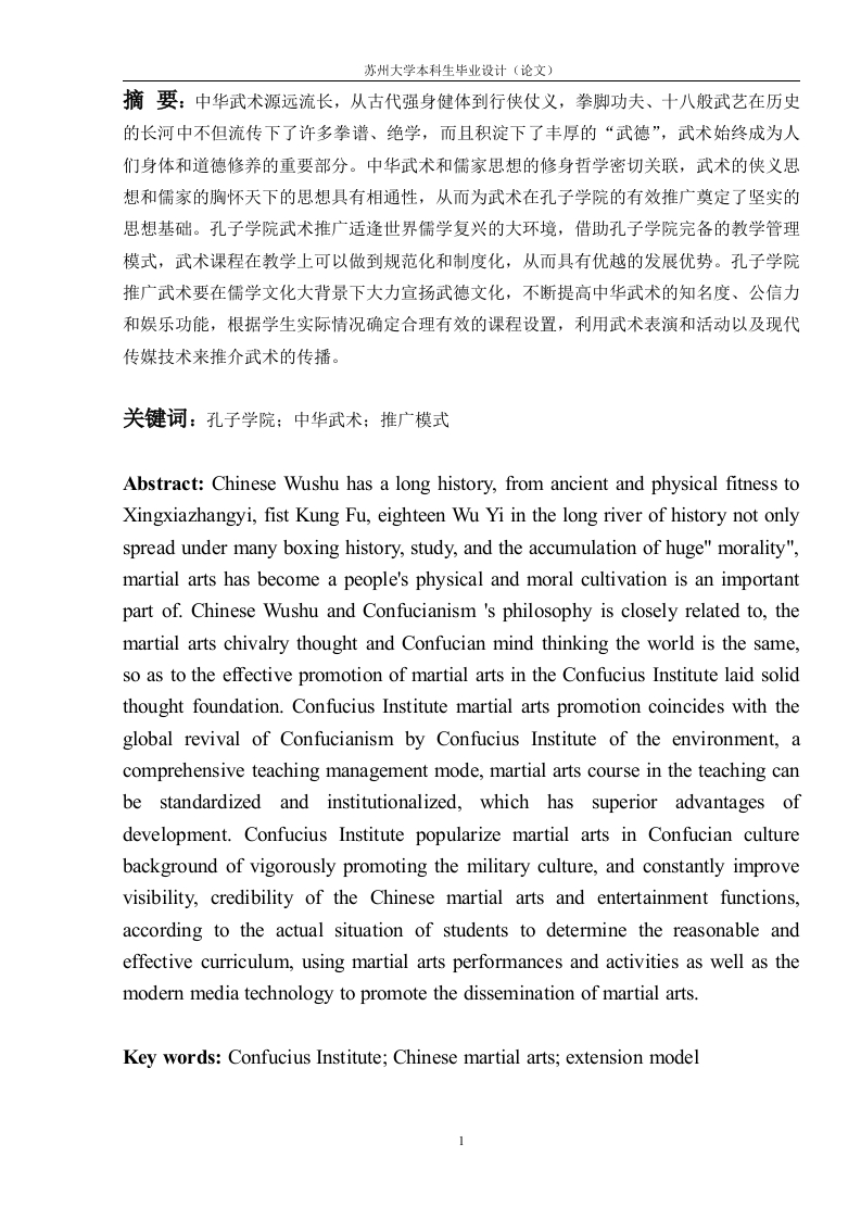 苏州大学本科生毕业设计(论文)摘要:中华武术源远流长,从古代强身健体到行侠仗义,拳脚功夫、十八般武艺在历史的长河中不但流传下了许多拳谱、绝学,而且积淀下了丰厚的“武德”,武术始终成为人们身体和道德修养的重要部分。中华武术和儒家思想的修身哲学密切关联,武术的侠义思想和儒家的胸怀天下的思想具有相通性,从而为武术在孔子学院的有效推广奠定了坚实的思想基础。孔子学院武术推广适逢世界儒学复兴的大环境,借助孔子学院完备的教学管理模式,武术课程在教学上可以做到规范化和制度化,从而具有优越的发展优势。孔子学院推广武术要在儒学文化大背景下大力宣扬武德文化,不断提高中华武术的知名度、公信力和娱乐功能,根据学生实际情况确定合理有效的课程设置,利用武术表演和活动以及现代传媒技术来推介武术的传播。关键词:孔子学院;中华武术;推广模式Abstract:Chinese Wushu has a long history,from ancient and physical fitness toXingxiazhangyi,fist Kung Fu,eighteen Wu Yi in the long river of history not onlyspread under many boxing history,study,and the accumulation of huge"morality",martial arts has become a people's physical and moral cultivation is an importantpart of.Chinese Wushu and Confucianism 's philosophy is closely related to,themartial arts chivalry thought and Confucian mind thinking the world is the same,so as to the effective promotion of martial arts in the Confucius Institute laid solidthought foundation.Confucius Institute martial arts promotion coincides with theglobal revival of Confucianism by Confucius Institute of the environment,acomprehensive teaching management mode,martial arts course in the teaching canbe standardized and institutionalized,which has superior advantages ofdevelopment.Confucius Institute popularize martial arts in Confucian culturebackground of vigorously promoting the military culture,and constantly improvevisibility,credibility of the Chinese martial arts and entertainment functions,according to the actual situation of students to determine the reasonable andeffective curriculum,using martial arts performances and activities as well as themodern media technology to promote the dissemination of martial arts.Key words:Confucius Institute;Chinese martial arts;extension model苏州大学本科生毕业设计〔论文)1前言中华武术源远流长,从古代强身健体到行侠仗义,拳脚功夫、十八般武艺在历史的长河中不但流传下了许多拳谱、绝学,而且积淀下了丰厚的“武德”,武术始终成为人们身体和道德修养的重要部分。早在春秋时期左丘明所著的《左传》中就有“武德有七”的论述,在司马迁的《游侠列传》中热情讴歌的行侠仗义、一诺千金的侠义精神,这都成为后世武学道德的深厚渊源。以后随着时代的展,武德的涵义也在不断地变化发展,1987年全国武术学术研讨会,将武德规范概括为“尚武崇德,修身养性”,其传承的“尊师重道、孝悌正义、扶危济贫、除暴安良、虚心请教、戒骄奢淫逸”等作为武德信条和我国的传统的儒家思想有着许多相通之处。在外国,中国的武术被称作“功夫”。长久以来,作为功夫的武术文化在很长一段时间里,成为了世界人民了解中国文化的一个窗口,有很多人因为爱上了功夫,最终爱上了中国。2因此,在中华崛起、儒学复兴的今天,在各地孔子学院推广中华武术、弘扬中华传统武者道德,对于推动中华文化和儒学的进一步传播,将具有积极的意义。现在,许多孔子学院已经开始将教授太极拳作为学院的科目之一,但在武德的弘扬以及与儒家道德的结合中还没有很好的推广模式,探究孔子学院中的武术推广策略具有积极的现实意义。2研究对象与方法2.1研究对象本文主要以孔子学院的武术推广为研究对象2.2研究方法2.2.1文献资料法利用苏州大学图书馆以及网络系统数字资源库(中国期刊数据库、中文科技期刊数据库等):搜集有关的研究资料,分析儒家思想对中华武术的影响,从学院教学层次探究孔子学院武术的推广,从历史和民族精神层次出发分析武德和儒家思想的内在联系,从文化和道德的角度分析儒家文化对中华武术的深刻影响,从课程设置、宣传推广、学员培训等2苏州大学本科生毕业设计(论文)方面探究在孔子学院推广中华武术的策略。2.2.2逻辑分析法运用逻辑学的知识和方法进行比较、归纳、分析与综合,运用文字较全面地阐明和论述研究观点。3研究结果与分析随着近年来中国武术的走向世界和孔子学院在各地的兴起,学术界对孔子学院中的武术推广也进行了深入的研究,陈青在中从中华民族古代的崇尚武学道德和修为的民族审美文化入手,探究了武学道德和尚武文化对儒家思想的影响,认为武学与儒学关系密切,和儒家的重视社会责任、道家的神仙思想分不开,这些因素交织、融合在一起,遂形成特有的中华武术审美情趣,在孔子学院的推广下成为全球化的文化)。张艳丽在中也认为中国武术和儒家思想都是文化的集合体,依托孔子学院推广中华武术是中华文化传播的一大亮点,作者认为要注重表演传播的视觉效应,让武术走进孔子学院课堂,注重武术师资的培养和利用等发展对策。武术文化反映了中华民族文化的典型状态和样式4。3.1中华武术和儒家思想的关系3.1.1强身健体与独善其身的道德修养中华武术源远流长,在发展中始终和儒家思想息息相关,中国古代封建时期把儒家思想作为修身治国的重要思想,实际上,儒家思想首先是一种伦理道德哲学,其关心的