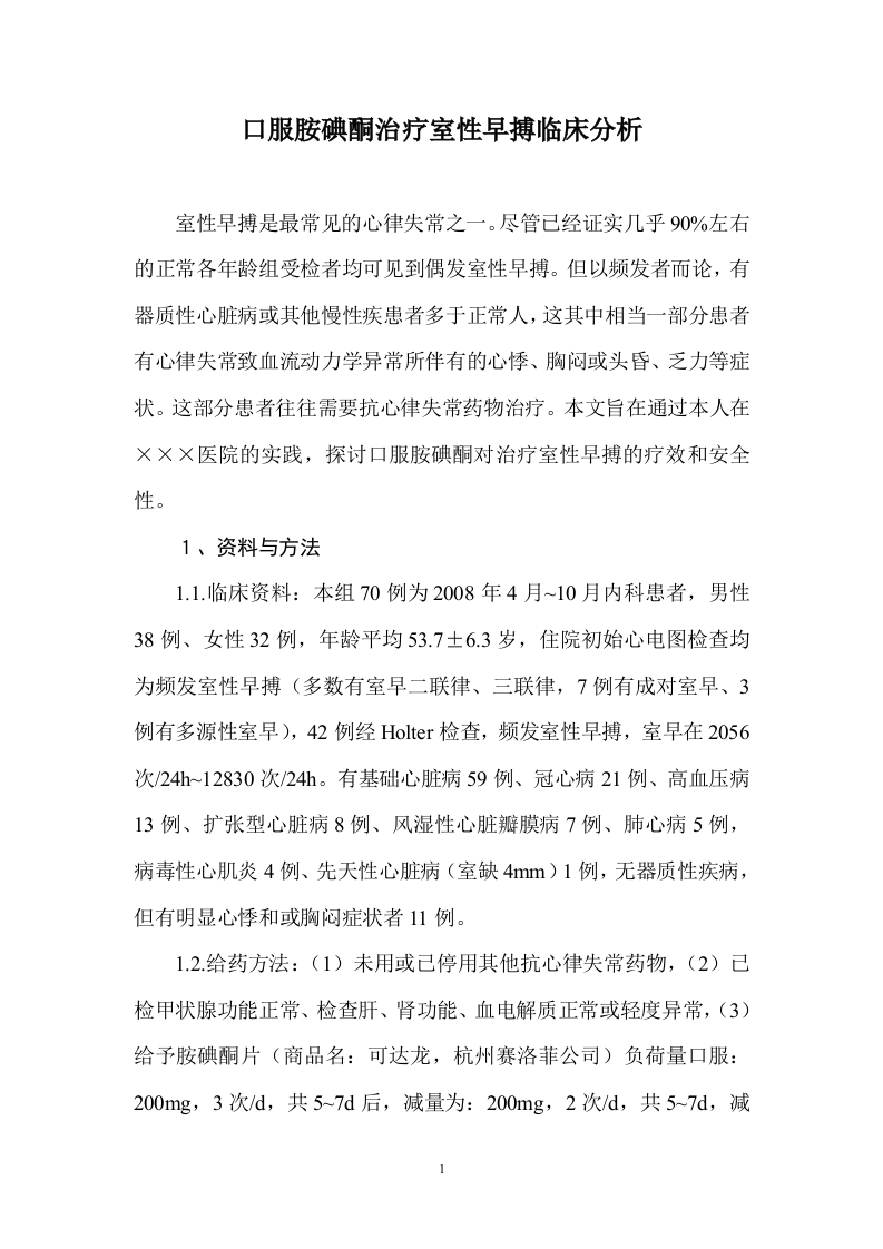 口服胺碘酮治疗室性早搏临床分析室性早搏是最常见的心律失常之一。尽管已经证实几乎90%左右的正常各年龄组受检者均可见到偶发室性早搏。但以频发者而论,有器质性心脏病或其他慢性疾患者多于正常人,这其中相当一部分患者有心律失常致血流动力学异常所伴有的心悸、胸闷或头昏、乏力等症状。这部分患者往往需要抗心律失常药物治疗。本文旨在通过本人在×××医院的实践,探讨口服胺碘酮对治疗室性早搏的疗效和安全性。1、资料与方法1.1.临床资料:本组70例为2008年4月~10月内科患者,男性38例、女性32例,年龄平均53.7士6.3岁,住院初始心电图检查均为频发室性早搏(多数有室早二联律、三联律,7例有成对室早、3例有多源性室早),42例经Holter检查,频发室性早搏,室早在2056次/24h~12830次/24h。有基础心脏病59例、冠心病21例、高血压病13例、扩张型心脏病8例、风湿性心脏瓣膜病7例、肺心病5例,病毒性心肌炎4例、先天性心脏病(室缺4mm)1例,无器质性疾病,但有明显心悸和或胸闷症状者11例。1.2.给药方法:(1)未用或已停用其他抗心律失常药物,(2)已检甲状腺功能正常、检查肝、肾功能、血电解质正常或轻度异常,(3)给予胺碘酮片(商品名:可达龙,杭州赛洛菲公司)负荷量口服:200mg,3次/d,共5~7d后,减量为:200mg,2次/d,共5~7d,减量为200mgd,1次/d口服维持,以后视情况部分患者进一步减量至100mg,1次/d。2、结果2.1.疗效:56例患者在开始口服胺碘酮二周内,心电图复查显示室早显著减少,其中40例经Holter检查室早少于用药前的一半,14例患者在开始口服胺碘酮二周内心电图复示有减少。在口服胺碘酮维持量(200mg,1次/d)后,所有70例患者心电图或Holter检查均显示室早进一步减少,在三个月至一年的随访期间,有8例停药一至数月后再次出现频发室性早搏,经予重复前述口服胺碘酮负荷量逐周递减至维持量200mg,1次/d,所有这8例患者室早均显著减少。2.2.副作用:5例出现窦性心动过缓,经胺碘酮维持量减半(200mgd减至100mg/d)或停该药后好转,3例出现轻度甲亢,这3例停用胺碘酮,改用美西律、普罗帕酮二药中、小剂量联合口服,控制了心律失常,2例出现食欲不振、1例出现皮疹,经对症处理后缓解。3、讨论胺碘酮是苯并呋喃衍生物,属于类抗心律失常药物,可通过阻滞钾通道而延长心房肌、心室肌及浦肯野纤维的APD和ERP,此外尚具有I类钠通道阻滞剂和V类钙通道阻滞剂作用,亦有轻度非竟争性α受体和B受体阻滞作用山②。胺碘酮治疗各种原因引起的室性心律失常。器质性心脏病、左心功能不全、左室肥大、室内传导障碍发生室律失常选用胺碘酮作为防治药物,基本不影响心功能状态,基本2无促心律失常作用②],邵剑民等随访观察一组慢性心衰合并室性心律失常、房颤患者,予口服胺碘酮维持量50-200mg/d,随访一年,无一例因使用胺碘酮致心功能恶化)。本组患者除5例出现窦性心动过缓,未引发新的心律失常,轻度甲亢、食欲不振、皮疹等副作用出现的例数也很少,可以说口服胺碘酮小剂量维持,副作用较少且轻。综上所述,口服胺碘酮治疗室性早搏安全、有效,尤其对于有器质性心脏病患者是较理想的抗心律失常药物。参考文献:1、陈维洲,许玉韵。心血管病治疗学M、第1版、杭州:浙江科技出版社,2001,1202、蒋文平:胺碘酮抗心律失常治疗应用指南[)、中华心血管病杂志,2004,32(12):1065、1062~10683、邵剑民,陶谦民。胺碘酮在慢性心力衰竭合并心律失常中的应用探讨。中华心血管病杂志,2003,31(6):4603