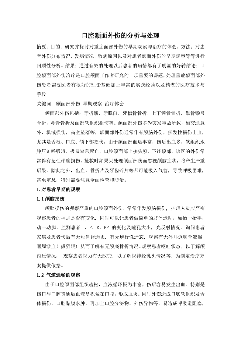 口腔额面外伤的分析与处理摘要:目的:研究并探讨对重症面部外伤的早期观察与治疗的体会。方法:对患者外伤分布情况,发病情况,致病原因以及对患者额面外伤的早期观察等等进行回顾性分析。结果:通过有效的处理以后患者的病情都有了明显的好转结论:口腔额面部外伤治疗是口腔额面工作者研究的一项重要的课题,处理重症额面部外伤患者需要医者有很好的理论基础加上丰富的实践经验以及精湛的医疗技术与手段。关键词:额面部外伤早期观察治疗体会颌面部外伤包括:牙折断,牙脱白,牙槽骨骨折,上下颌骨骨折,颧骨颧弓骨折,鼻骨骨折及面部软组织损伤等。颌面部外伤多为突发事故所致,如交通意外,机械损伤,高空坠落等,颌面部外伤通常伴有颅脑外伤,多发性损伤出血,尤其是舌根、口底、颌下部损伤,由于颌面部血运丰富,伤后出血多,软组织水肿压迫呼吸道,极易室息死亡。口腔颌面部上接头顿、下连颈部,该区的外伤常常伴有急性颅脑损伤,抢救时如果只处理颌面部伤而忽视顿脑症状,将产生严重后果。除此之外,出血、骨折片及牙齿碎片等都可能吸入气管,导致呼吸困难,甚至室息,特别需要注意全面检查和防治。1.对患者早期的观察1.1颅脑损伤颅脑损伤的观察严重的口腔颌面外伤,常常伴发顿脑损伤,护理人员应严密观察患者的神志是否有变化,同时可以让患者做简单的肢体运动,如抬一抬手,动一动脚。监测患者T、P、R、BP的变化及瞳孔大小,光反射情况。询问患者家属及患者伤后有无短暂昏迷史,有无逆行性遗忘,观察有无外耳道脑脊液漏,眶周淤血(熊猫眼)从而了解有无颅底骨折情况。观察患者呕吐状态,以了解顿内压情况,观察患者视力有无改变,以了解视神经乳头情况等,为制定治疗方案提供依据。1.2气道通畅的观察由于口腔颌面部组织疏松,血液循环极为丰富,伤后容易发生出血。特别是伤口与口腔贯通后血液易积聚在口腔,形成血块。同时外伤造成口底软组织及舌体损伤,口腔黏膜水肿,再加上口腔分泌物、外伤异物等,易造成呼吸道阻塞,引起患者室息以致死亡。护理人员应当及时清除患者口中的异物,对于口腔中软组织伤肿致使气管狭窄,应当及时用口咽通气管,来保证患者胡起到的通畅。1.3出血的观察虽然单纯性额面部损伤不易发生休克,但是合并如咽腔、口底、鼻腔候补出血的损伤,患者会不由自主地吞咽至胃部,导致隐性出血不易发现,再加上清理伤口的剧烈疼痛也会导致患者出现休克现象。此时应当立即建立静脉通道,留置尿管,严密观察患者的体温,脉搏,呼吸,血压和神志变化。2.处理方法经过一系列的密切观察和研究,在排除危及生命的可能的情况下,对患者的开放性伤口及时进行伤口的清创并缝合,暴露的骨折区应争取I期复位内固定。对于患者的上颌骨折Le Fort I型骨折应采用口内切口,Le Fort II III型骨折脸缘下切口附加面部骨折处小切口。必要的时候采用冠状切口。下颌骨折应尽量采用口内切口,踝状突骨折多采用保守治疗法,只有当保守治疗不理想时才采用耳前切口复位内固定。3.讨论随着交通事故及其它意外伤害的增多,颌面创伤的发生率也在逐年增加。颌面部容易在车祸、工伤、跌打损伤等情况下导致顿骨、眶骨、颧骨、上下颌骨的骨折,骨折错位愈合及继发的骨组织和软组织缺损畸形不仅导致功能受损,容貌也会受到很大影响。严重创伤甚至可以导致患者面目全非,创伤愈合后患者很难回归社会。现代顿领面外科采用序列治疗方法,通过搭骨架(将骨折移位处重新复位、固定)、修表面(修复面部软组织创伤及继发畸形)、重塑体表器官(眼、鼻、口等器官再造或成形),可使患者的外貌得到很大程度的恢复和改善。颌面部是人体经常外露的部分,故其损伤是很常见的,包括平时与战时的各种损伤,如车祸、击伤、枪伤、摔伤等。特点:由于颌面部的血液循环较丰富,损伤后常出血较多,且损伤部位肿胀较明显。也正因为颌面部血运丰富,其组织的再生能力和抗感染能力也较强,所以颌面部损伤,只要处理得当,伤口愈合较快。口底、咽旁、舌根处的损伤[7],软组织的水肿明显,加之损伤后的血块,碎骨片、呕吐物及舌后隧等均可引起呼吸道阻塞,导致呼吸困难,甚至室息,危及生命。由于颌面部有许多腔窦,如车娲伤部位相通,又为易引起伤口感染的因素。d领面部损伤常伴有颅脑损伤。而且可引起咀嚼,吞咽、呼吸、言语多种生理功能障碍。出现面瘫,涎瘘、张口困难、外伤错位畸形,复视等障碍。由于领面部损伤的上述特点,在其急诊处理时应注意防止室息,彻底清除口腔内的异物,呕吐物及血凝块等,保证呼吸道通畅。如患者出现头痛、头晕、恶心、呕吐等症状,要警惕有顿脑损伤发生,发现情况及时处理。在充分止血和全身普稳定的情况下进行清创缝合。
