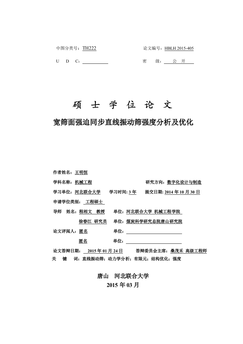 中图分类号:TH222论文编号:HBLH2015-405UD C:密级:公开硕士学位论文宽筛面强迫同步直线振动筛强度分析及优化作者姓名:王明恒学科名称:机械工程研究方向:数字化设计与制造学习单位:河北联合大学学习时间:3年提交日期:2014年10月30日申请学位类别:工程硕士导师姓名:程相文教授单位:河北联合大学机械工程学院徐春江研究员单位:煤炭科学研究总院唐山研究院单位:匿名单位:论文答辩日期:2015年01月24日答辩委员会主席:桑茂禾高级工程师关键词:直线振动筛:动力学分析:有限元:结构优化:强度唐山河北联合大学2015年03月The strength analysis and optimization of Wide-deckand constrained synchronizing straight line vibratingscreenDissertation Submitted toHebei United Universityin partial fulfillment of the requirementfor the degree ofMaster of EngineeringbyWang Mingheng(Mechanical Engineering)Professor Cheng XiangwenSupervisor:Xu ChunjiangMarch,2015独创性说明本人郑重声明:所呈交的论文是我个人在导师指导下进行的研究工作及取得的研究成果。尽我所知,除了文中特别加以标注和致谢的地方外,论文中不包含其他人已经发表或撰写的研究成果,也不包含为获得河北联合大学以外其他教育机构的学位或证书所使用过的材料。与我一同工作的同志对本研究所做的任何贡献均已在论文中做了明确的说明并表示了谢意。论文作者签名:日期:年月日关于论文使用授权的说明本人完全了解河北联合大学有关保留、使用学位论文的规定,即:己获学位的研究生必须按学校规定提交学位论文,学校有权保留、送交论文的复印件,允许论文被查阅和借阅:学校可以将学位论文的全部或部分内容采用影印、缩印或编入有关数据库进行公开、检索和交流。作者和导师同意论文公开及网上交流的时间:口自授予学位之日起年月日起作者签名:导师签名:签字日期:年月日签字日期:年月日