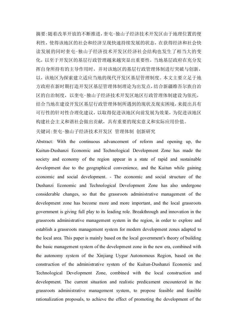 摘要:随着改革开放的不断推进,奎屯-独山子经济技术开发区由于地理位置的便利性,使得该地区的社会和经济呈现快速持续发展的状态,在获得经济和社会快读发展的同时奎屯-独山子经济技术开发区经济社会结构也发生了相当大的变化,以至于开发区的基层行政管理越来越突显出重要性,当地基层政府在充分发挥自身所持有的主导作用时,并对该地区的基层行政管理体制进行突破与创新,以,该地区为探索建立适应当地的现代开发区基层管理制度。本文主要立足于地方政府在新时期打造开发区基层管理体制理论为出发点,结合新疆维吾尔族自治区的自治制度,以奎屯-独山子经济技术开发区地区行政管理体制建设为依托,结合当地在建设开发区基层行政管理体制所遇到的现状及现实困境,来提出具有可行性的针对性合理化建议,以取得促进该地区向前发展为效果,为促进该地区构建社会主义和谐社会做出贡献,具有重要的现实意义和实际应用价值。关键词:奎屯-独山子经济技术开发区管理体制创新研究Abstract:With the continuous advancement of reform and opening up,theKuitun-Dushanzi Economic and Technological Development Zone has made thesociety and economy of the region appear in a state of rapid and sustainabledevelopment due to the geographical convenience,and the Kuitun while gainingeconomic and social development.-The economic and social structure of theDushanzi Economic and Technological Development Zone has also undergoneconsiderable changes,so that the grassroots administrative management of thedevelopment zone has become more and more important,and the local grassrootsgovernment is giving full play to its leading role.Breakthrough and innovation in thegrassroots administrative management system in the region,in order to explore andestablish a grassroots management system for modern development zones adapted tothe local area.This paper is mainly based on the local government's theory of buildingthe basic management system of the development zone in the new era,combined withthe autonomy system of the Xinjiang Uygur Autonomous Region,based on theconstruction of the administrative system of the Kuitun-Dushanzi Economic andTechnological Development Zone,combined with the local construction anddevelopment.The current situation and realistic predicament encountered in thegrassroots administrative management system,to propose feasible and feasiblerationalization proposals,to achieve the effect of promoting the development of theregion,and to contribute to the construction of a harmonious socialist society in theregion.Important practical significance and practical application value.Keywords:Kuitun-Dushanzi Economic and Technological Development ZoneManagement System Innovation Research目录第一章绪论.…1.1研究背景…1.2研究目的与意义….61.3文献综述1.3.1国内文献综述1.3.2国外研究综述.1.4研究思路与研究方法.91.4.1研究思路.91.4.2研究方法.….9第一章相关概念和理论基础,2.1概念2.1.1开发区概念界定2.1.2管理体制概念界定.102.2理论基础…2.3开发区相关理论基础2.3.1增长极理论.112.3.2新公共管理理论.…122.3.3多中心治理理论..132.3.4社会基本矛盾理论.第三章奎屯-独山子经济技术开发区管理体制现状.…3.1奎屯-独山子经济技术开发区发展现状153.2奎屯-独山子经济技术开发区管理体制现状…3.2.1建国初期的奎屯-独山子经济技术开发区管理体制现状..163.2.2改革开放的奎屯-独山子经济技术开发区管理体制现状.…163.2.3转型时期的奎屯-独山子经济技术开发区管理体制现状16第四章奎屯-独山子经济技术开发区管理体制存在的问题.174.1奎屯-独山子经济技术开发区管理体制存在的问题.174.1.1基层选举存在不规范现象.