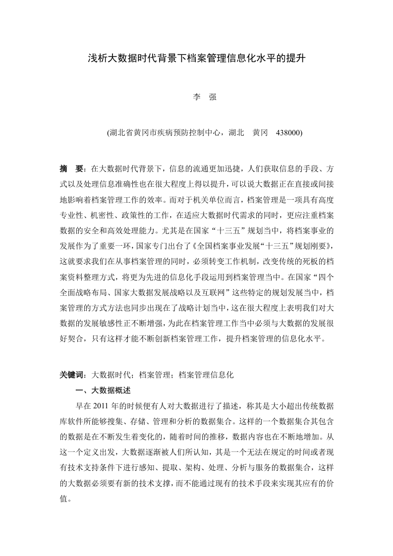 浅析大数据时代背景下档案管理信息化水平的提升李强(湖北省黄冈市疾病预防控制中心,湖北黄冈438000)摘要:在大数据时代背景下,信息的流通更加迅捷,人们获取信息的手段、方式以及处理信息准确性也在很大程度上得以提升,可以说大数据正在直接或间接地影响着档案管理工作的效率。而对于机关单位而言,档案管理是一项具有高度专业性、机密性、政策性的工作,在适应大数据时代需求的同时,更应注重档案数据的安全和高效处理能力。尤其是在国家“十三五”规划当中,将档案事业的发展作为了重要一环,国家专门出台了《全国档案事业发展“十三五”规划刚要》,这就要求我们在从事档案管理的同时,必须转变工作机制,改变传统的死板的档案资料整理方式,将更为先进的信息化手段运用到档案管理当中。在国家“四个全面战略布局、国家大数据发展战略以及互联网”这些特定的规划发展当中,档案管理的方式方法也同步出现在了战略计划当中,这在很大程度上表明我们对大数据的发展敏感性正不断增强,为此在档案管理工作当中必须与大数据的发展很好契合,只有这样才能不断创新档案管理工作,提升档案管理的信息化水平。关键词:大数据时代:档案管理:档案管理信息化一、大数据概述早在2011年的时候便有人对大数据进行了描述,称其是大小超出传统数据库软件所能够搜集、存储、管理和分析的数据集合。这样的一个数据集合其包含的数据是在不断发生着变化的,随着时间的推移,数据内容也在不断地增加。从这一个定义出发,大数据逐渐被人们所认知,其是一个无法在规定的时间或者现有技术支持条件下进行感知、提取、架构、处理、分析与服务的数据集合,这样的大数据必须要有新的技术支撑,而不能通过现有的技术手段来实现其应有的价值。随着计算机技术与社会生活的高度融合,信息数据的积累进入到一个新的变革阶段,大数据以一种全新的方式,通过对海量的数据进行分析,从中获取对人们最具价值的产品与服务。由此可见,大数据不但可以在一定程度上转变成具有经济价值的技术,同时还可以对当今世界的各个领域起到重要的影响。而对于档案管理工作来说,其本身就是对档案信息数据进行收集、整理和处理的过程,因而受到大数据的影响更加明显。面对这样一种形式,充分发挥大数据在档案管理工作当中的作用成为了当前人们所关注的话题,更是档案管理工作目前所面临的重要挑战。二、大数据对档案管理工作带来的影响1.档案信息的存储方式发生了新的变化传统档案信息的管理主要由人工来对众多纸质的档案材料进行整理与加工,并对相应的档案资料进行归类整理。这样的档案管理方式在当下已经不能够适应社会发展所需,电子化档案信息管理方式逐渐从辅助手段转变为常态化的档案管理模式,这足以表明档案管理的信息化发展已经成为未来发展的主要趋势,通过先进的理念来改变传统的档案管理方式,建设新型的数字化档案管理模式已经成为社会发展的必然,下大数据的推动下,档案信息的存储正由传统的纸质档案信息逐渐朝着电子化档案的方向转变。2.档案信息的管理途径正与大数据联合档案信息的管理一直以来都是业内所关注的重点,不论是档案管理的发展意义还是未来发展的规划目标,对档案信息进行管理均占有重要的地位。而在实际工作当中,档案信息管理虽然备受人们关注但并没有充分发挥出其应有的功用,诸多管理者仅仅是对一些表面的文件、信函、个人信息等进行泛泛的整理与归档,并不能发挥出档案管理的真是效能。而在国家出台的“十三五”规划当中,则对档案管理工作提出了更高的要求,在管理档案信息的时候必须要有文件的归档安排,这就要求在档案管理工作当中对电子信息档案的管理要更加重视。而在大数据时代背景之下,给档案信息的管理工作提出了严峻的考验,从事档案管理工作的人员不再面对眼前的那一小部分档案信息资料,更要放眼到整个档案信息数据,这无疑是将众多的档案信息汇聚到了一起,形成一个大的档案数据信息集合,而要想对这样的一个庞大数据库进行管理,必须要打破传统的思维禁锢,用发展的眼光看待档案信息管理的全新变化,唯有如此才能真正管理好档案信息。3档案信息管理更加数据化、智能化、多样化从当前档案管理工作的现状来看,在很大程度上依然停留在传统的“实际运用”层面,也即是在需要的时候对档案信息进行查阅,很少有对各类档案信息进行深入加工、综合分析的过程。在大数据背景之下,档案信息的管理不再停留在传统的层面上,各种不同类型的档案信息相继出现,导致了档案载体逐渐演变成了数字化的方式陈列,而不再是文本或图像等传统信息资料。在对这些数据化的档案信息进行处理的时候,必须要借助于现代化的信息手段来进行,而这些档案在服务于社会的过程中也更加具有个性化,凸显了其智慧型的特征。正如当前全国各地在推行建设的“智慧城市”,将与城市相关的所有数据信息集中到一起,使其成为一个大的数据集,再通过对这些数据信息的处理与分析使其更好地为社会提供智能化的服务。在不但转变了传统档案的查阅功能,更是发挥出了档案信息的内部发展与外部延伸,通过对档案信息的分析与加工,不断拓展其使用的价值,使其为社会经
